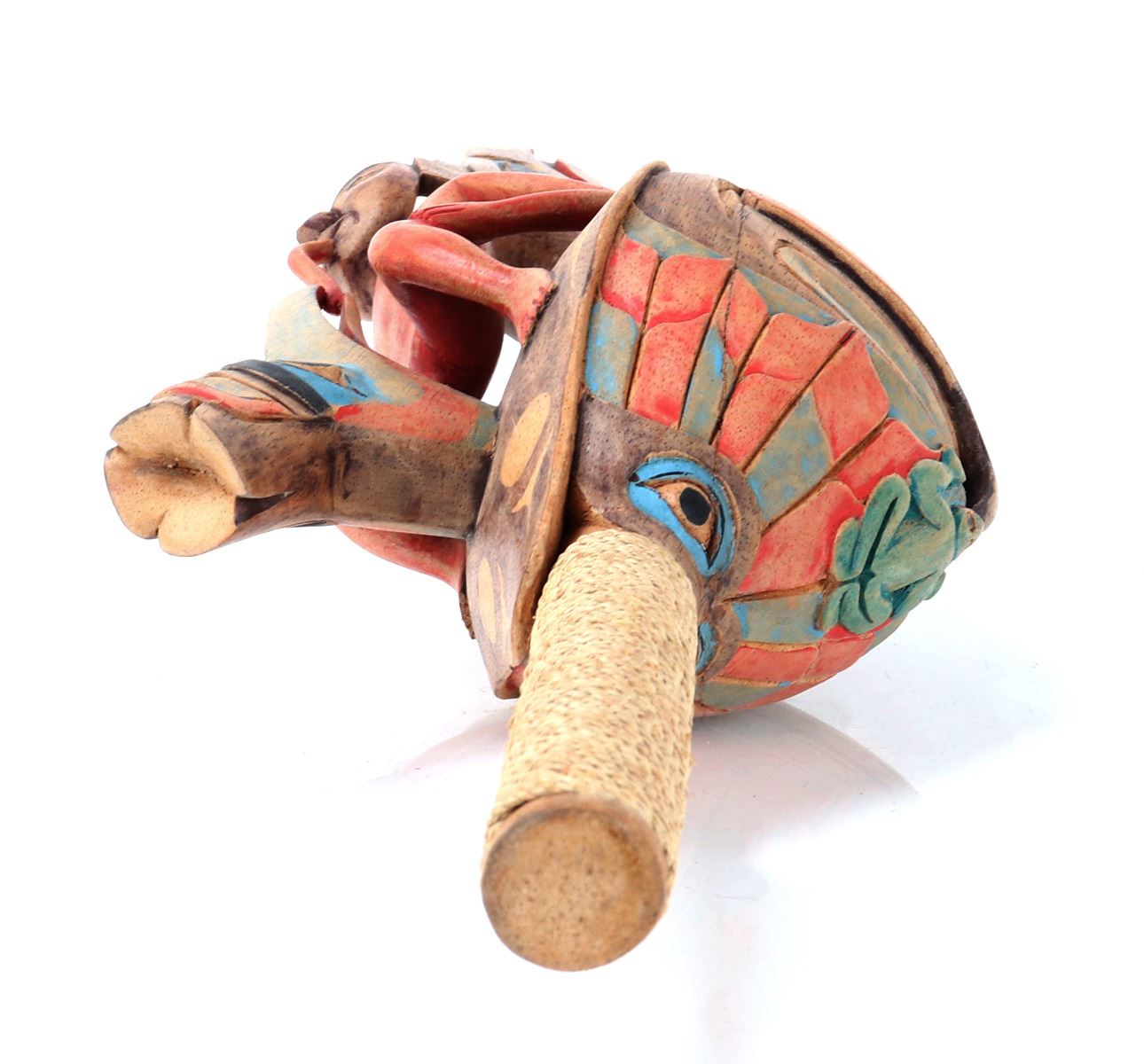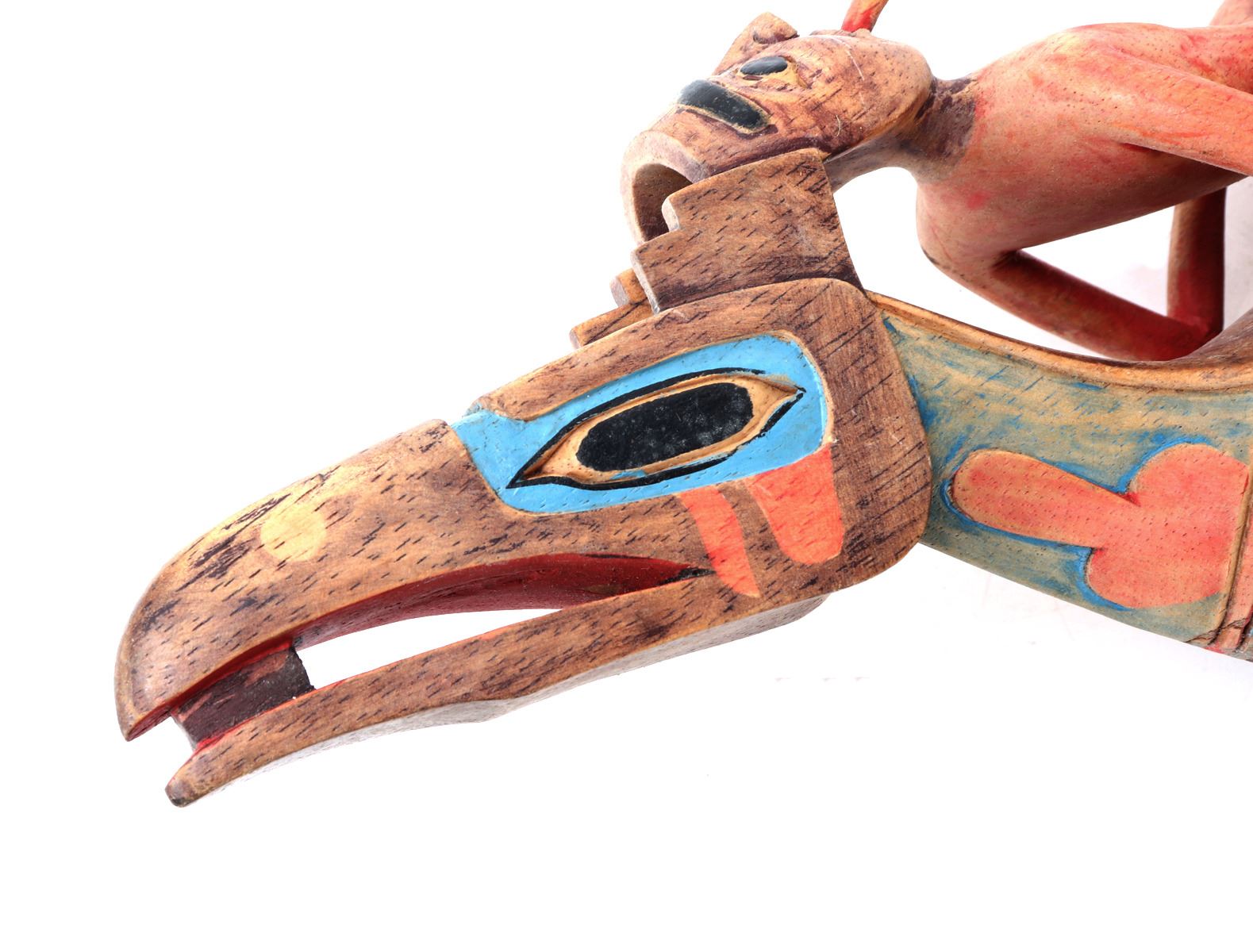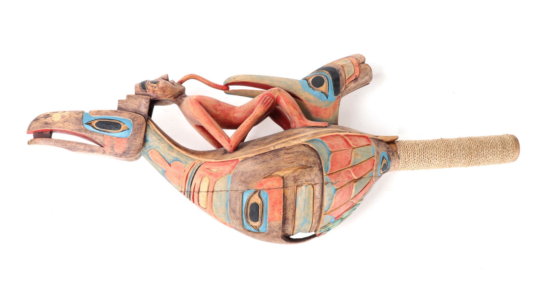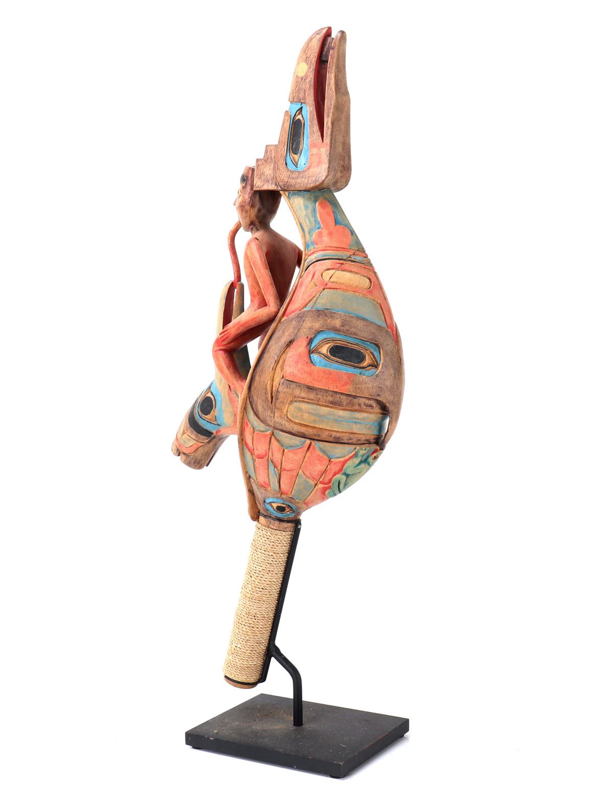 Handsome wood carved ceremonial rattle from Pacific Northwest, Haida. Relaxed man on a bird with an oystercatcher seemingly being fed by the oystercatcher. Well wrapped handle in a tight twisted fiber, a birds mouth eats at the handle. Painted all over in orange, red, blue, green and yellow pigment throughout. Size 16" L x 4" W x 4" H, weight 280g, custom stand included.. Condition: Overall good condition with minor pigment losses.