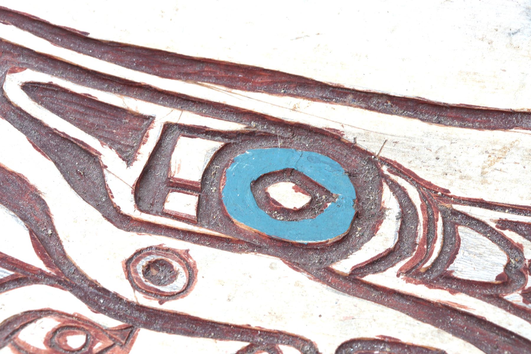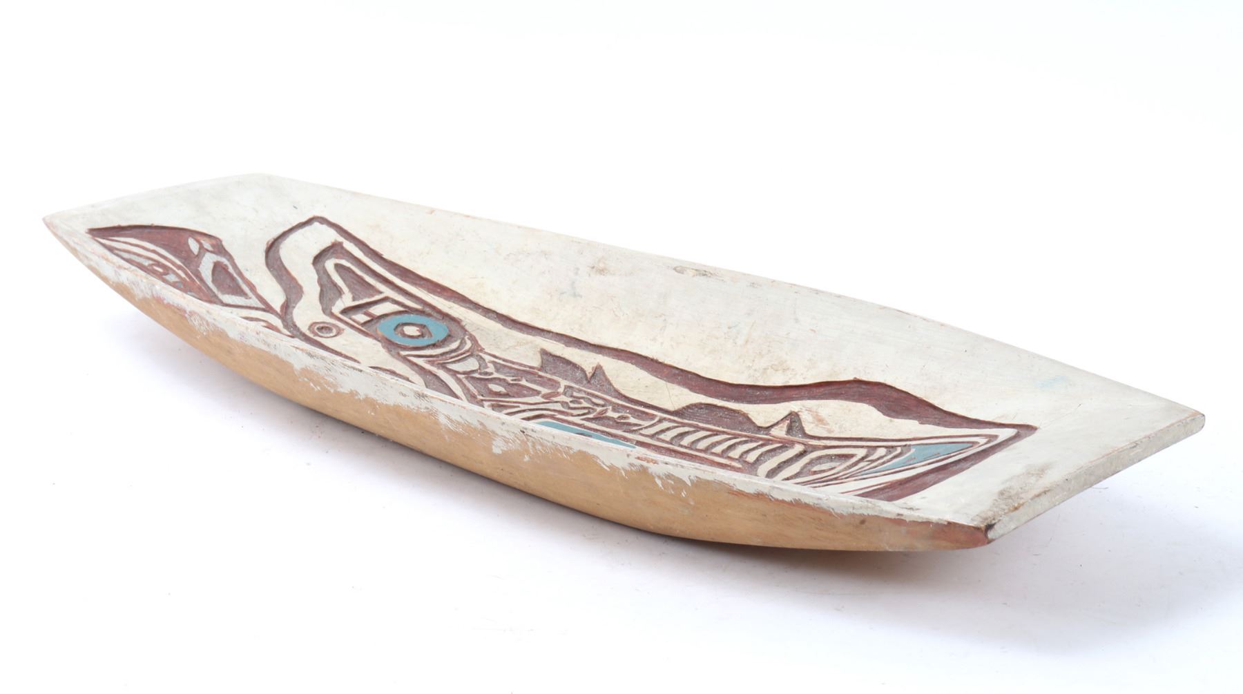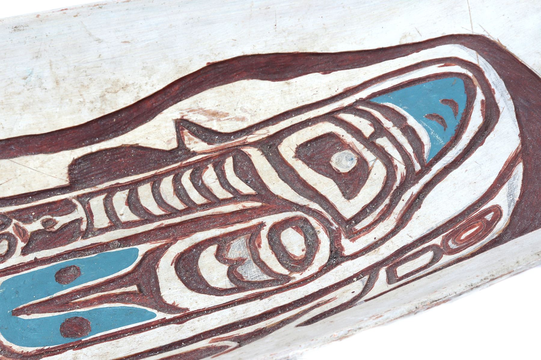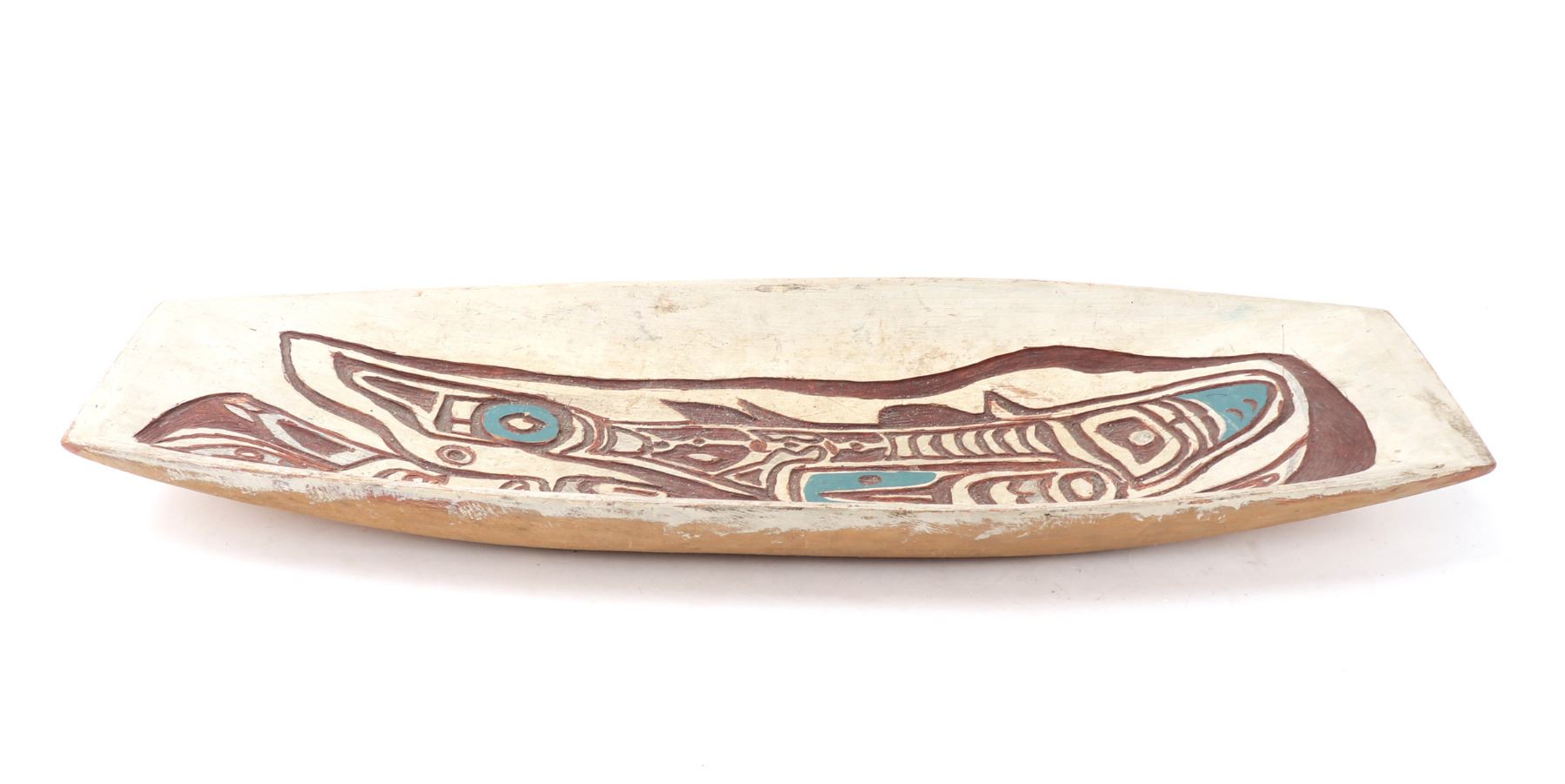 Haida wood carved platter or offering bowl, distinctive form line style, characterized by flowing lines, ovoid shapes. Intricately carved bowl features traditional motifs with distinct turquoise and maroon details, highlighting the zoo morphic or canine figure. Size 30" L x 10" W x 3" H, weight 1595g. Condition: Well overall condition throughout.