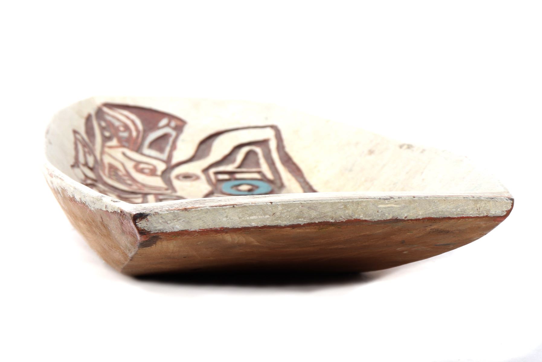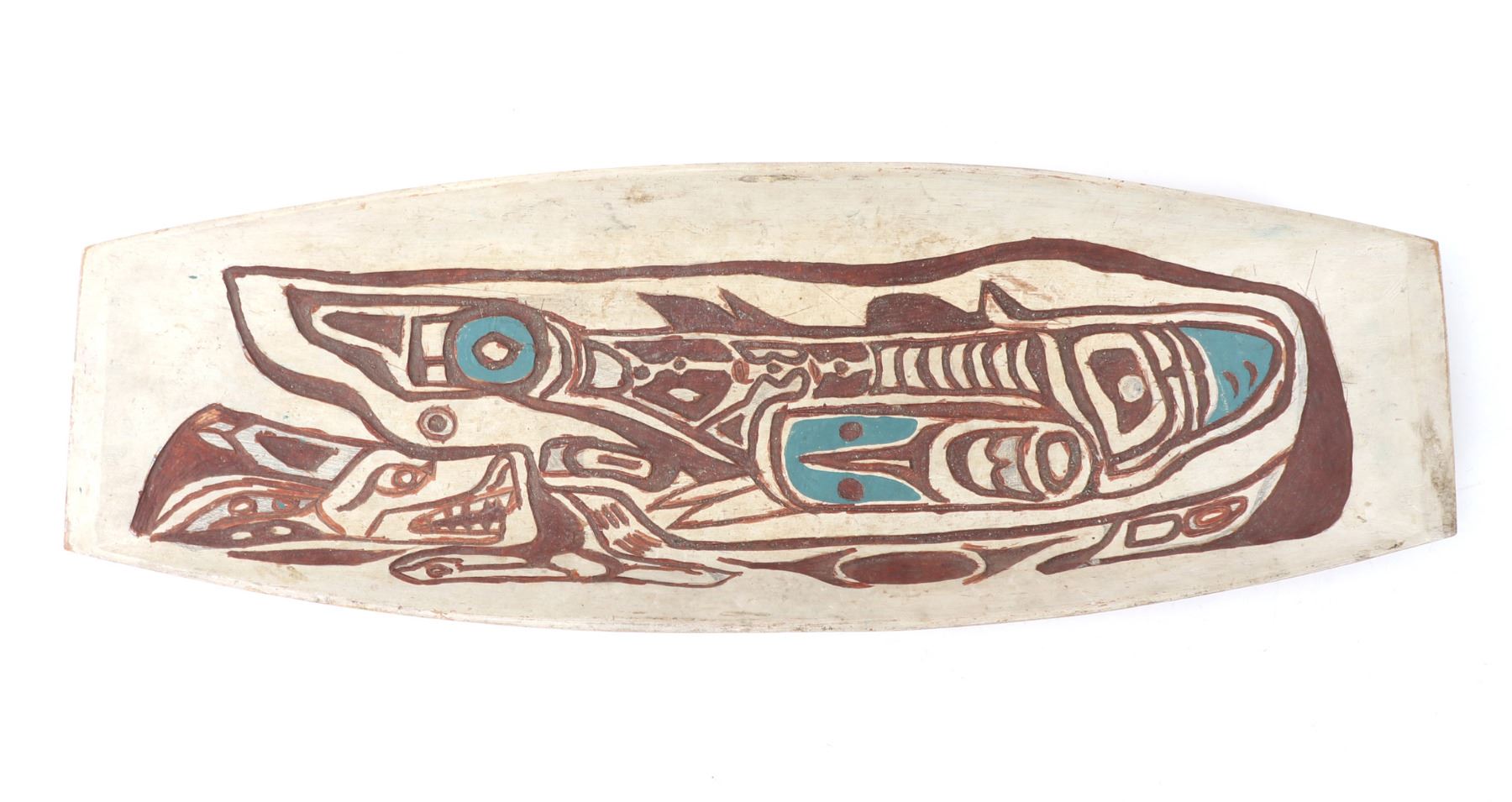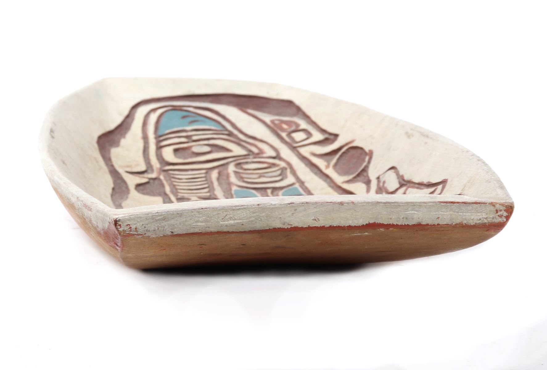 Haida wood carved platter or offering bowl, distinctive form line style, characterized by flowing lines, ovoid shapes. Intricately carved bowl features traditional motifs with distinct turquoise and maroon details, highlighting the zoo morphic or canine figure. Size 30" L x 10" W x 3" H, weight 1595g. Condition: Well overall condition throughout.