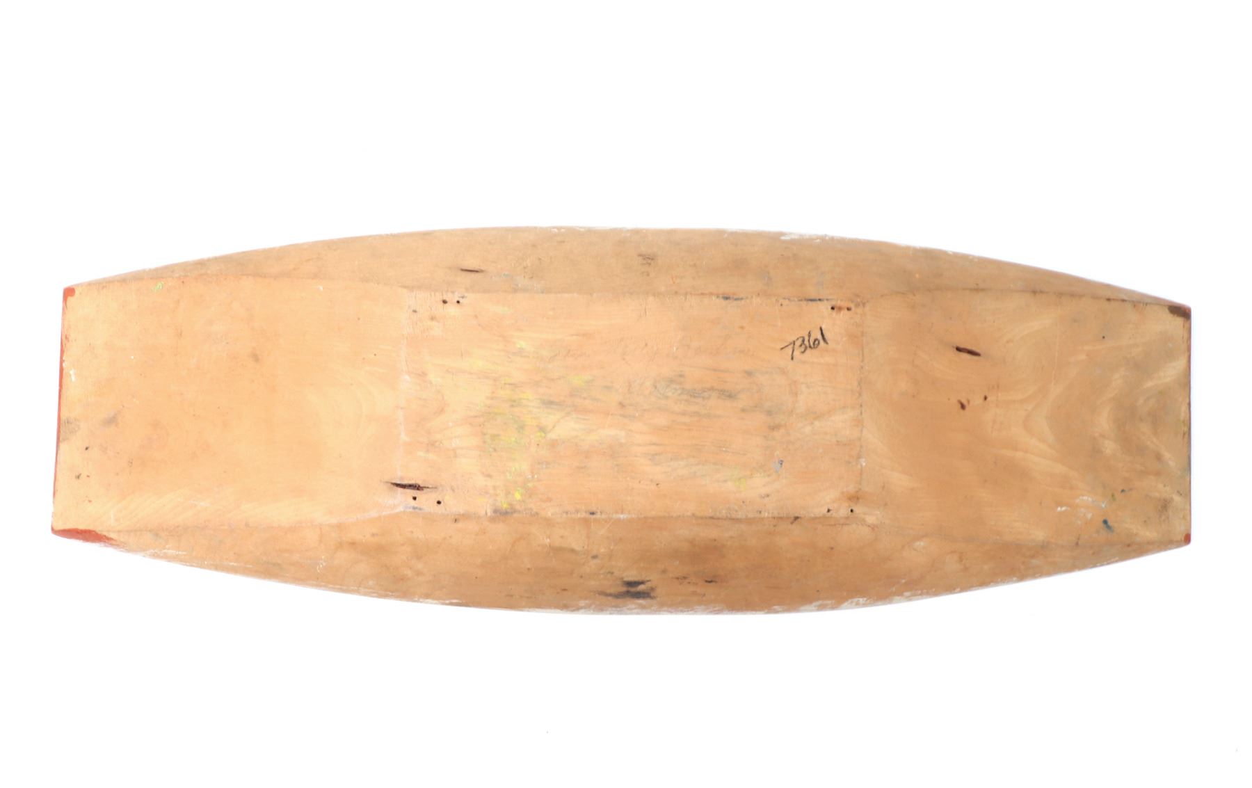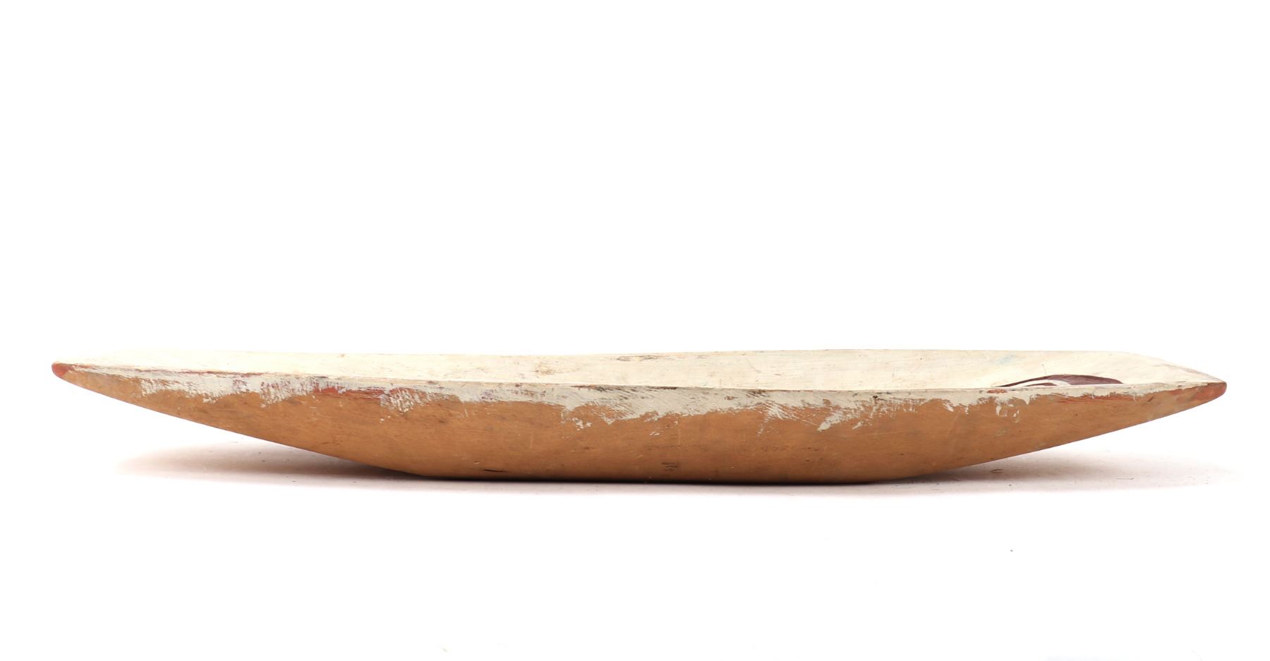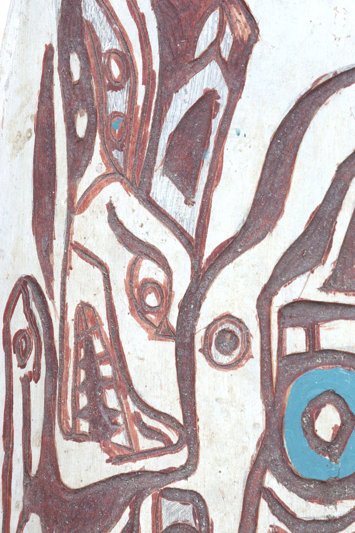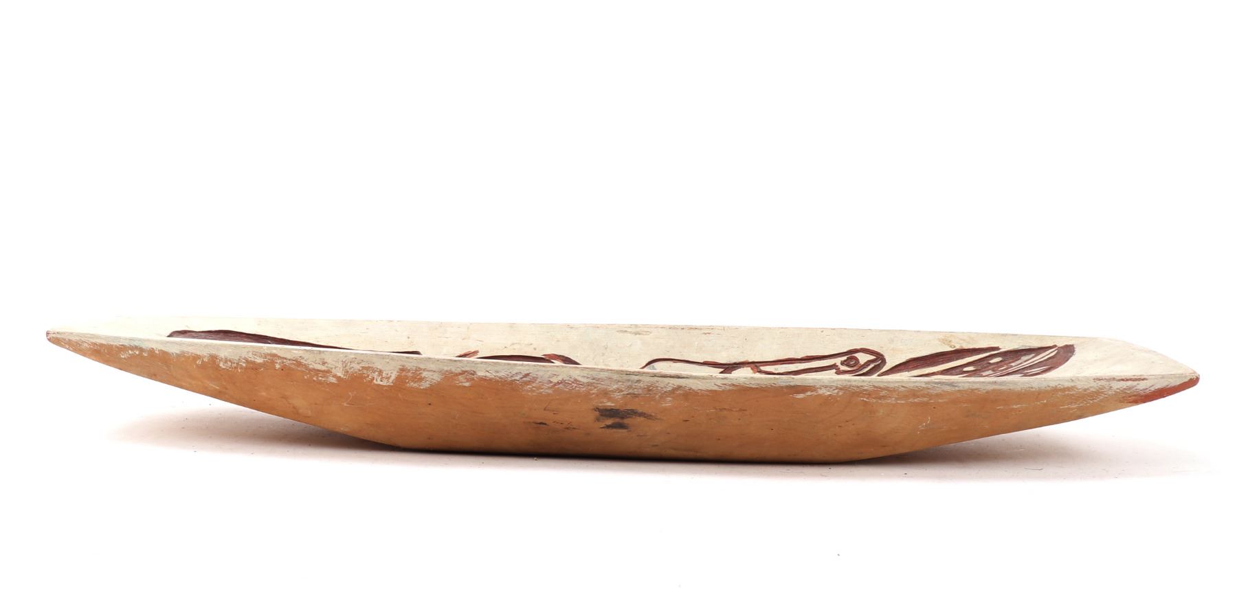 Haida wood carved platter or offering bowl, distinctive form line style, characterized by flowing lines, ovoid shapes. Intricately carved bowl features traditional motifs with distinct turquoise and maroon details, highlighting the zoo morphic or canine figure. Size 30" L x 10" W x 3" H, weight 1595g. Condition: Well overall condition throughout.