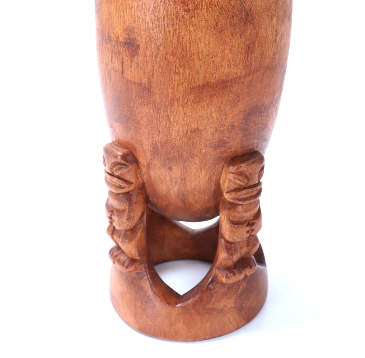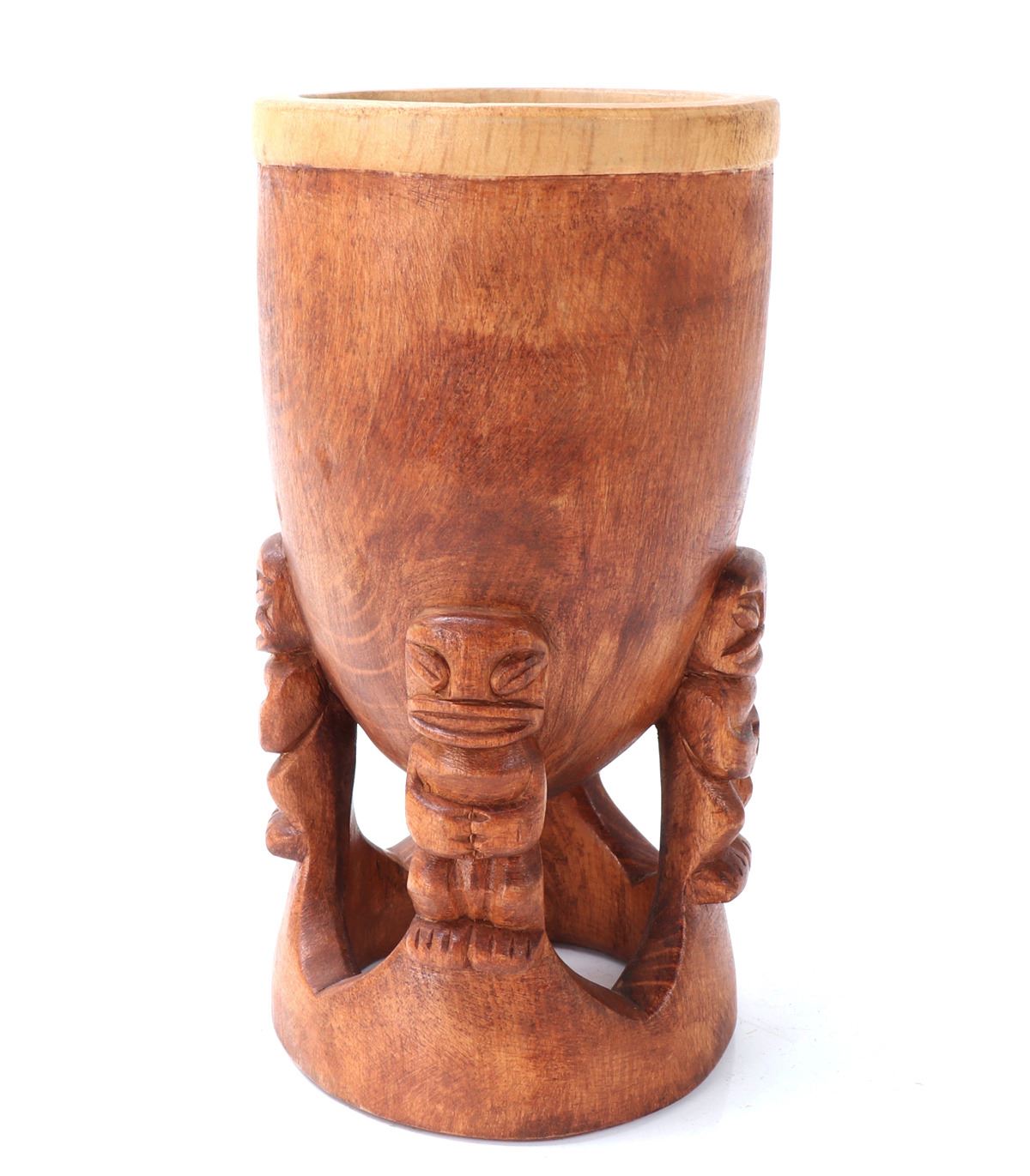 Beautiful and rare hand carved Tahitian tiki bowl with three figures acting as holders of the bowl with a pedestal base. The wood is stained on the to the outside lower half with a bare raw section of wood around the rim. Size 6 1/2" L x 4" W x 4" H, weight 220g. Condition: Good overall condition.