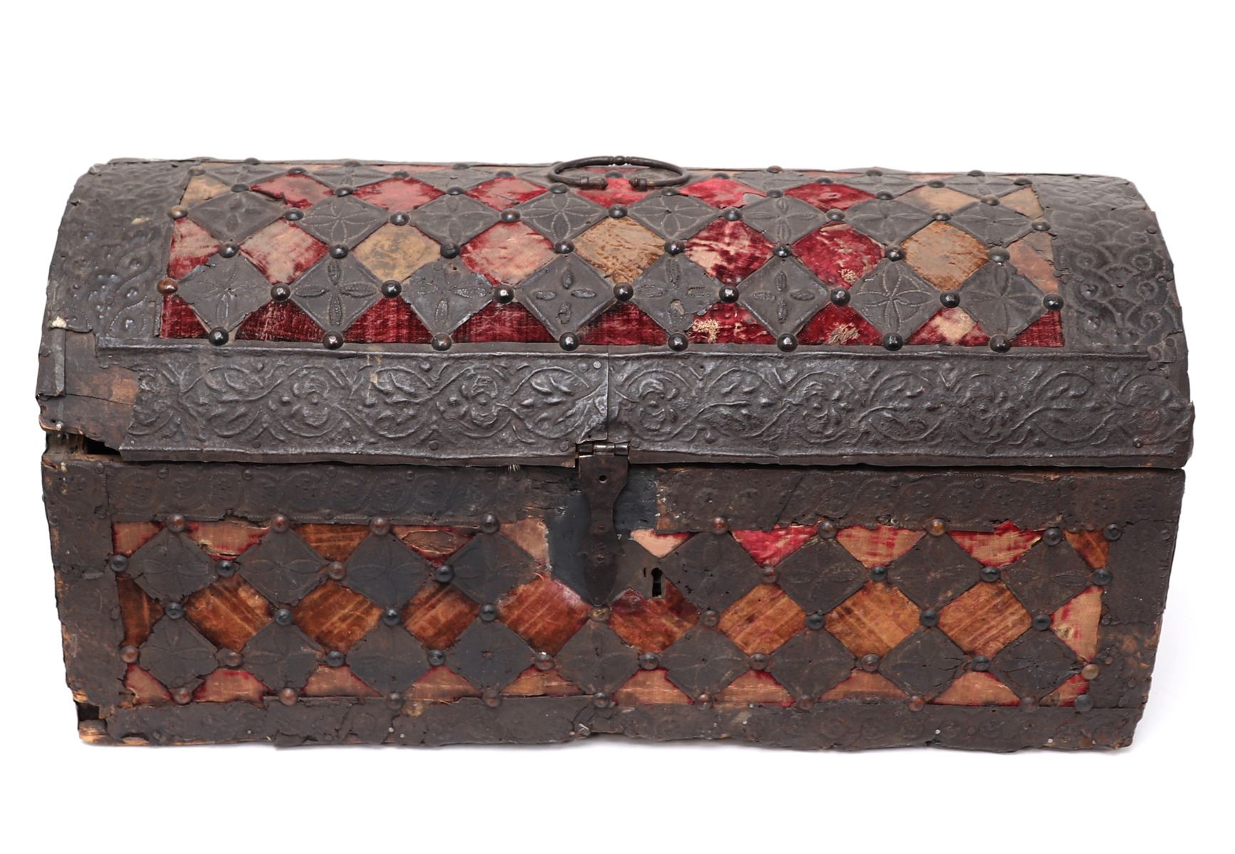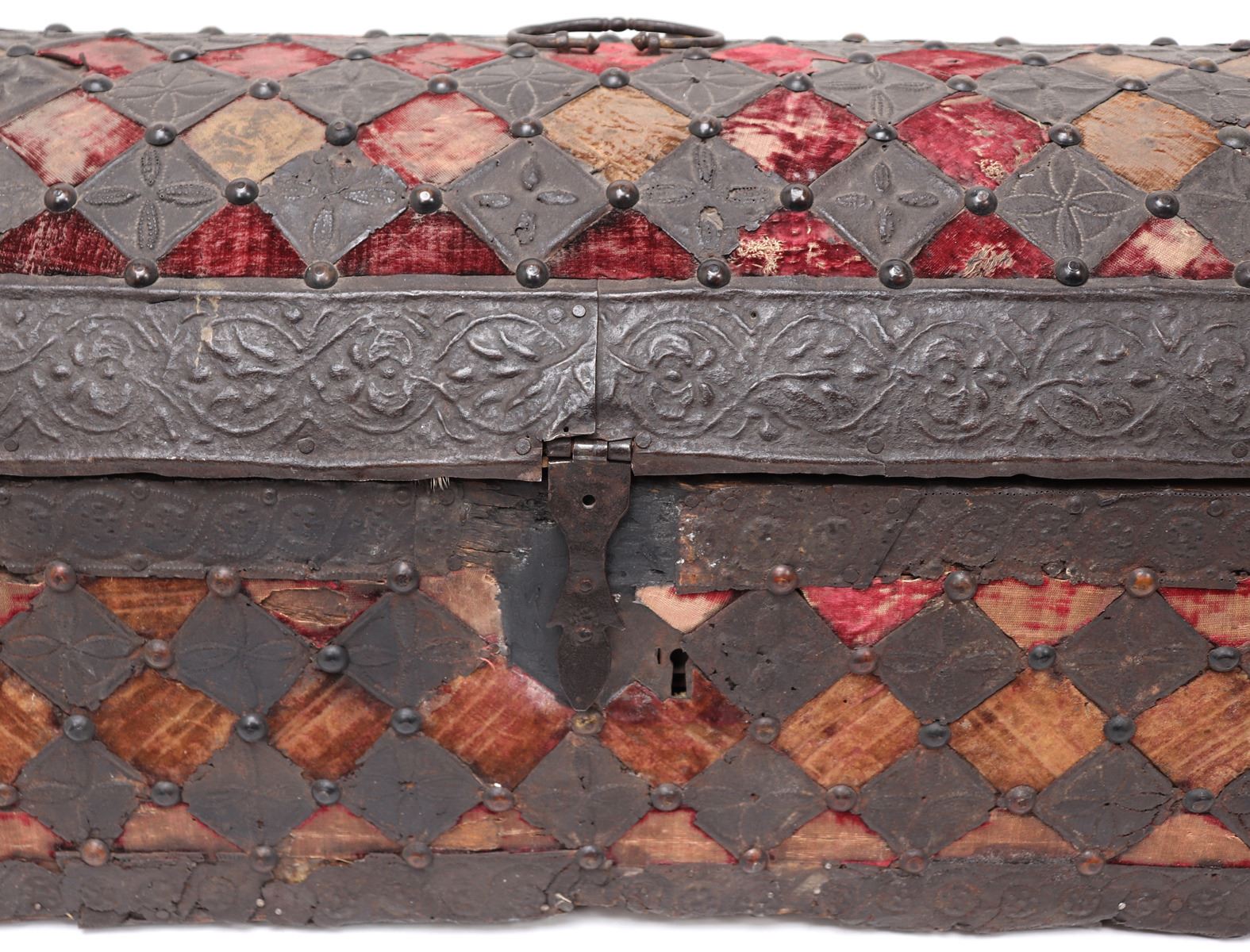 Europe, Italy, Venice, 16th century. Embossed panels over wood and velvet casket. Finely constructed from a light wood, lid covered in velvet. Beautifully embossed panels with floral details throughout, each panel would have been hammered individually by hand and in this case reveals incredible craftmanship and attention to detail. Small caskets such as this piece were given to brides as betrothal or wedding gifts to store jewelry and other mementos. Size 23" W x 10 1/4" L x 11 1/4" H. Condition: Losses throughout as shown from age and use. Would originally have had a key that is since lost.. Provenance: Ex-Private USA Collection, European Collection Prior
