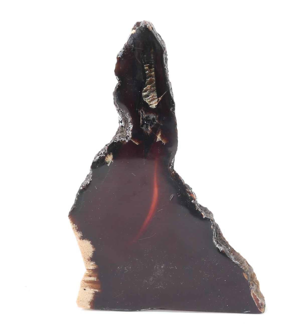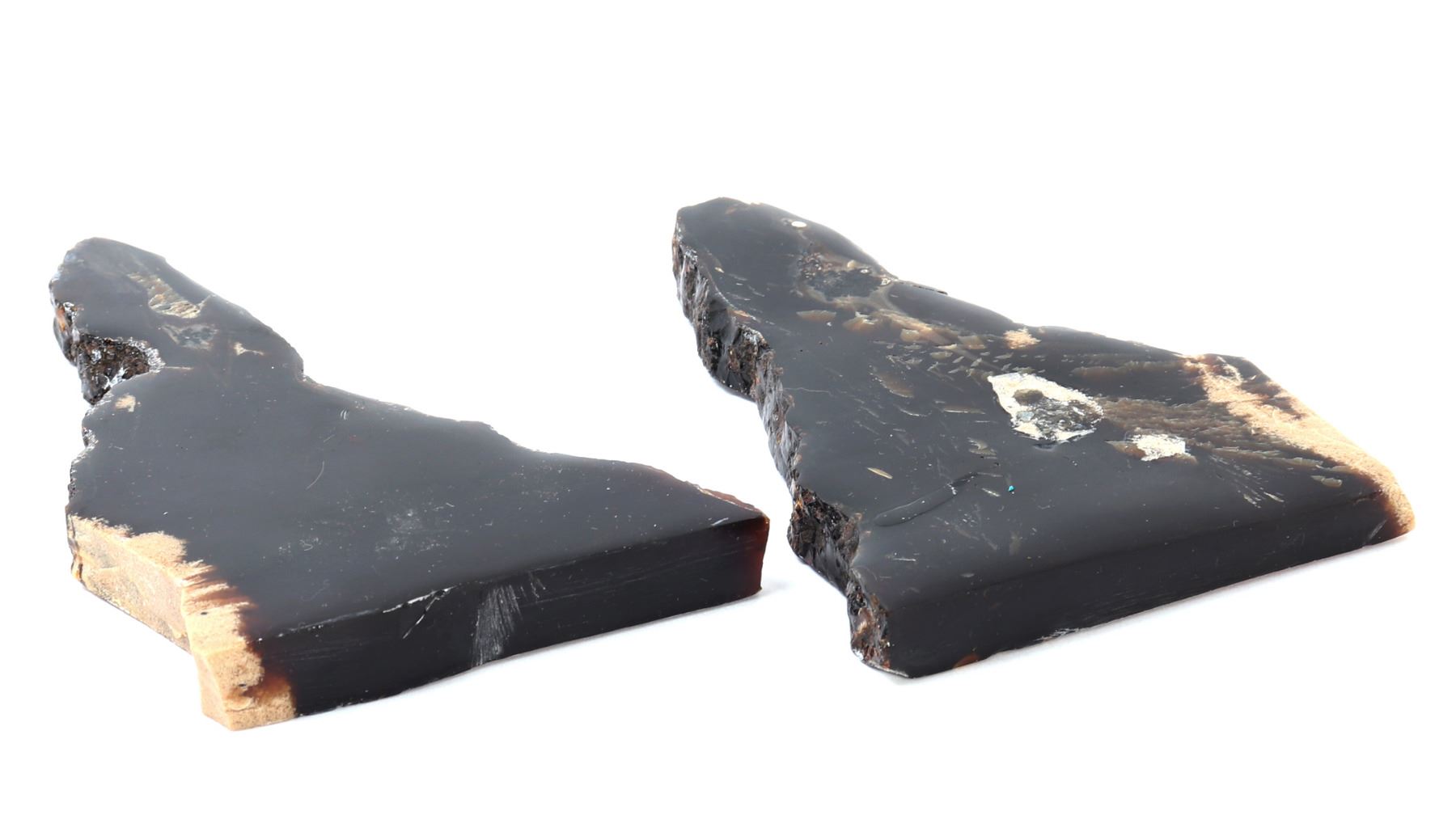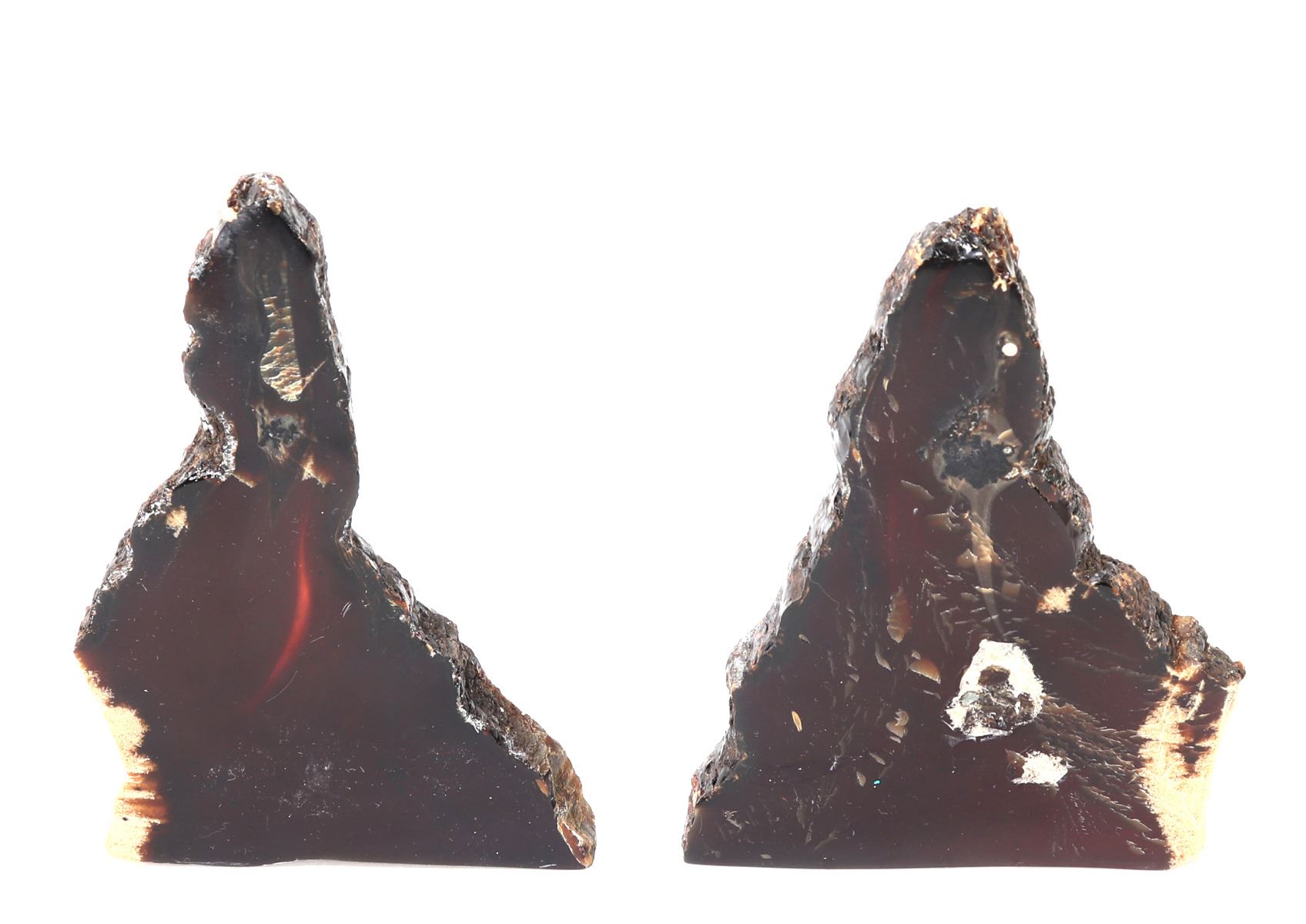 Wonderful set of amber slabs, polished smooth with raw edges. Translucent with warm amber red and orange coloring throughout, natural crystallizations in a light tan white coloring. Size of tallest piece 6 1/8" H, weight 157 g. Condition: Well preserved overall condition throughout.