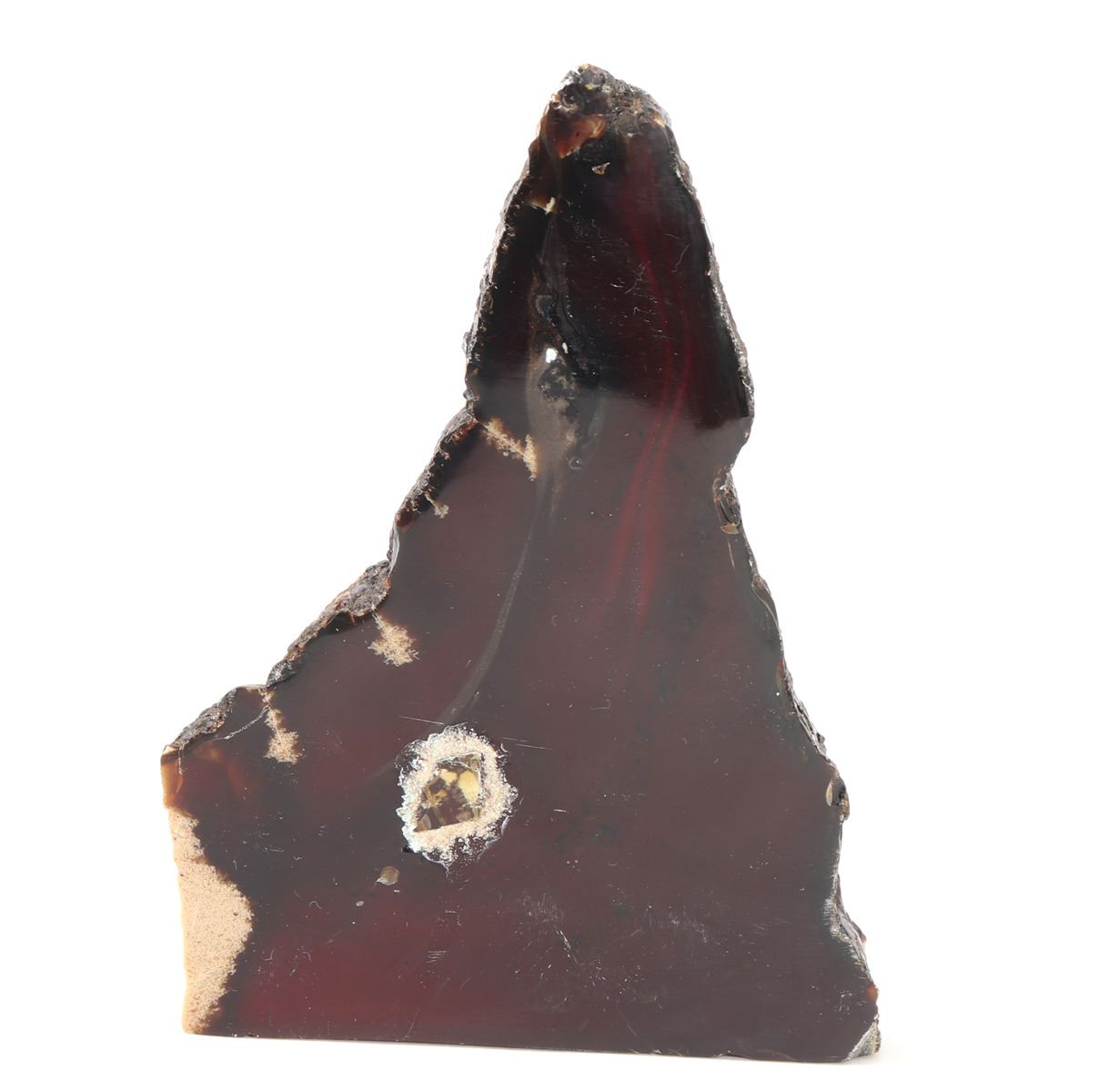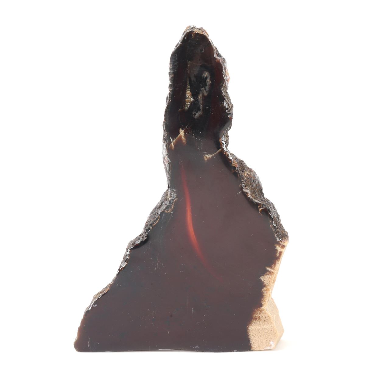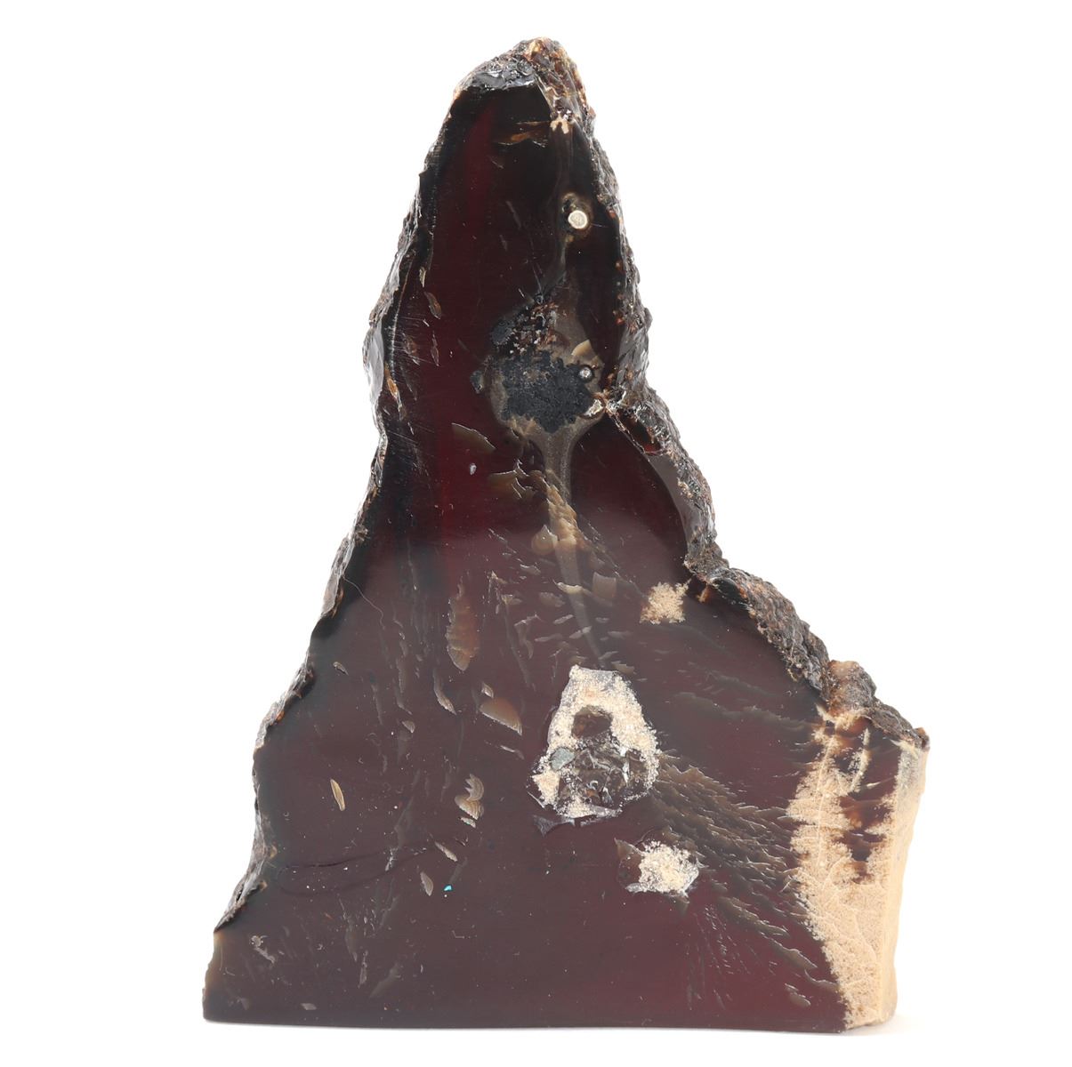 Wonderful set of amber slabs, polished smooth with raw edges. Translucent with warm amber red and orange coloring throughout, natural crystallizations in a light tan white coloring. Size of tallest piece 6 1/8" H, weight 157 g. Condition: Well preserved overall condition throughout.
