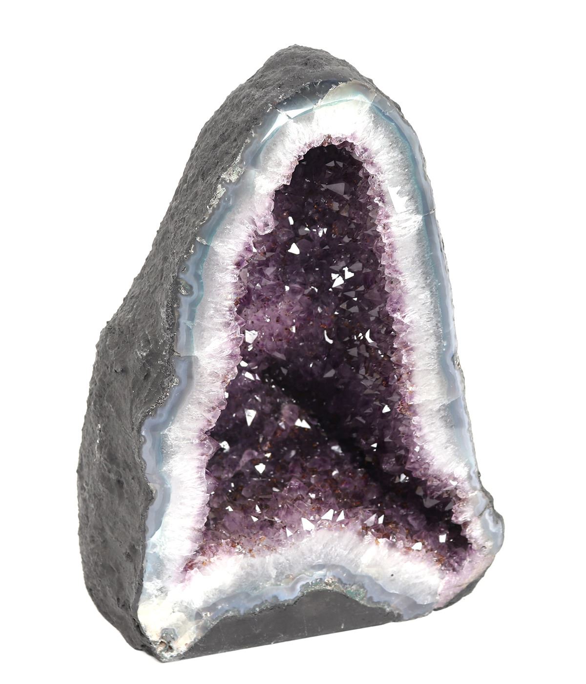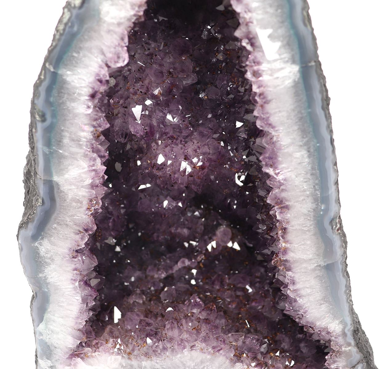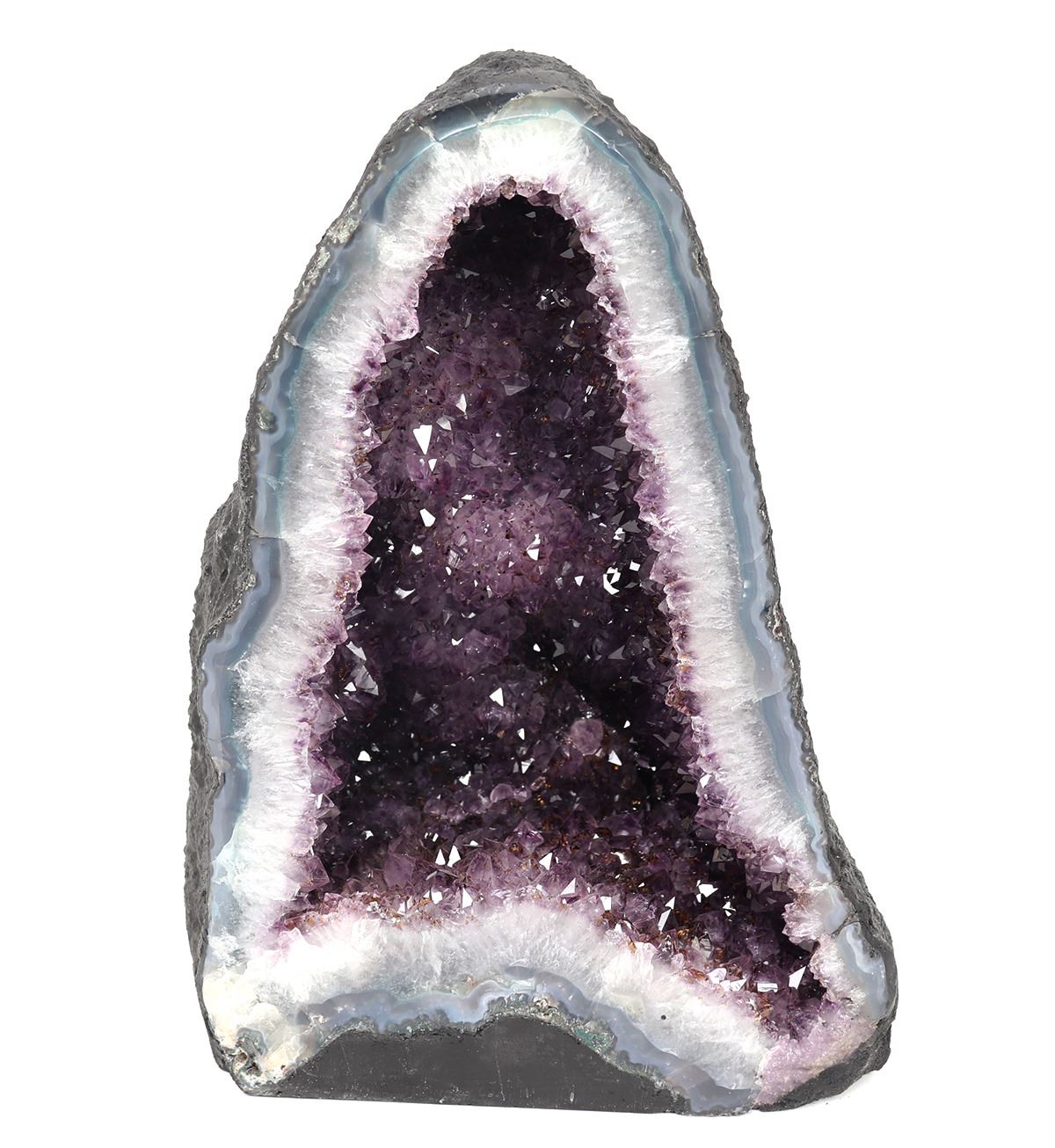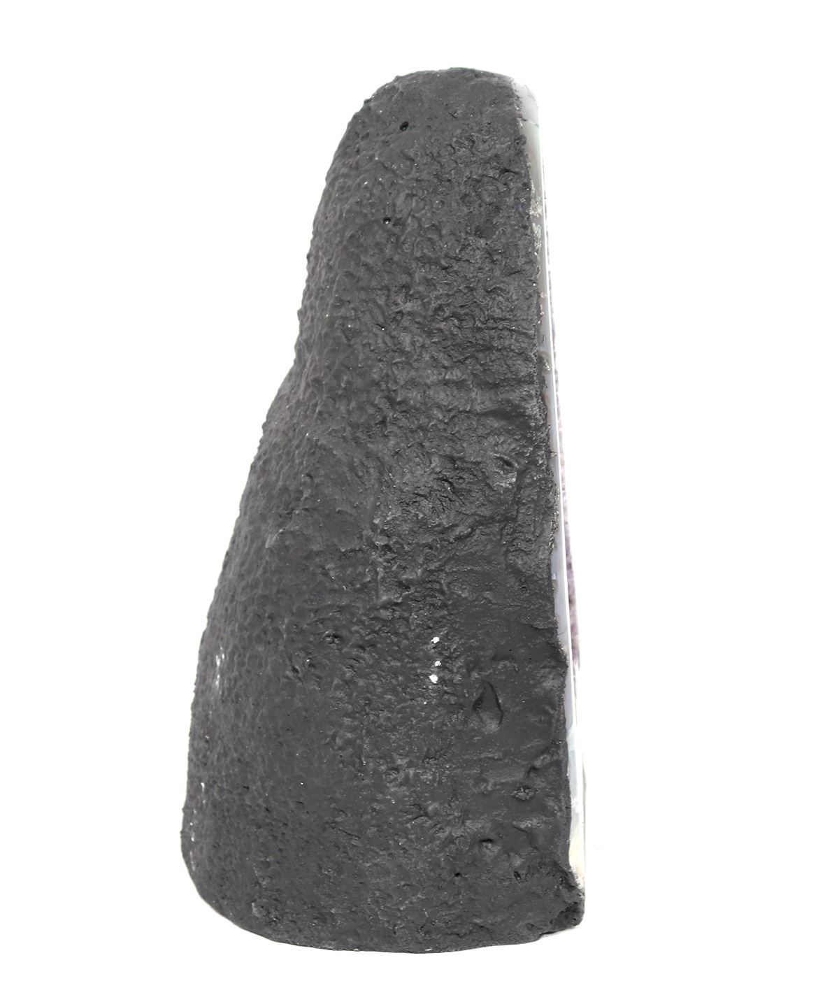 Half geode cathedral features lustrous fully terminated crystals with highly reflective faces and a deep, transparent to translucent grape color. Meditating with Amethyst brings a serene energy and enhances intuitive abilities. Size 13 3/4" H x 9 7/8" W. Condition: Wonderful condition throughout.