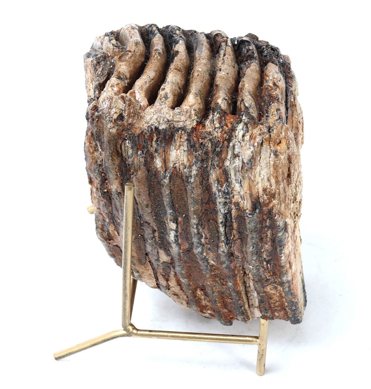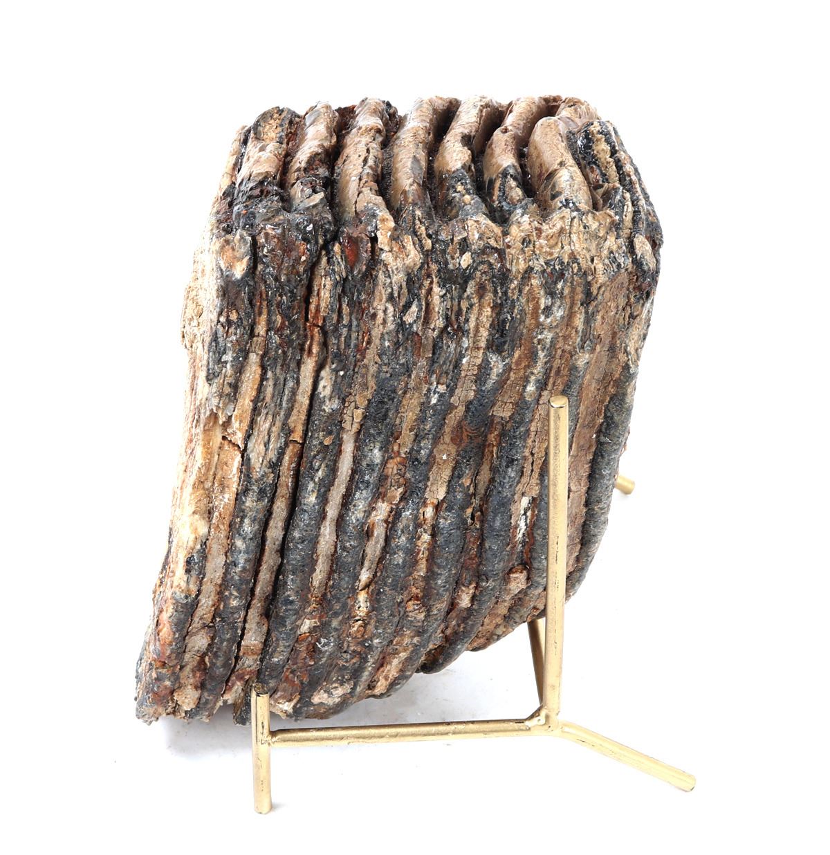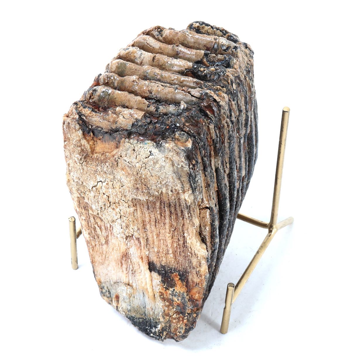 Circa 10,000–100,000 years ago. Distinguished by its substantial size and excellent structural integrity, this fossilized tooth exhibits the classic ridged grinding surfaces characteristic of mammoths, used to chew tough vegetation such as grasses and sedges. Size 6" L, Weight 4.4 lb., stand included.. Condition: Well preserved overall condition.