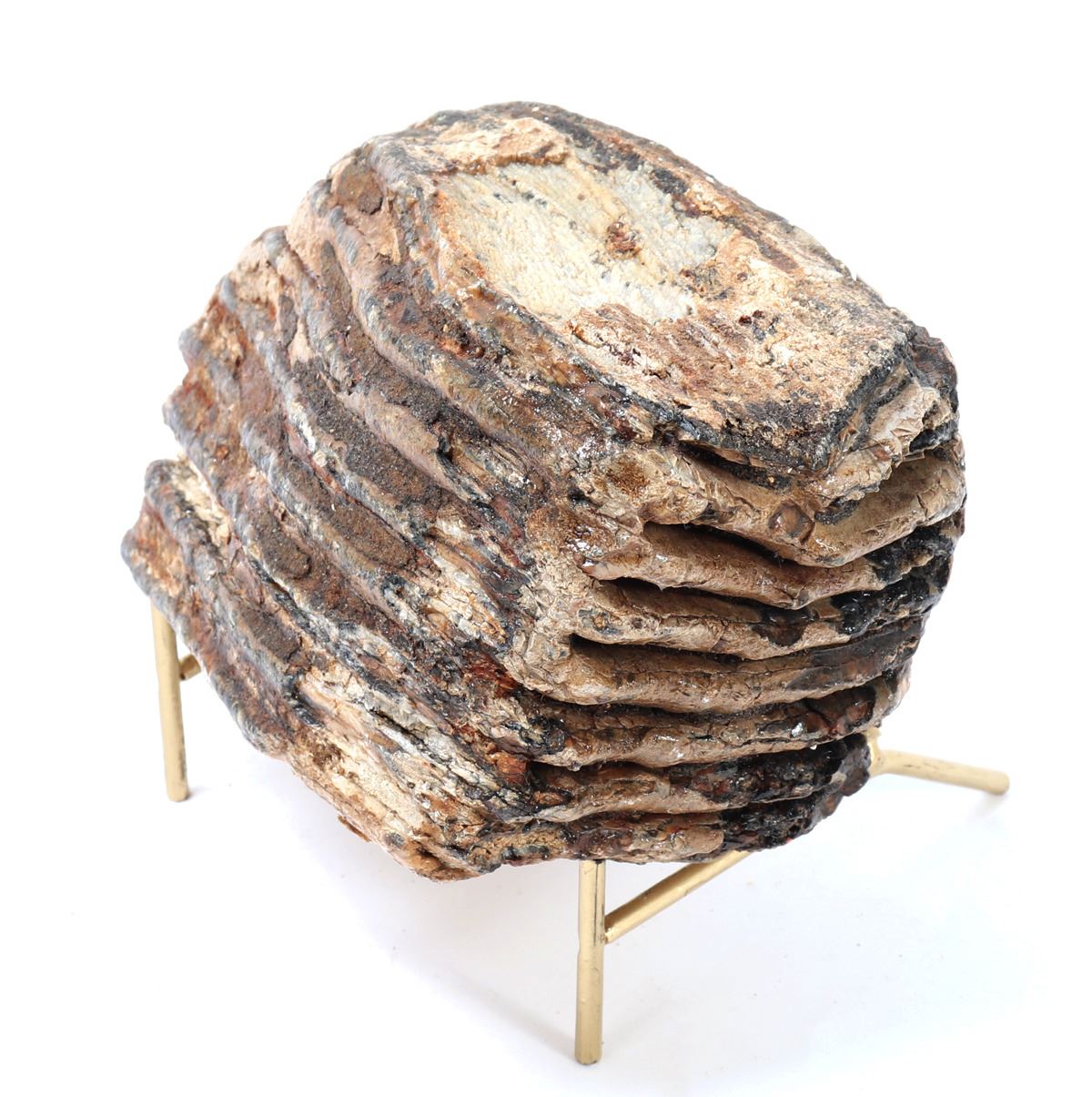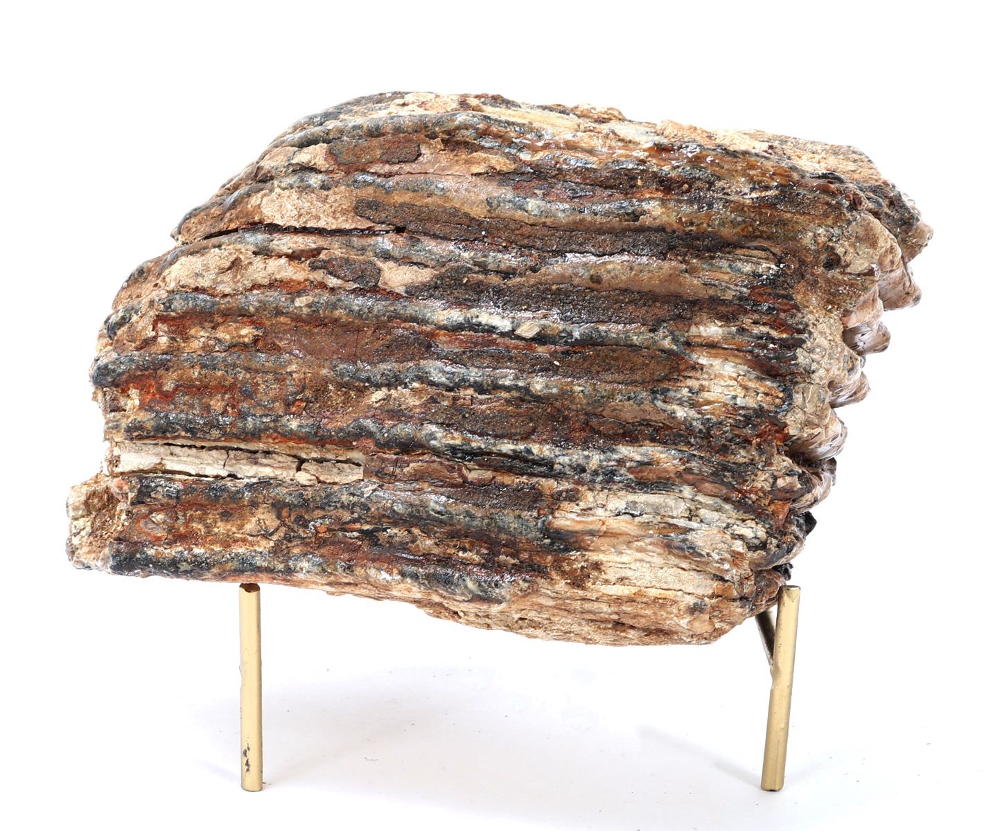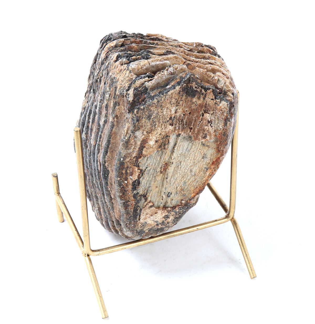 Circa 10,000–100,000 years ago. Distinguished by its substantial size and excellent structural integrity, this fossilized tooth exhibits the classic ridged grinding surfaces characteristic of mammoths, used to chew tough vegetation such as grasses and sedges. Size 6" L, Weight 4.4 lb., stand included.. Condition: Well preserved overall condition.