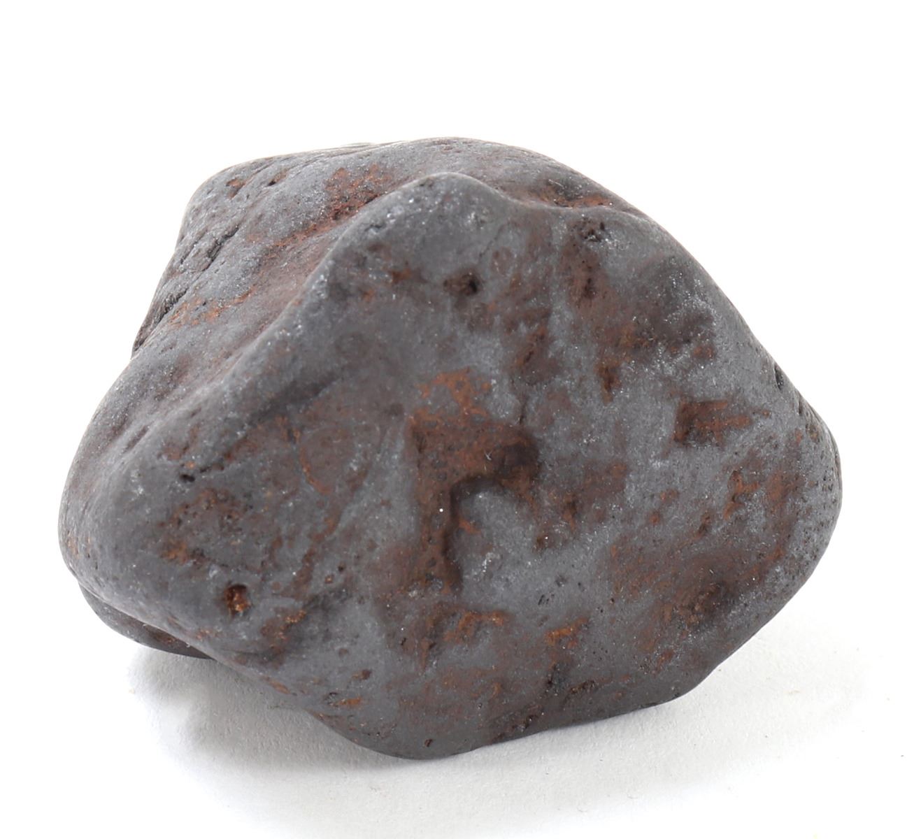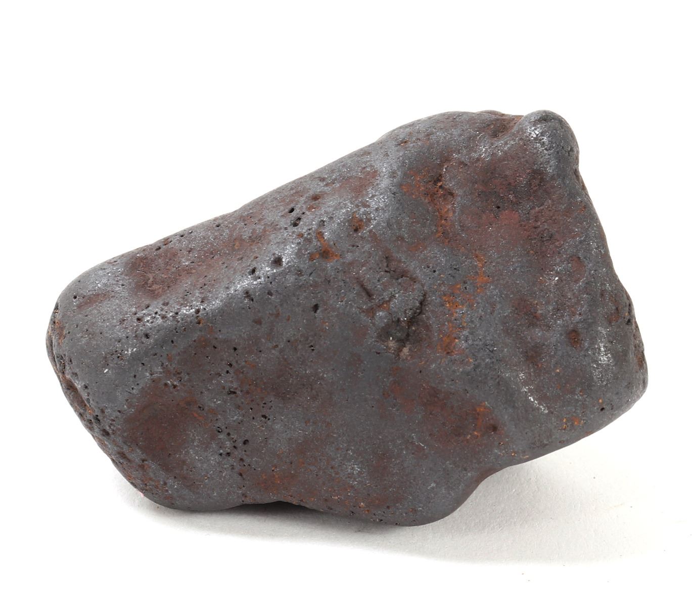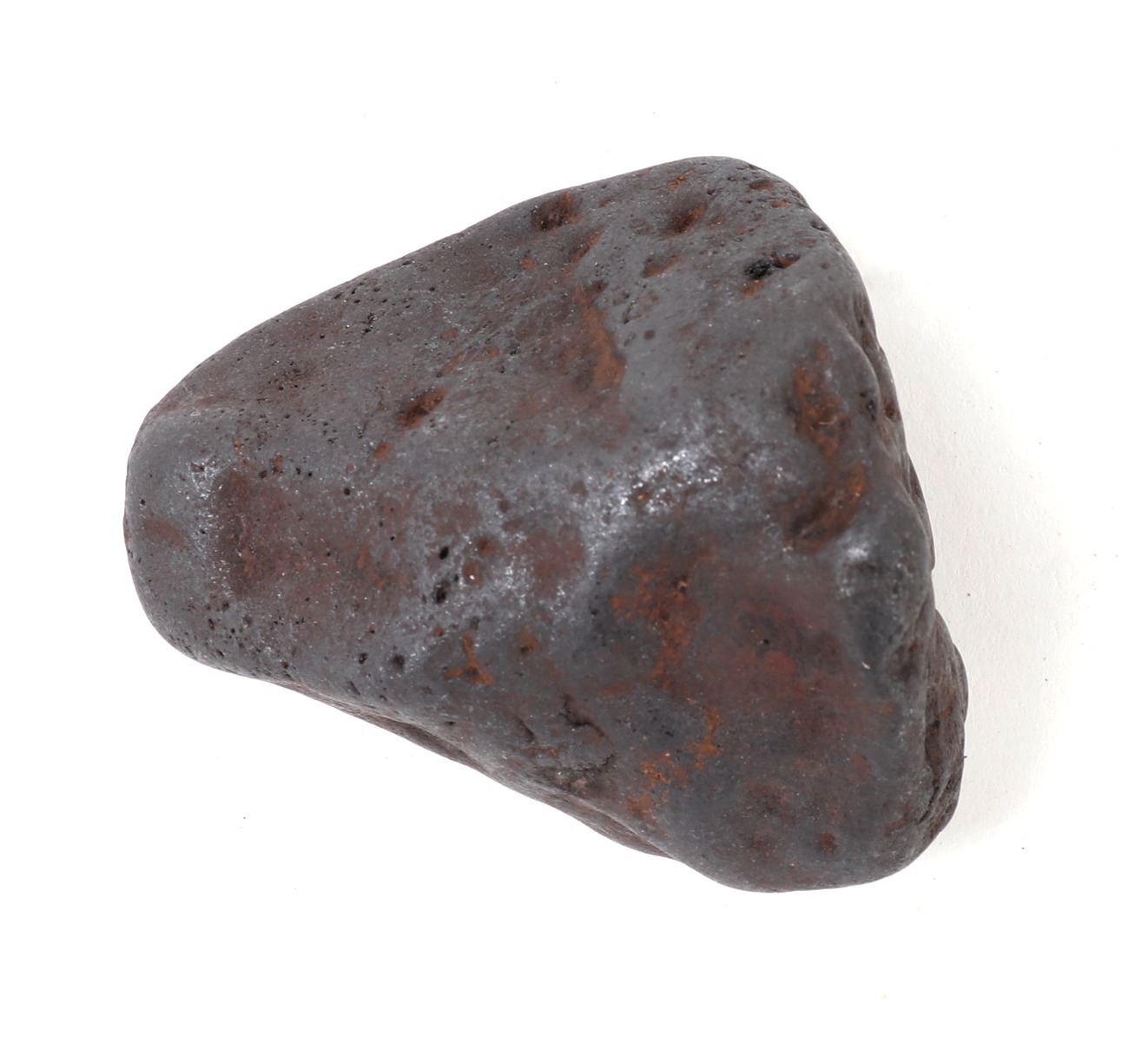 Millions of years old ancient iron meteorite specimen with wonderful red iron deposits throughout as shown. Glistening shine from burning at millions of degrees breaking up through the atmosphere. Size 2 1/2" L, weight 281 g. Condition: Well preserved overall condition throughout.