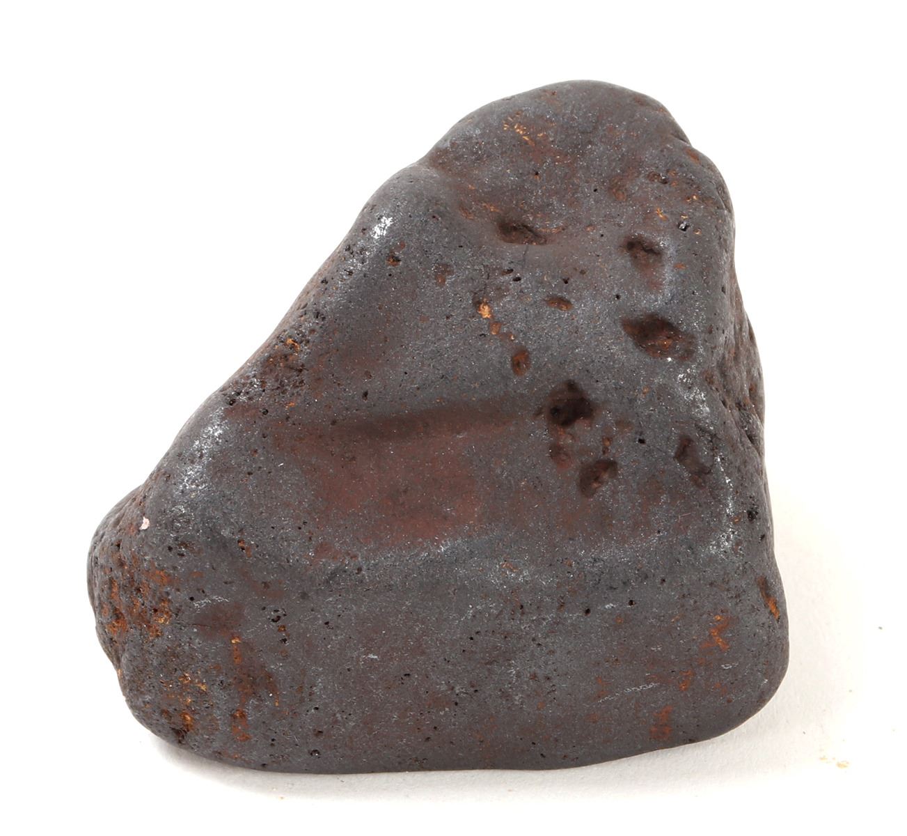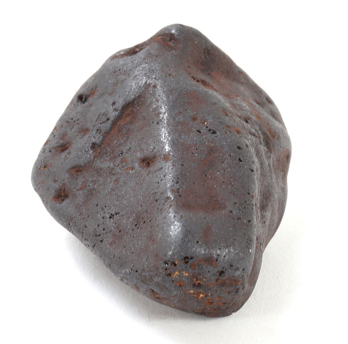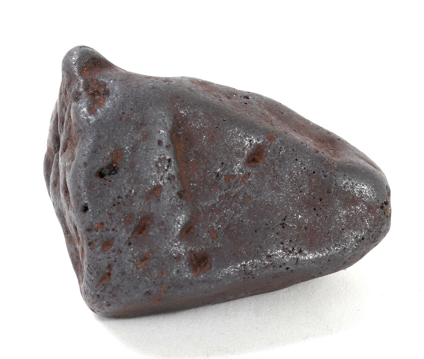 Millions of years old ancient iron meteorite specimen with wonderful red iron deposits throughout as shown. Glistening shine from burning at millions of degrees breaking up through the atmosphere. Size 2 1/2" L, weight 281 g. Condition: Well preserved overall condition throughout.