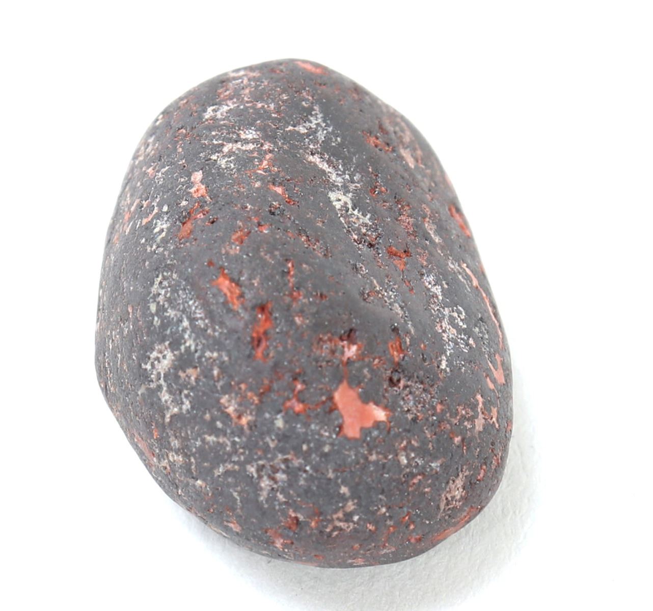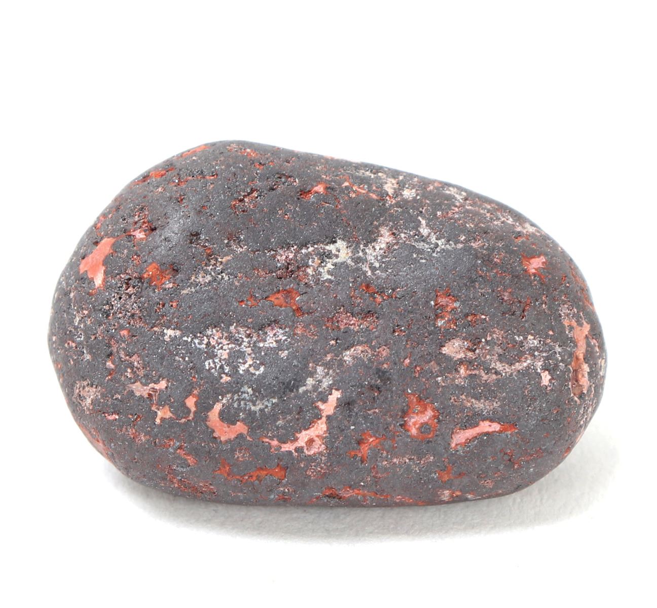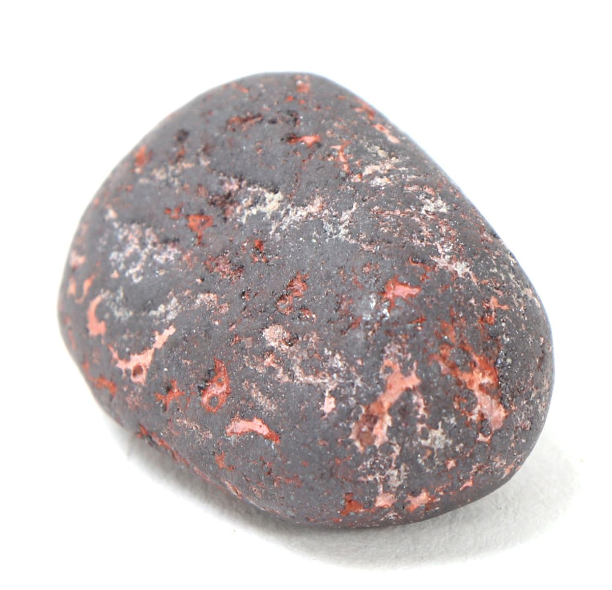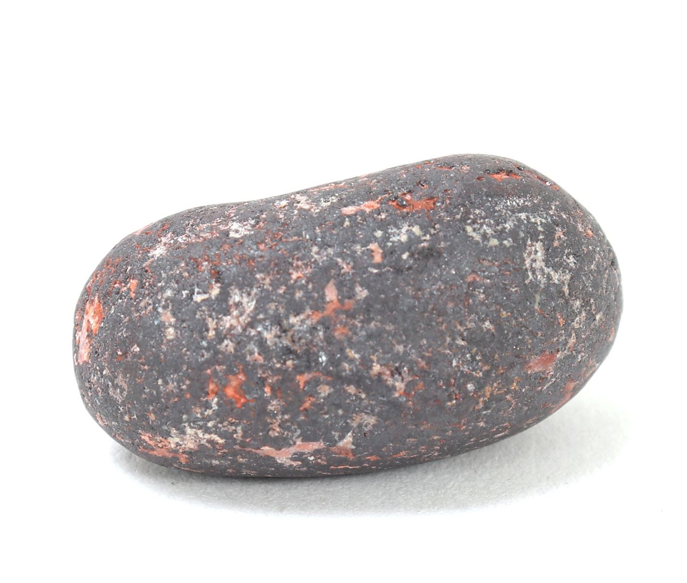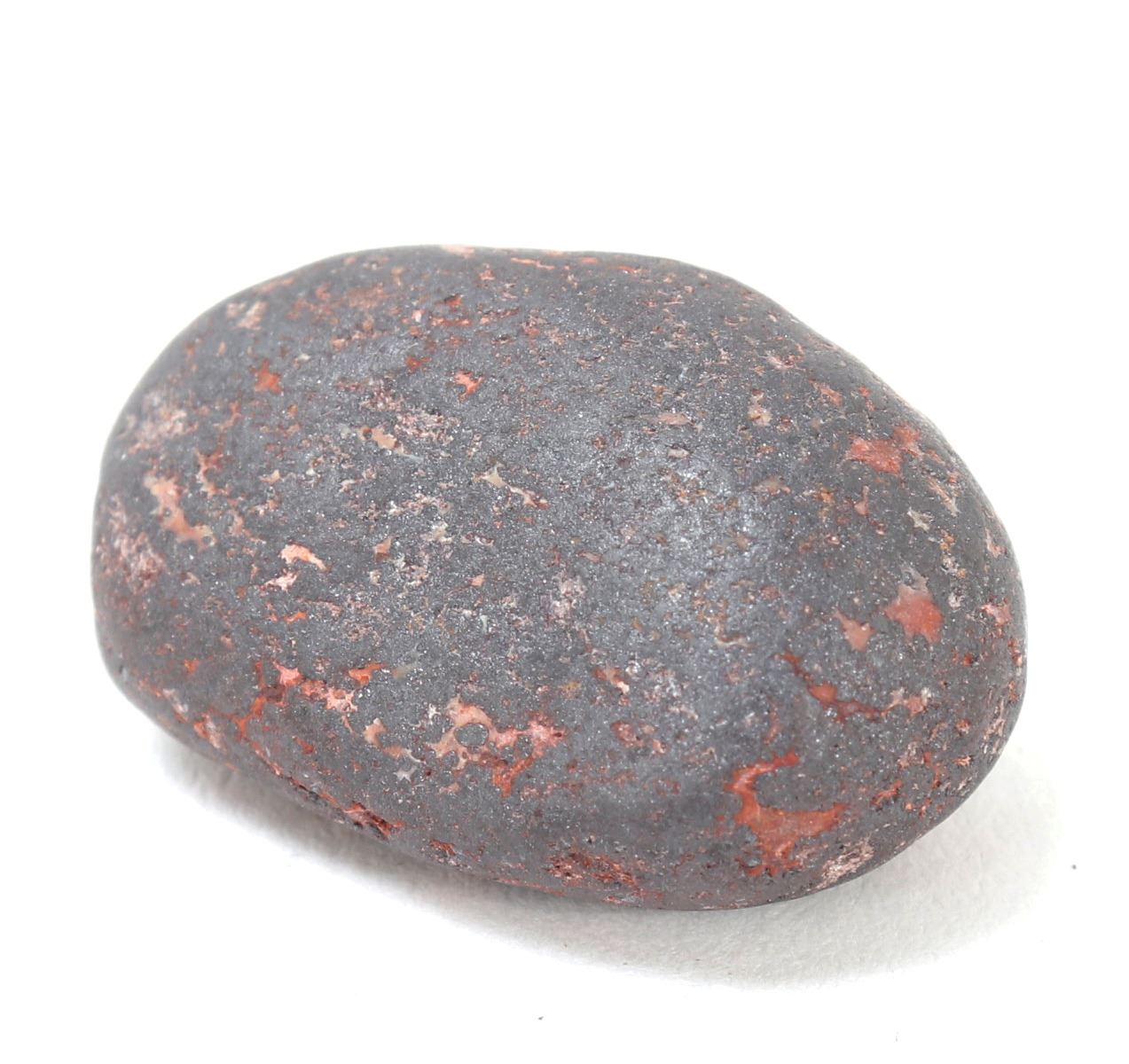 Ancient raw iron meteorite mineral specimen with bright almost copper red sheen in veining throughout. Solid and heavy in hand. Size 1" L, weight 15 g. Condition: Well preserved overall condition.