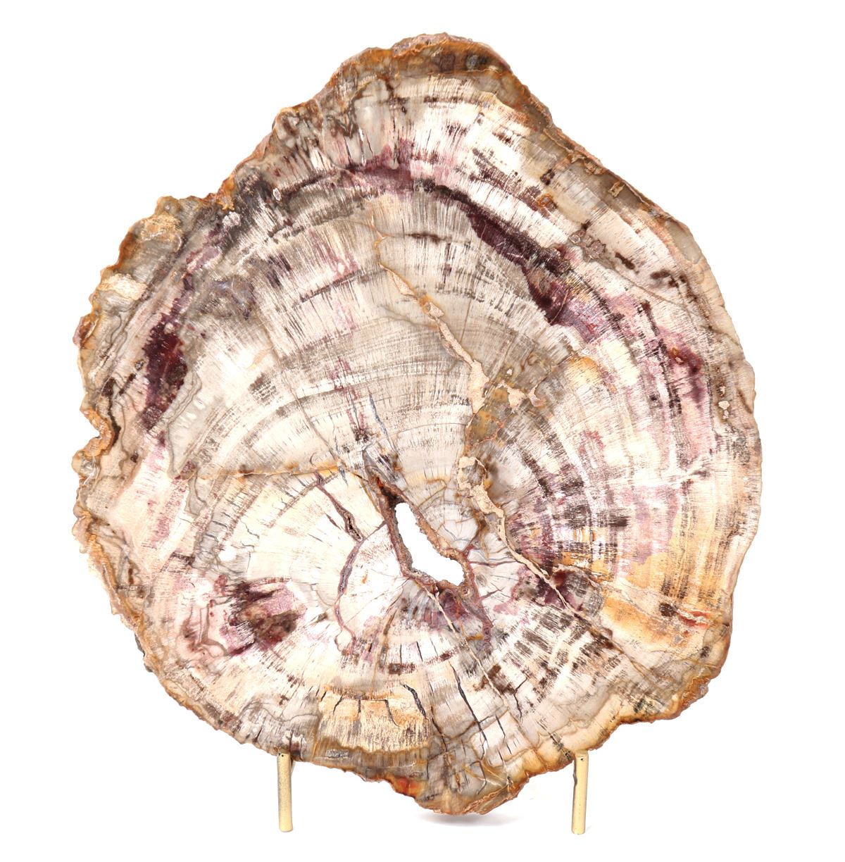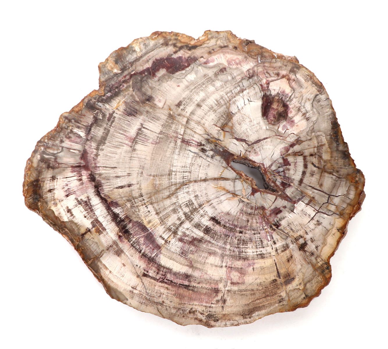 Well preserved petrified wood slab with incredible coloring throughout including deep browns purple and pinks throughout. Size 7 1/2" L x 8 1/2" W x 1/2" H, weight 1188g. Condition: Good overall condition.