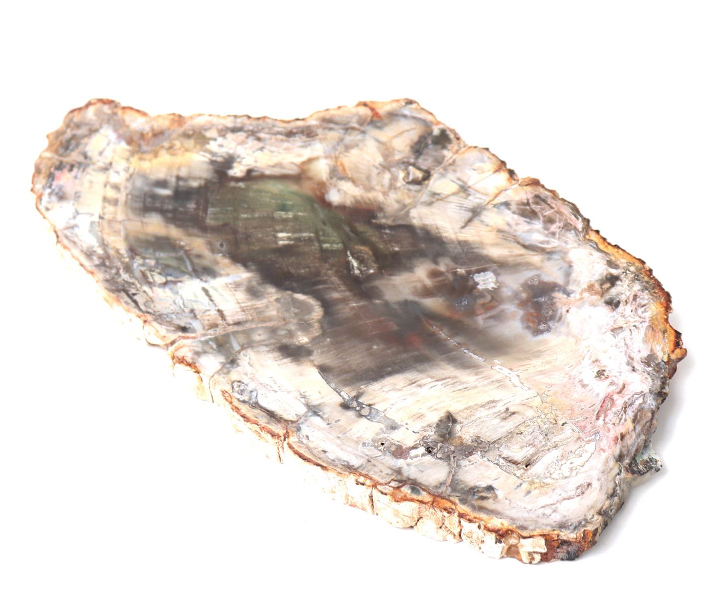 Wonderful and colorful section of ancient petrified wood. Almost too many colors to see, the center glows with a warm vibrant ocean green to thunder grey. Overall cream and tan coloring. Size 8 3/4" W x 5" H. Condition: Wonderful condition.
