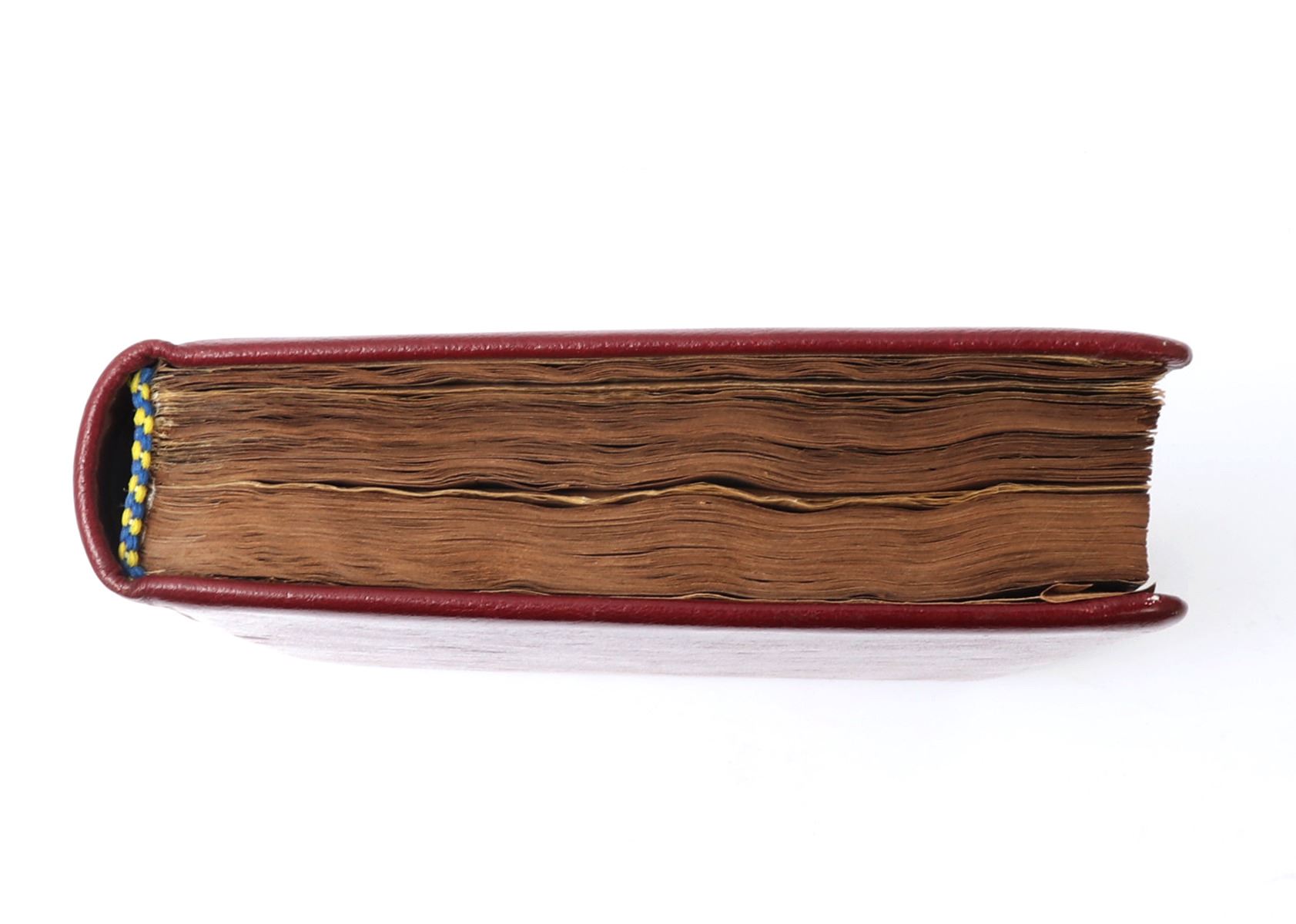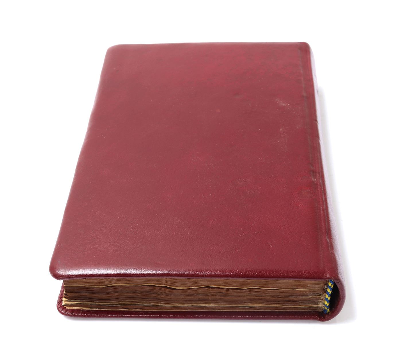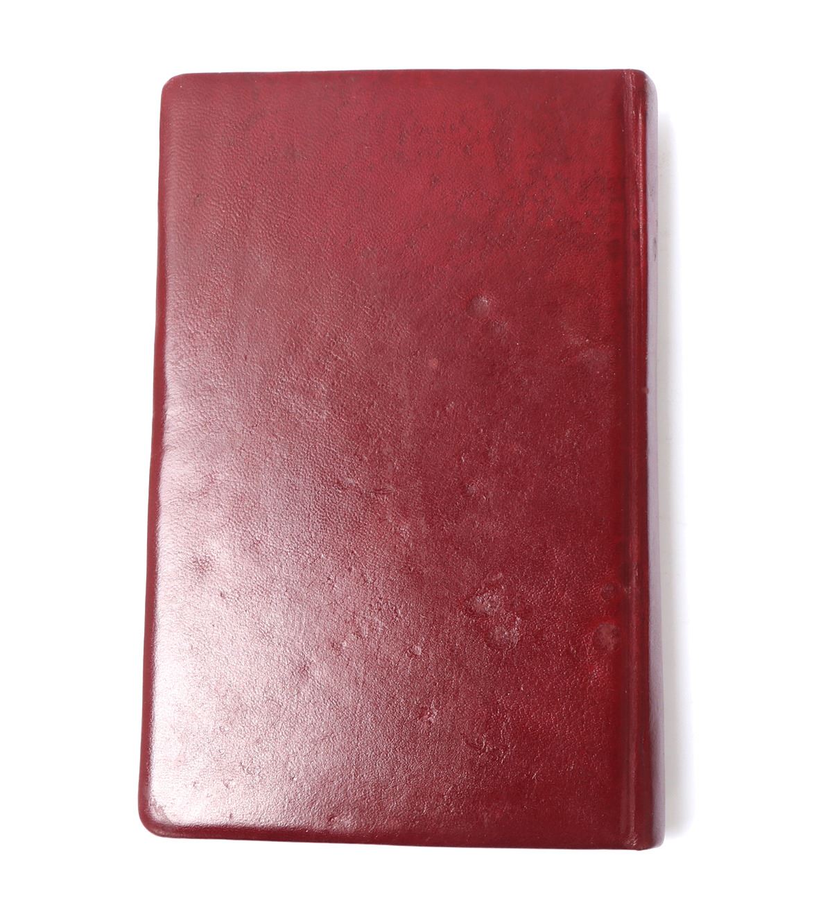 Beautifully rebound in red leather Koran written in Arabic and many pages with gold paint and some beautiful floral patterns. Probably late 18th or 19th century. Some blue panels with ornate decoration and nearly all remounted on thin paper in some area completely transparent. The first page left to right reading (O Allah, you are the one who is All-seeing, so grant me happiness and good fortune). Another page from right to left and of the most ornately decorated reading: Brother of the faith and religious spirit, he writes that as the holy Yazidi saint, the Almighty, has given his shoulder to guide the people who have died in the valley of ignorance and misguidance, through fasts, supplications, and act of worship, which are the best and the closest of knowledge to the Nile of happiness. Size 9 1/2" L x 6" W x 1" H, weight 450g. Provenance: Ex-Islamic Art Collection Pasadena