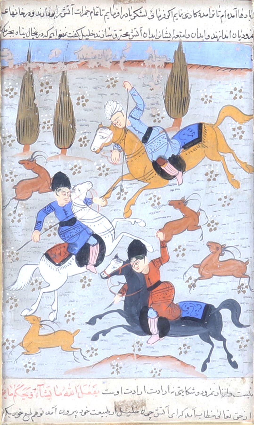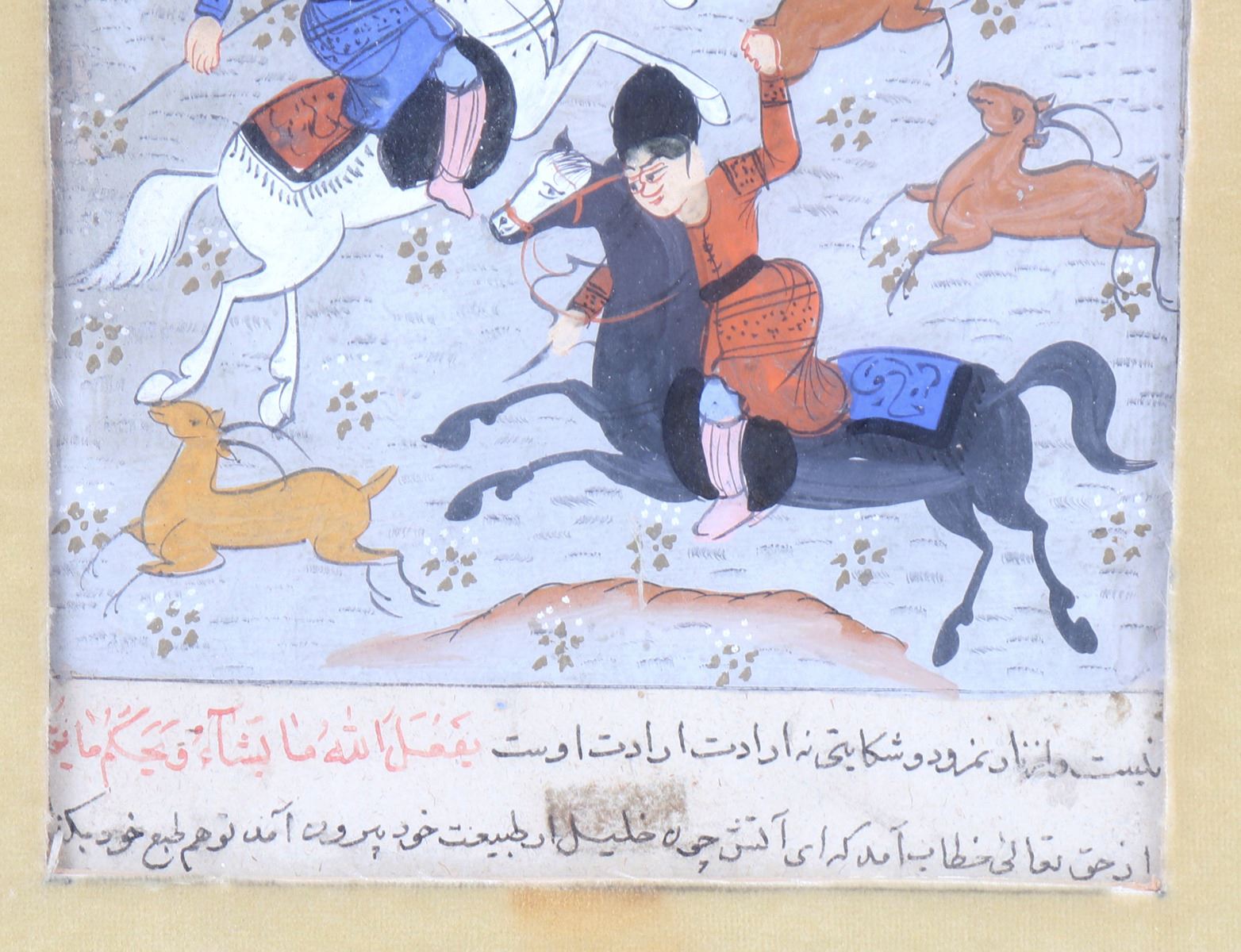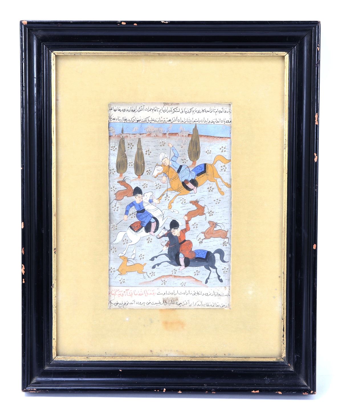 Wonderful framed Persian watercolor scene on paper of riders in the hunt on horseback chasing small deer with spears. Inscription to the top reading in Persian (I have come to the winds to do something to you, and you have sent an army to my space so that they will set fire to all the gems and throw fire in the houses of the Modians, make Iran a burning fire for eternity). Inscription to the base reading with auto translation from Persian (There is no complaint, no complaint, no devotion, his devotion is the work of God, God willing, and the rule of Maya, you are the one who came, O blood of Khalil). Size 14" L x 17 1/2" W x 1 1/2" H, weight 1460g. Provenance: Ex-Pasadena Collection