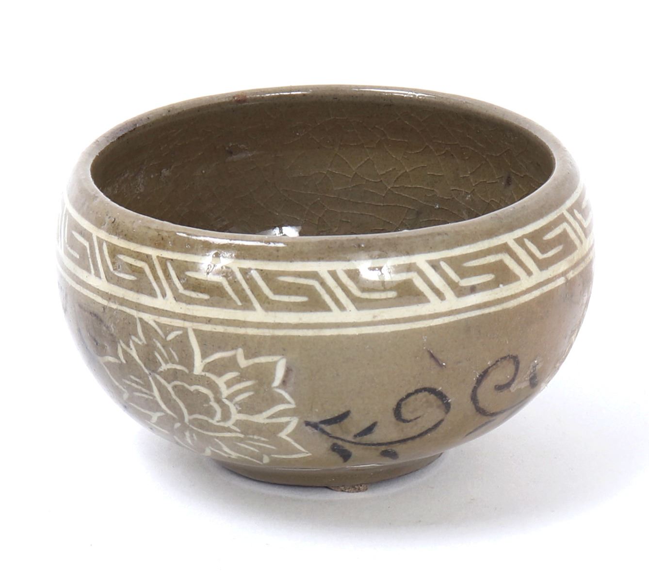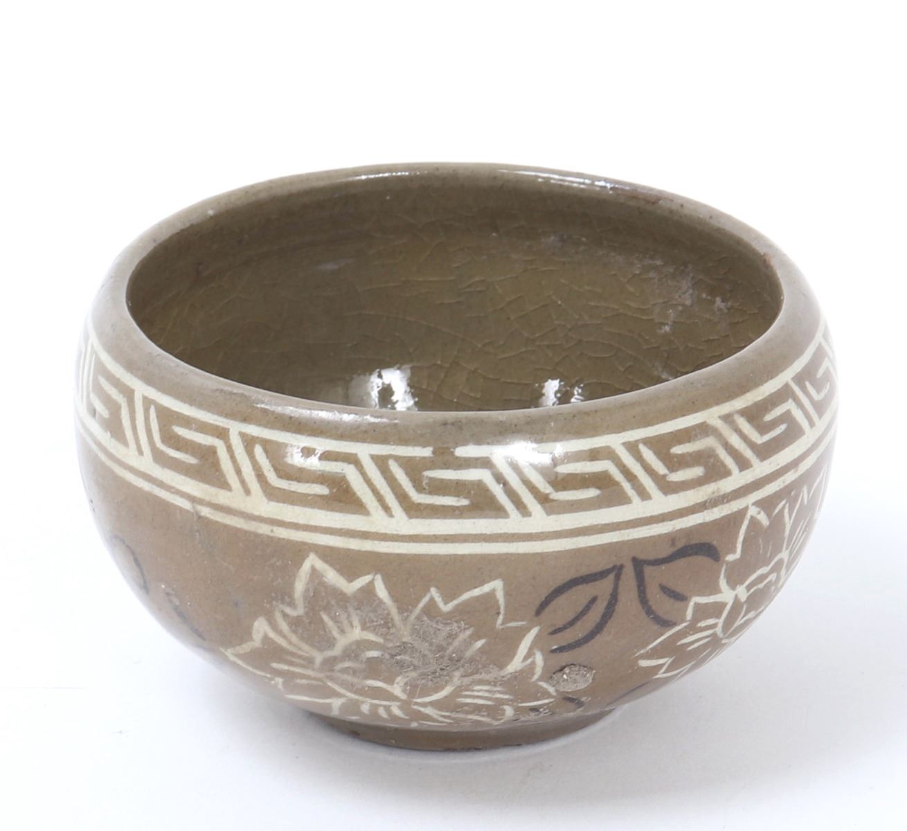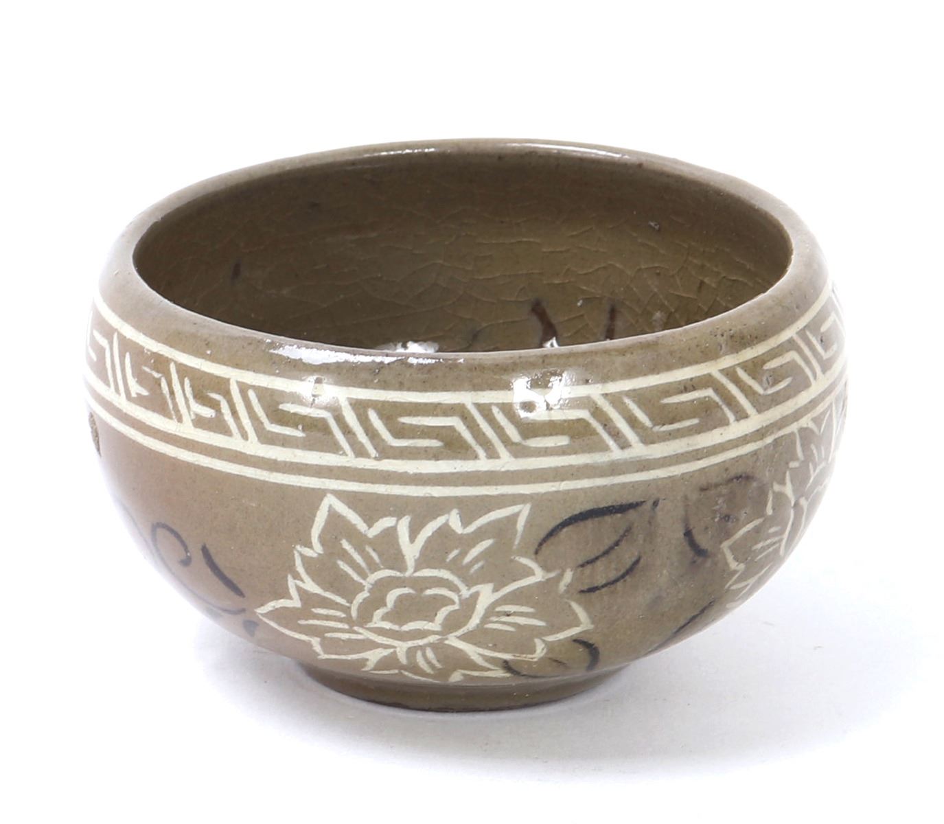 Lovely small Korean ceramic crackle glazed bowl or cup. Expertly painted and detailed in white and black with beautiful blooming flowers and a key fret geometric band around the top. Three stem marks from originally being placed in the kiln for firing. Size 3" W x 1 3/4" H. Condition: Good overall condition with no obvious signs of restoration or repairs.