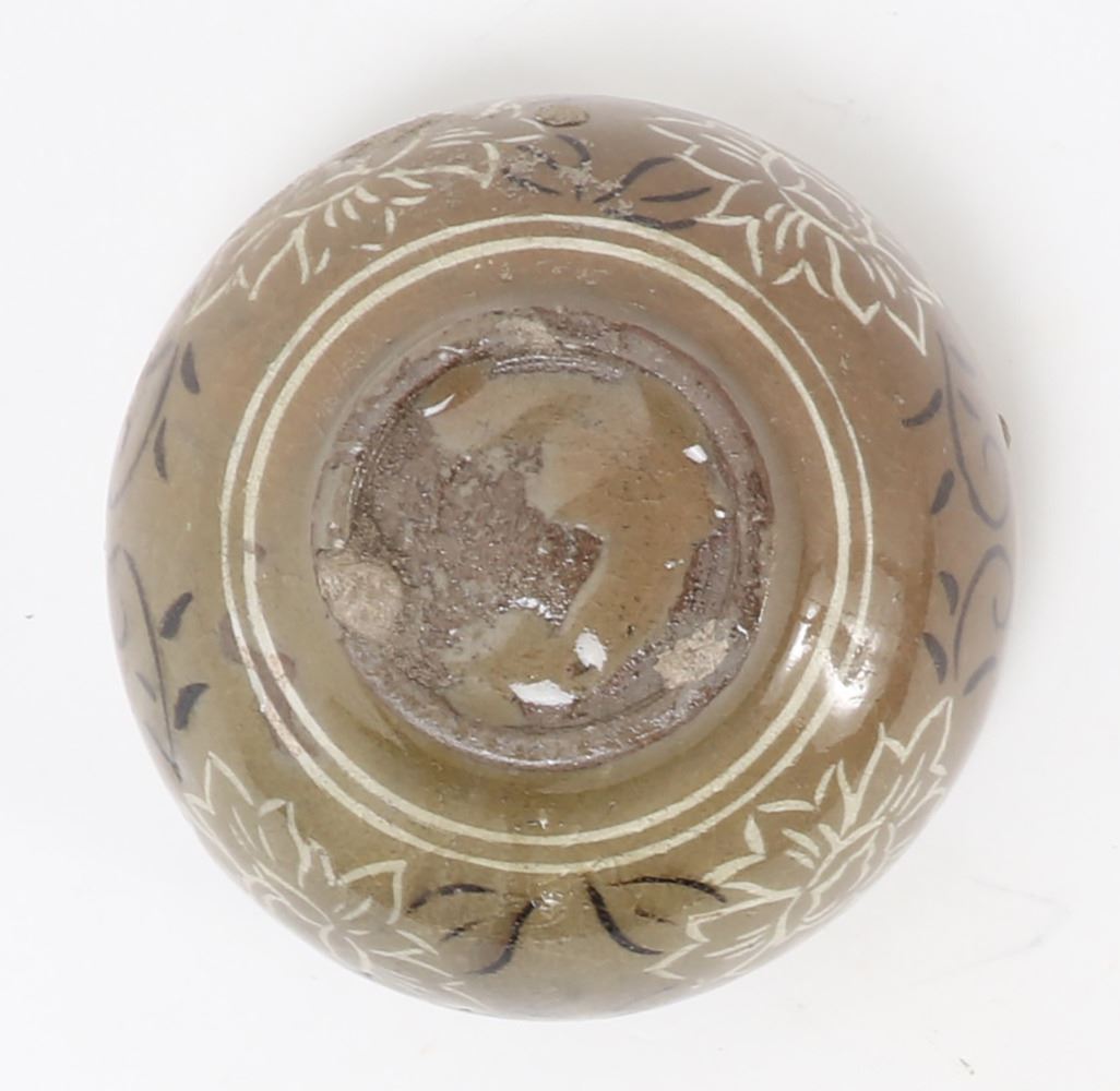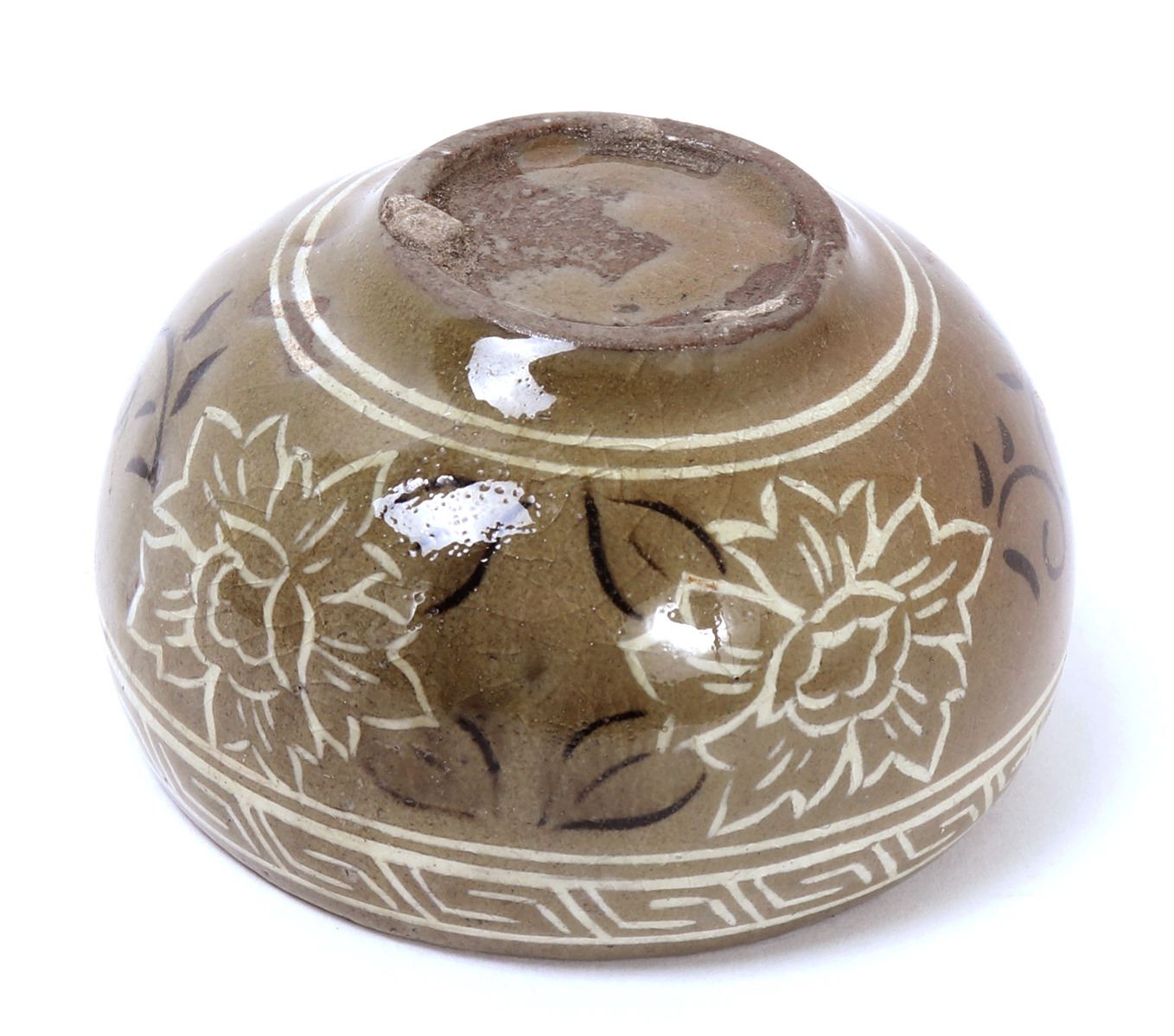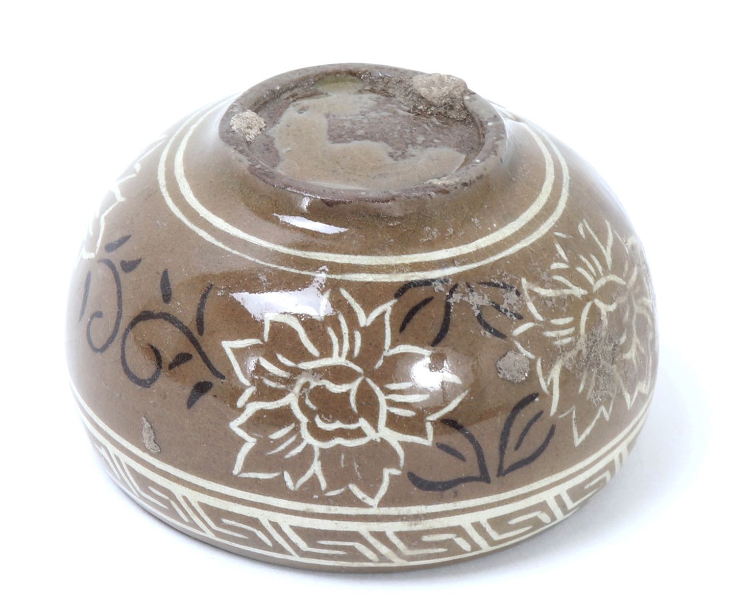 Lovely small Korean ceramic crackle glazed bowl or cup. Expertly painted and detailed in white and black with beautiful blooming flowers and a key fret geometric band around the top. Three stem marks from originally being placed in the kiln for firing. Size 3" W x 1 3/4" H. Condition: Good overall condition with no obvious signs of restoration or repairs.
