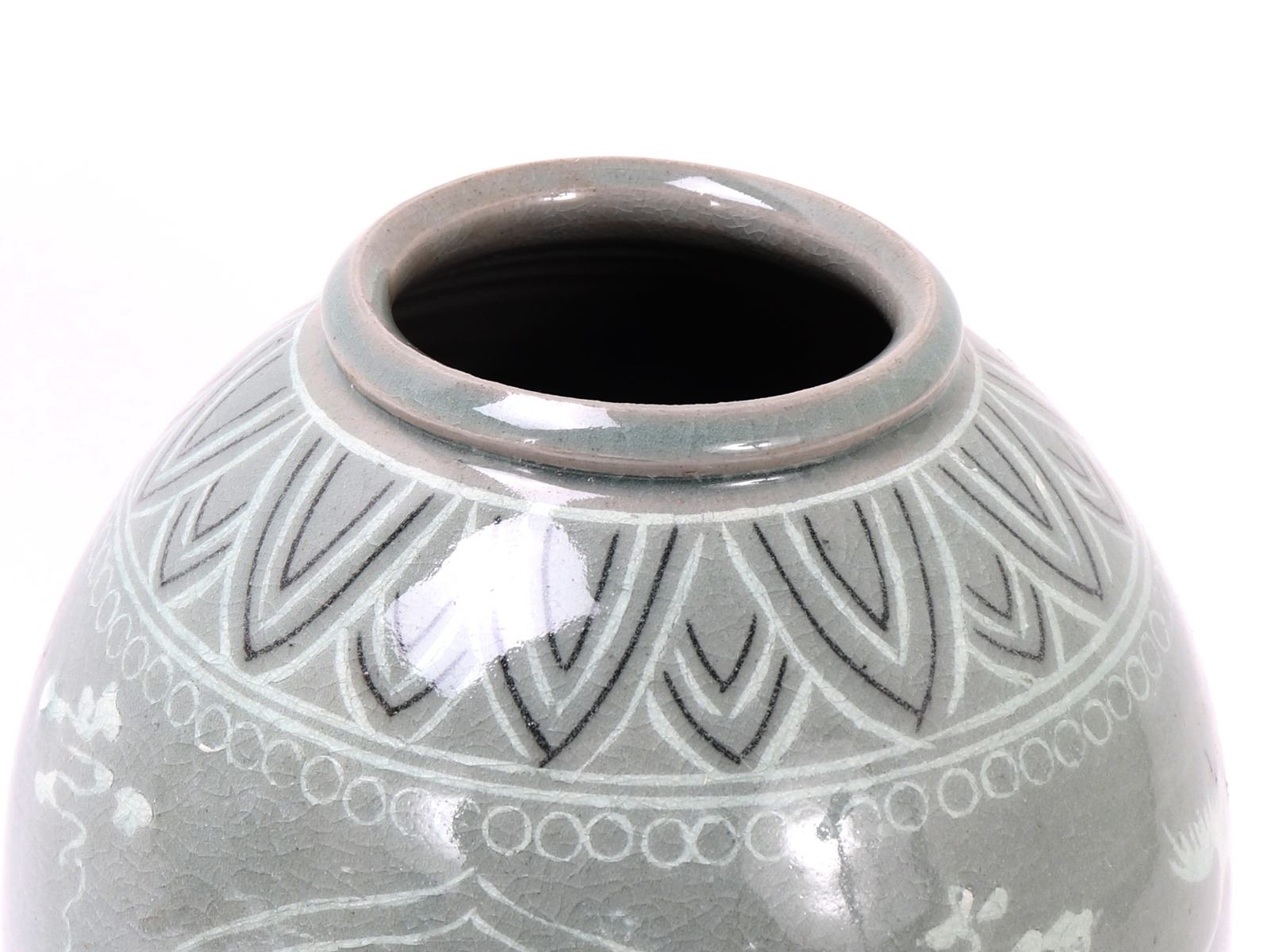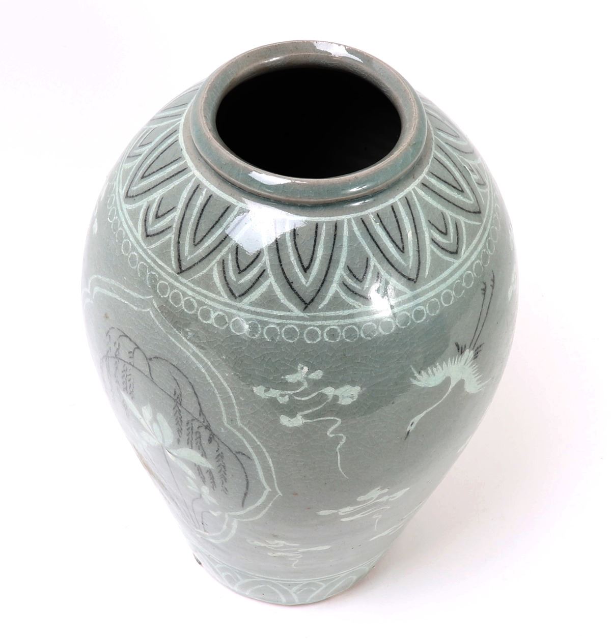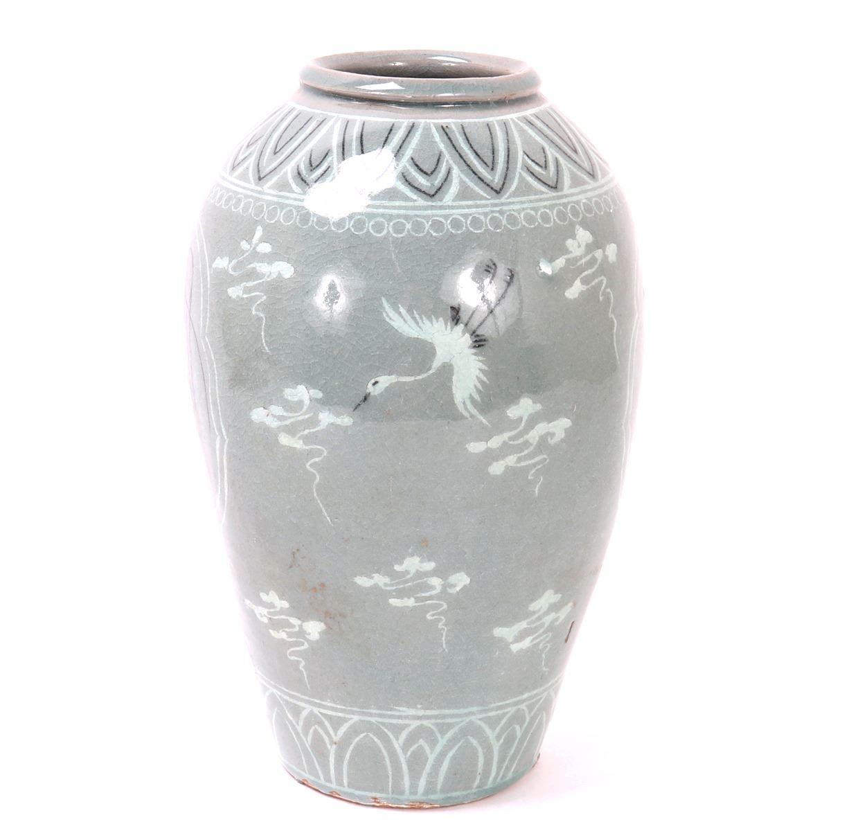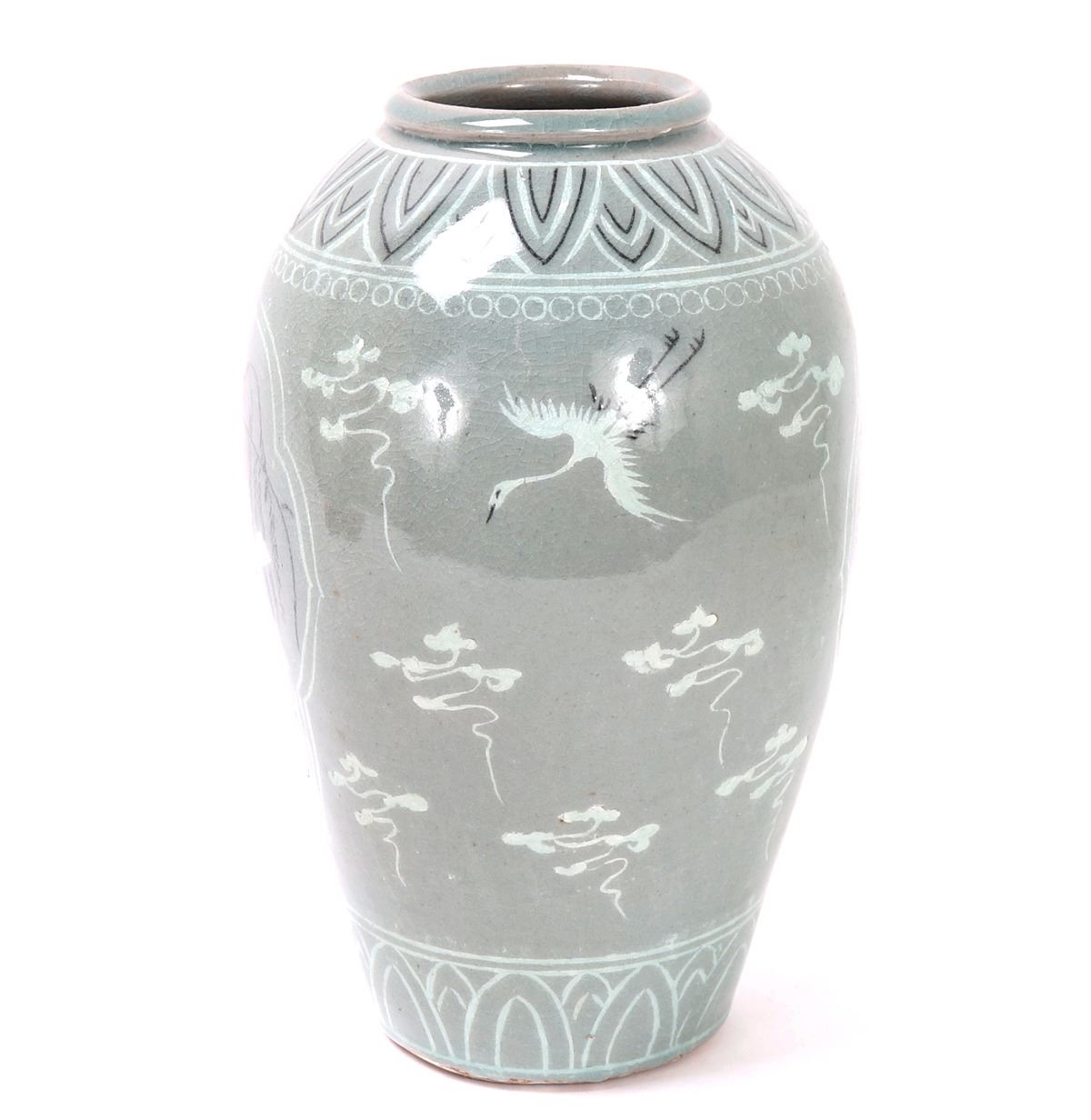 Beautiful Korean ceramic green crackle glazed jar. Decorated throughout with incredible attention to detail. Including blooming flowers, cranes in flight among the clouds, and perfect petal boarders to the shoulder and base. Lovely light green crackle glaze throughout. Size 10 1/2" H x 6 1/2" W. Condition: Wonderful overall condition with no obvious signs of restoration or repair. Raw unglazed foot.