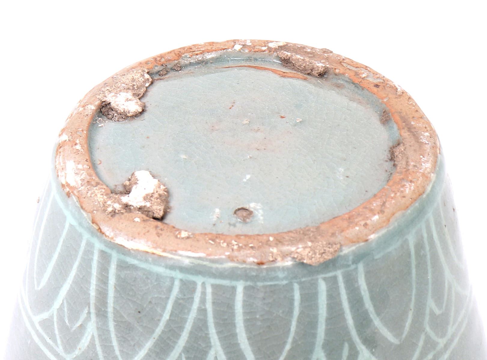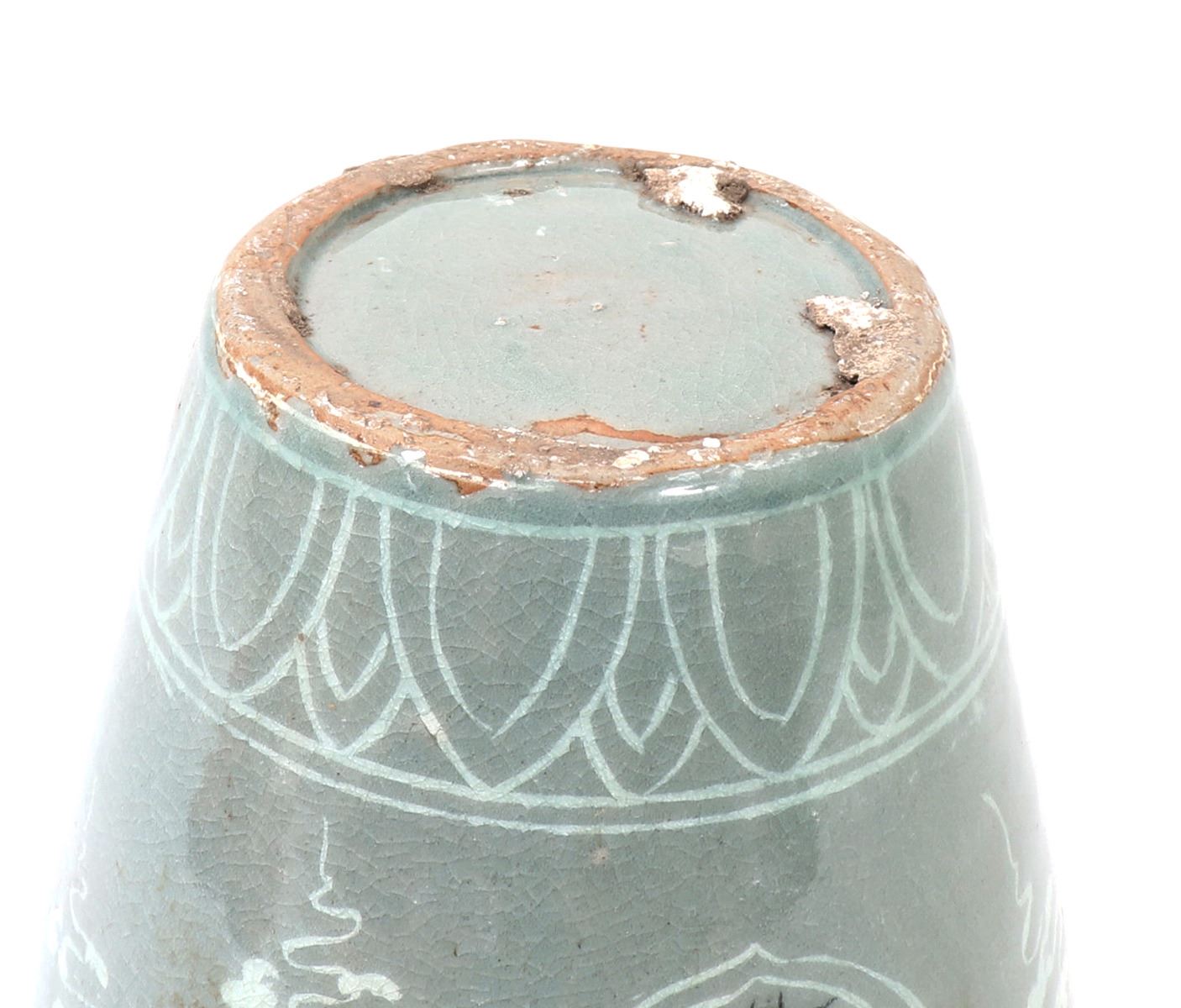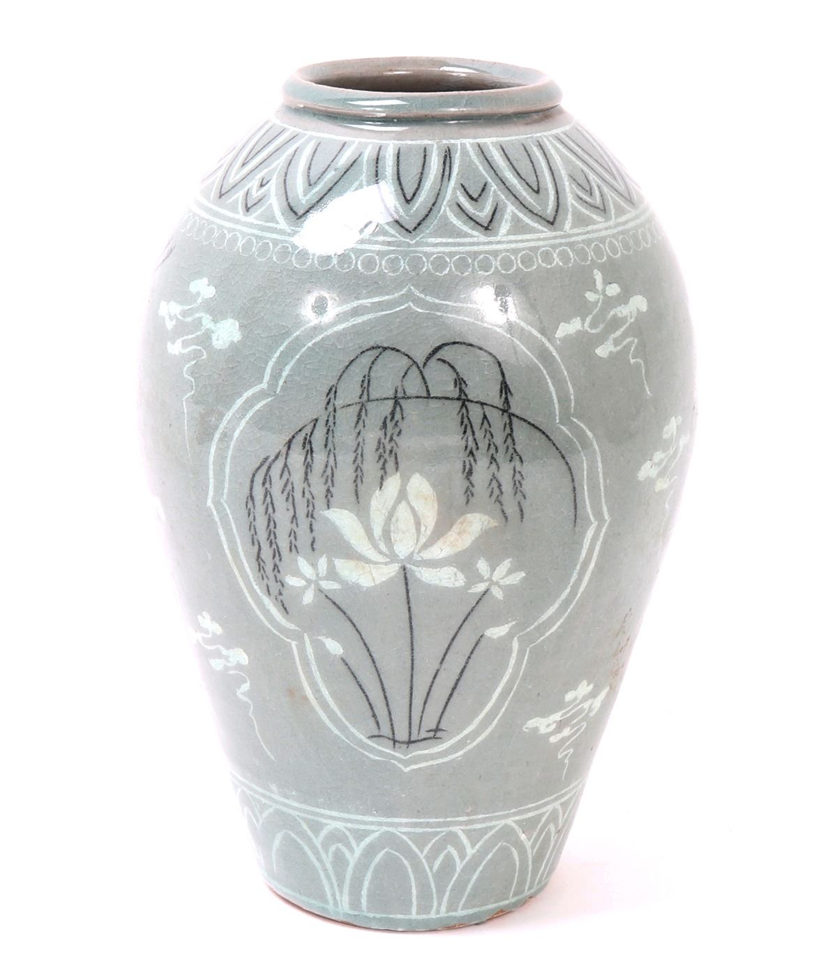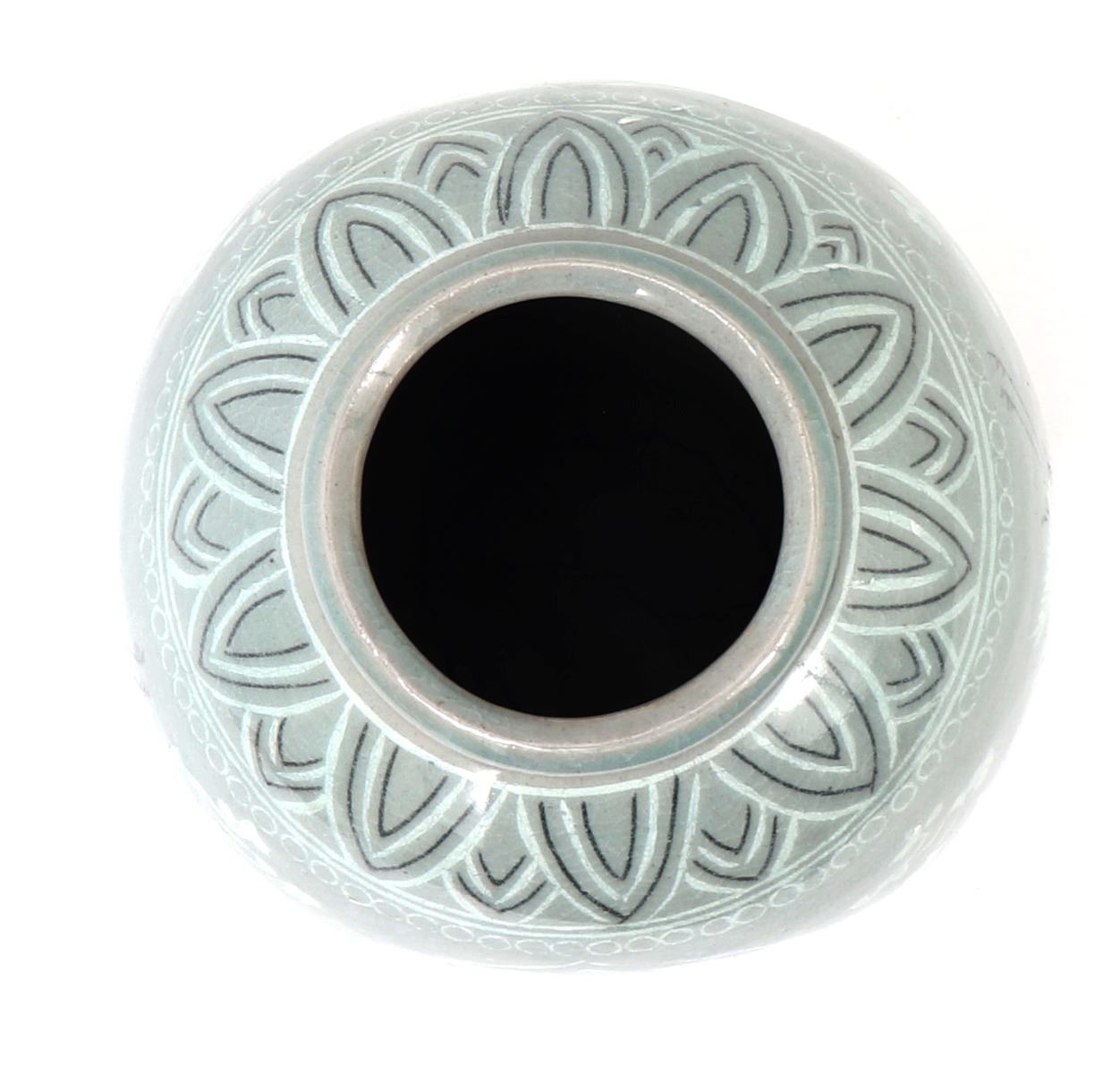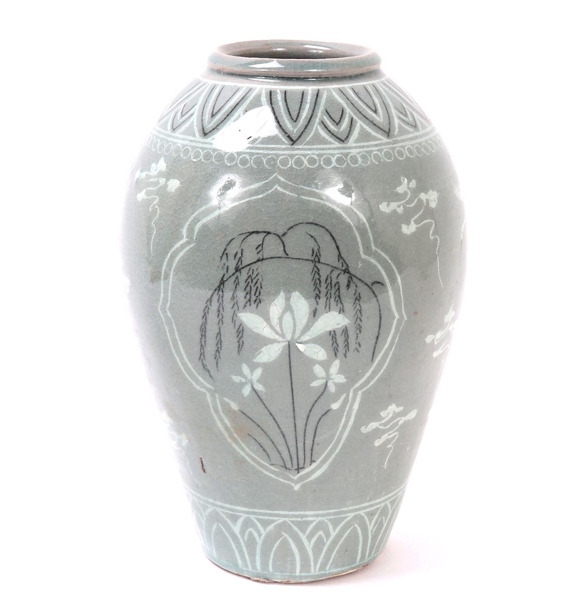 Beautiful Korean ceramic green crackle glazed jar. Decorated throughout with incredible attention to detail. Including blooming flowers, cranes in flight among the clouds, and perfect petal boarders to the shoulder and base. Lovely light green crackle glaze throughout. Size 10 1/2" H x 6 1/2" W. Condition: Wonderful overall condition with no obvious signs of restoration or repair. Raw unglazed foot.