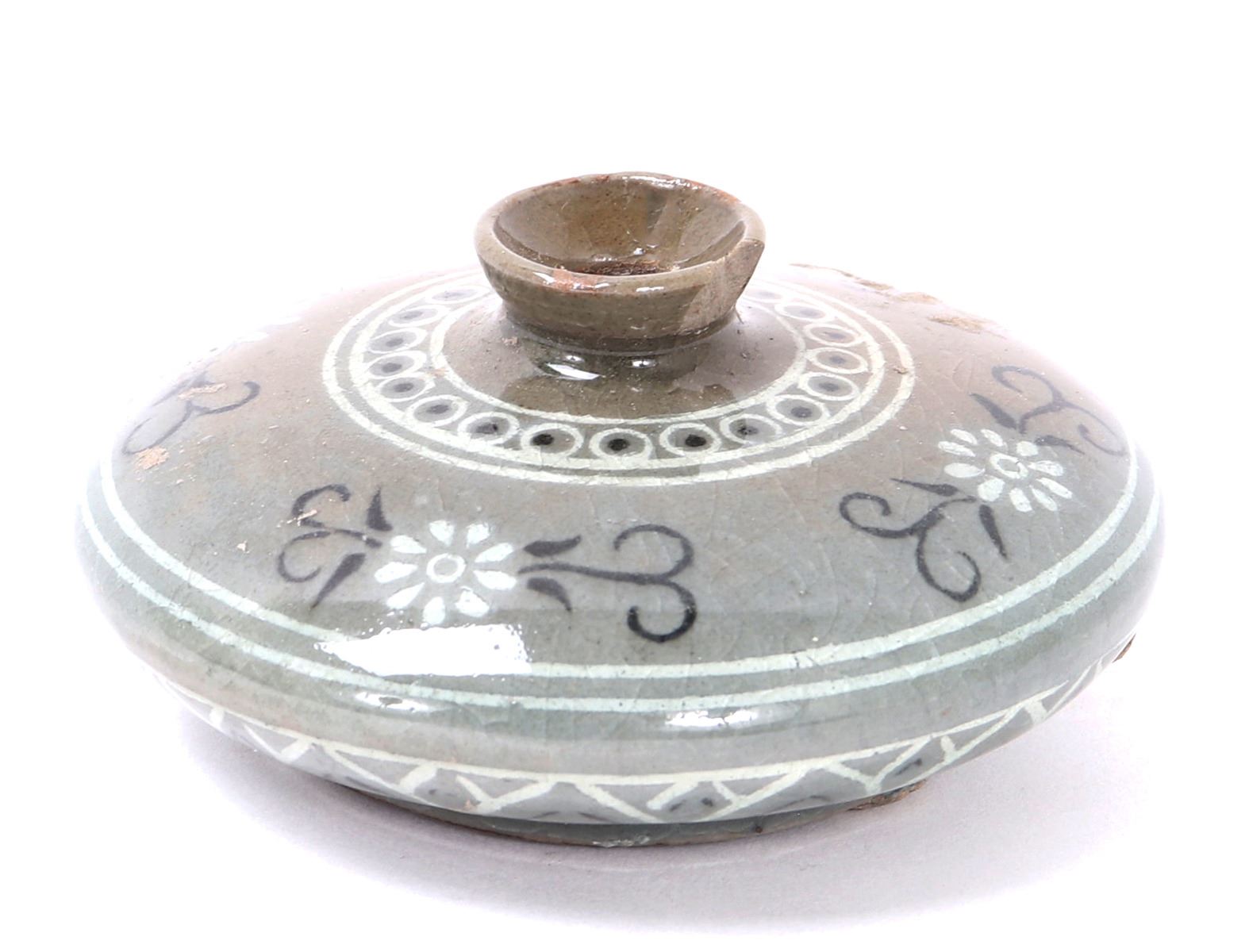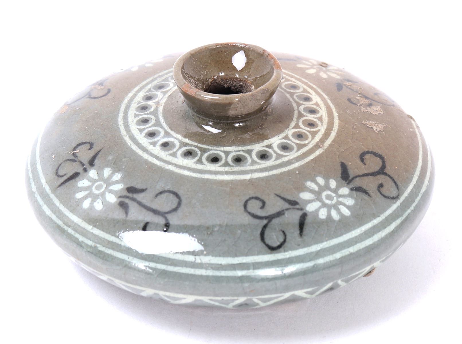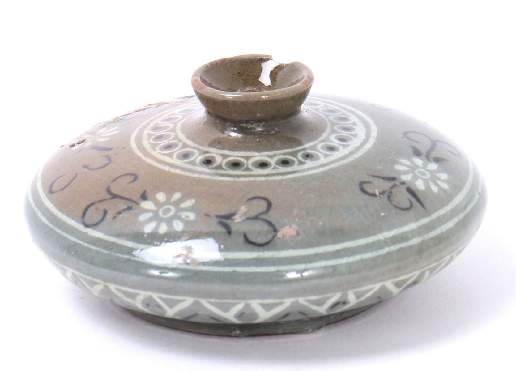 Beautiful antique ceramic green crackle glazed Korean water dropper. Olive green in color with a lovely crackle throughout. Small and squat body form with three spur marks to the base. Painted throughout with blooming chrysanthemums and geometric designs throughout. Size 3 1/2" W x 1 1/2" H. Condition: Small old chip to rim, else in overall good condition.