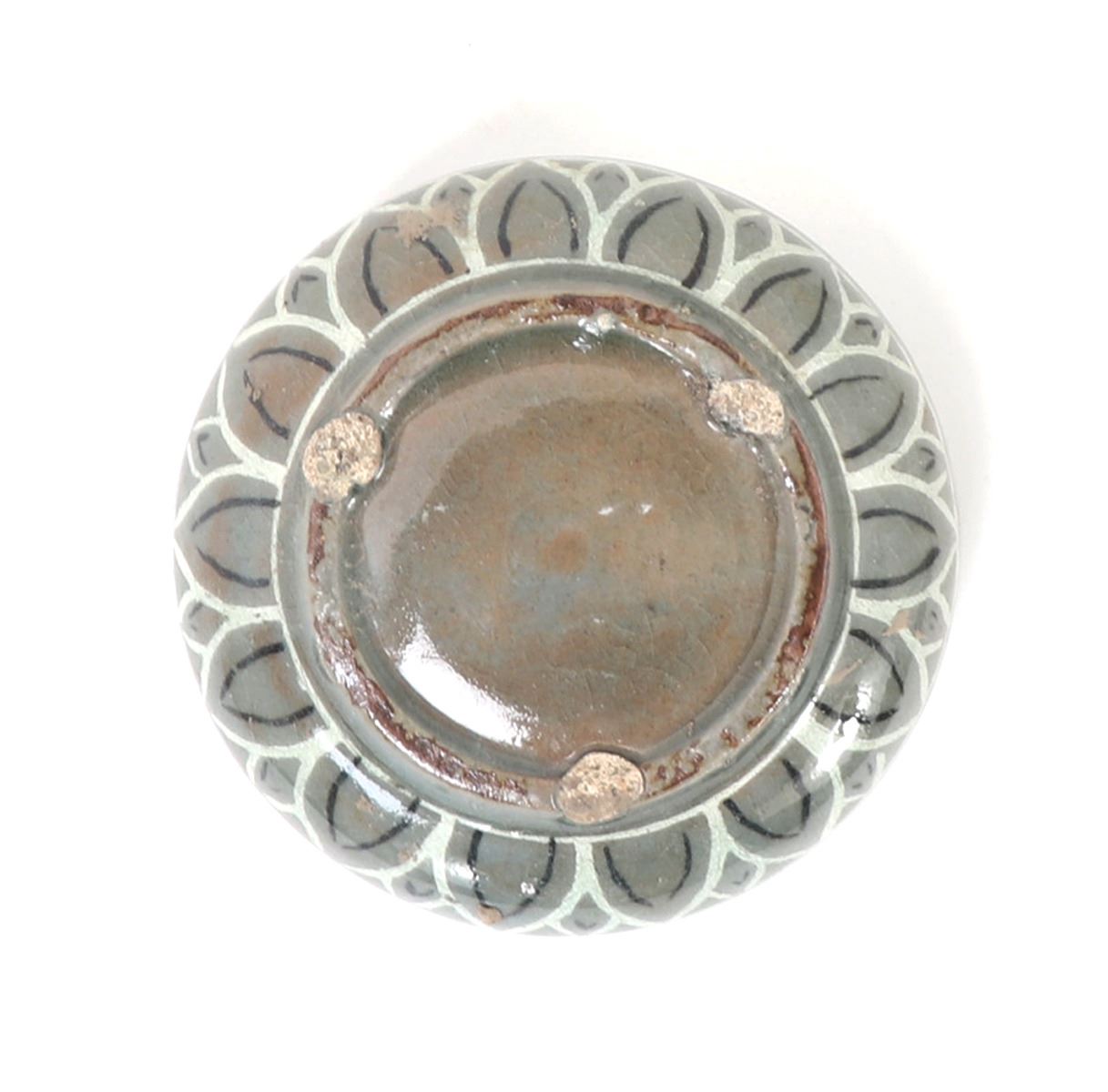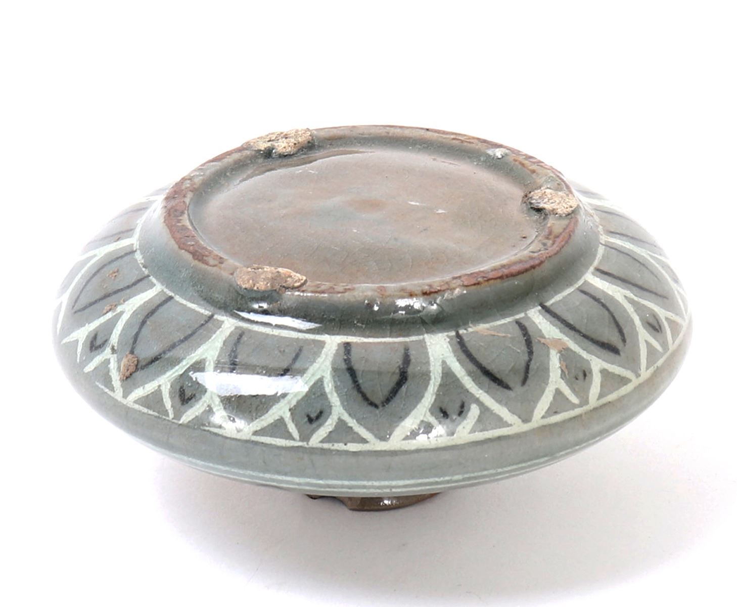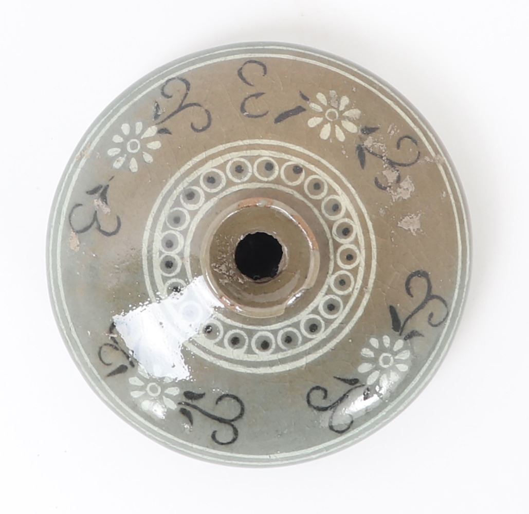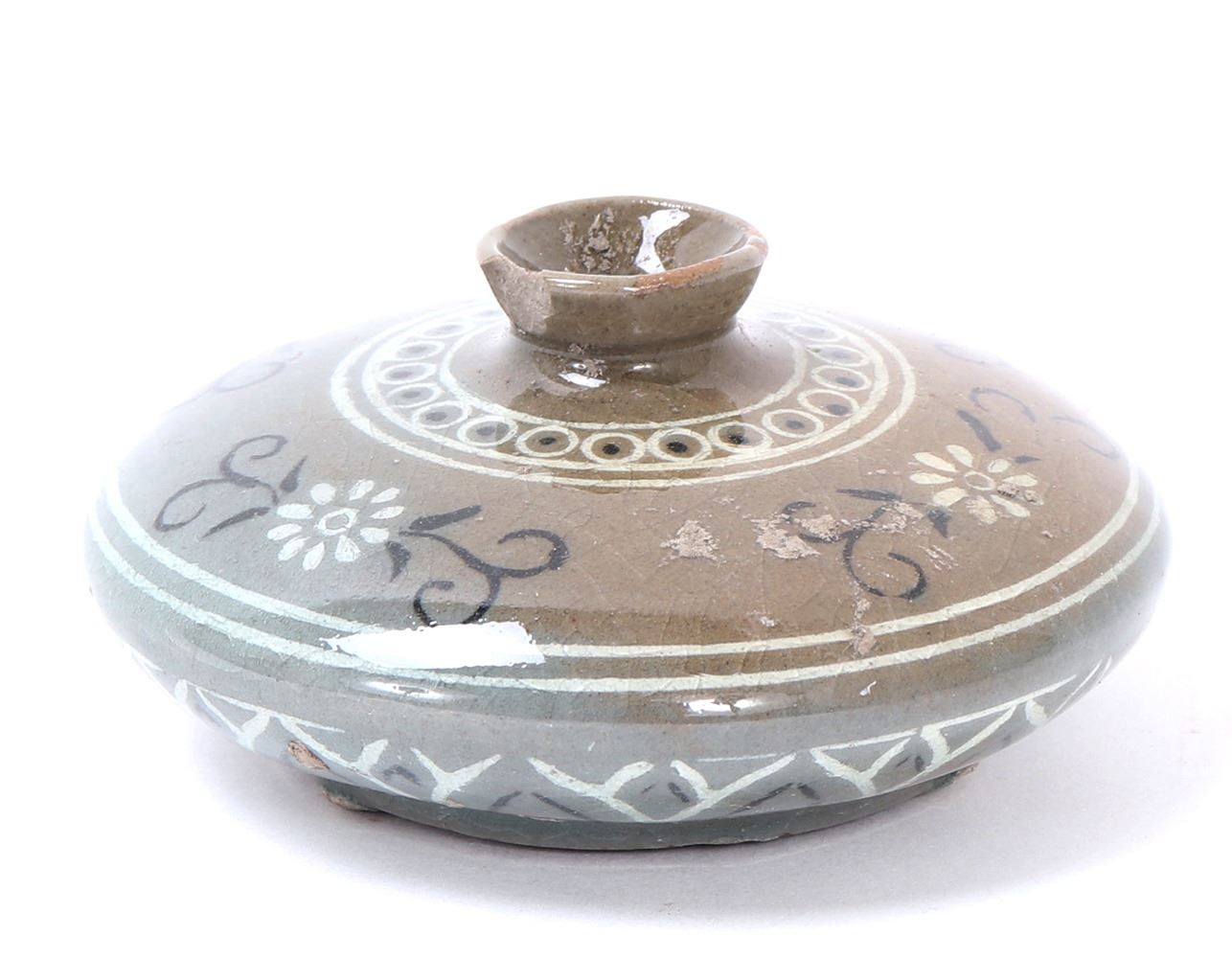 Beautiful antique ceramic green crackle glazed Korean water dropper. Olive green in color with a lovely crackle throughout. Small and squat body form with three spur marks to the base. Painted throughout with blooming chrysanthemums and geometric designs throughout. Size 3 1/2" W x 1 1/2" H. Condition: Small old chip to rim, else in overall good condition.