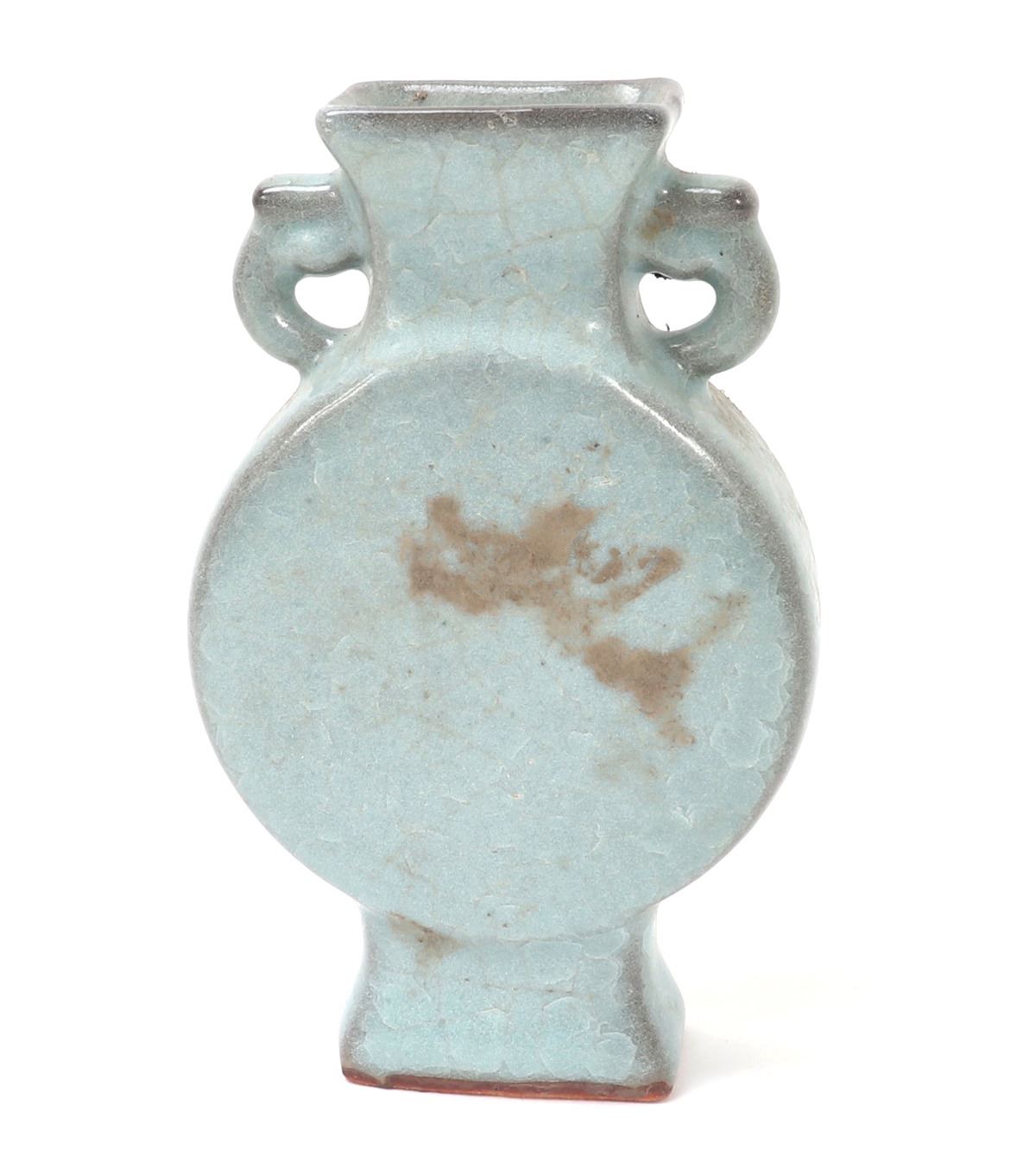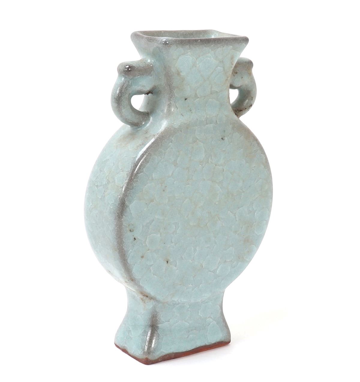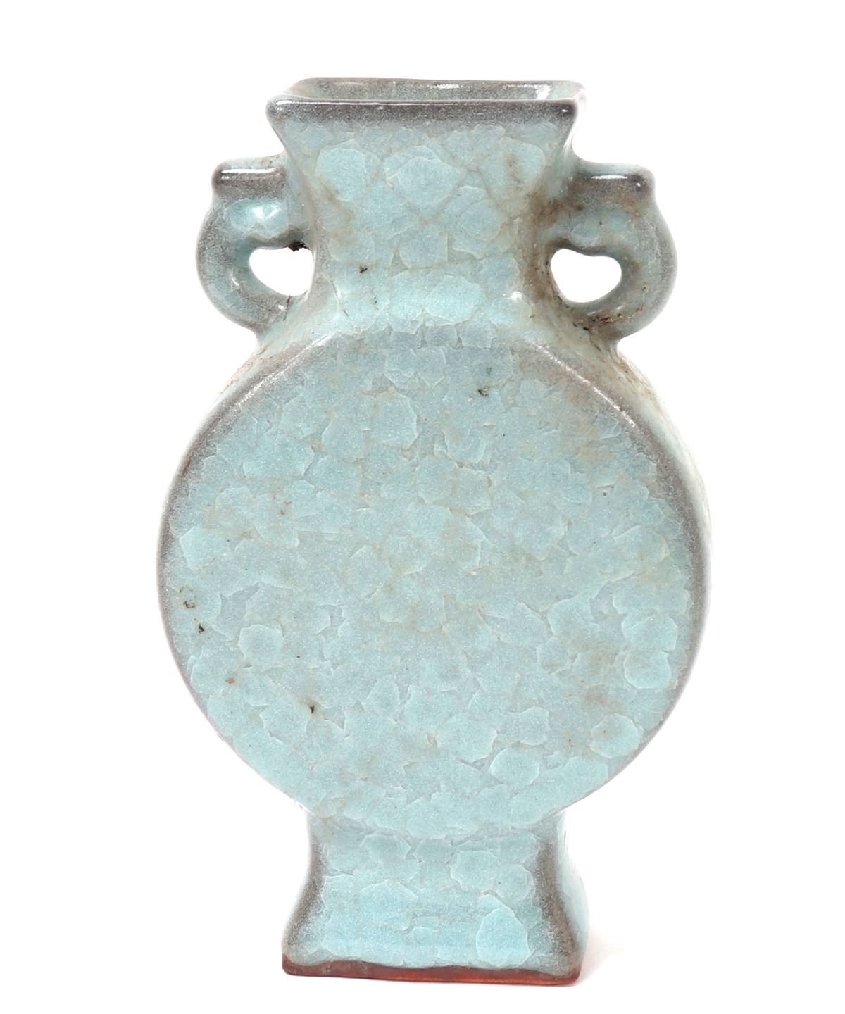 Beautiful hourglass shaped Korean ceramic green crackle glazed vase with a large full moon shaped body with a tall flared pedestal foot, narrow neck with a flared rim, elephant handles to each side. Light green pigment with a clear glaze that's been cracked to give the crackle effect. Size 8 3/4" H x 5 1/2" W.. Condition: Good overall condition with no obvious signs of restoration or repair.