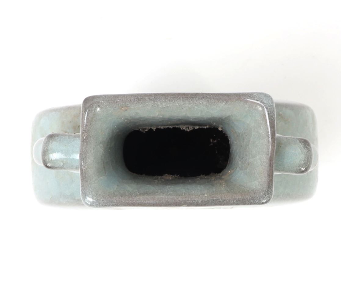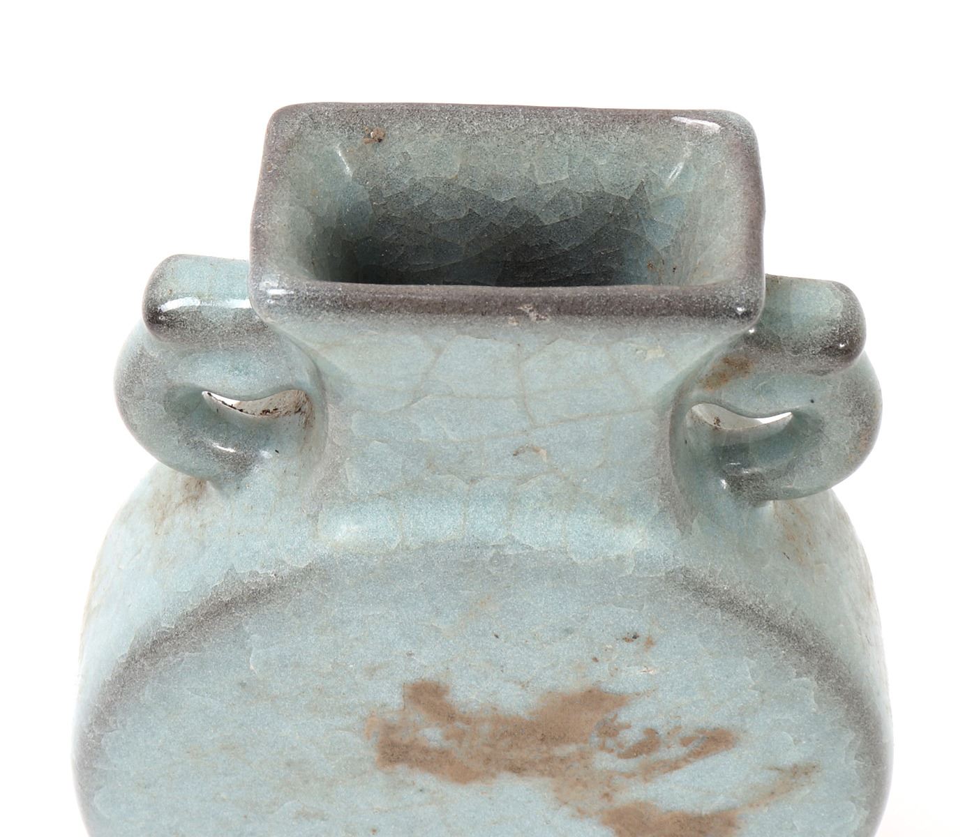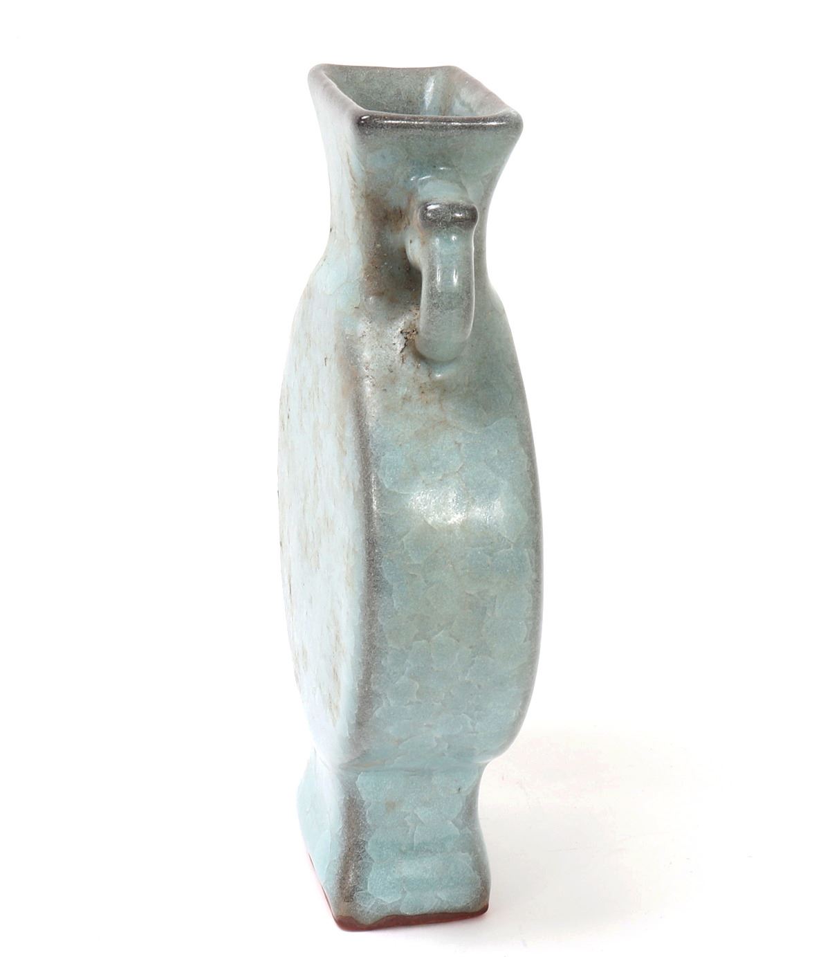 Beautiful hourglass shaped Korean ceramic green crackle glazed vase with a large full moon shaped body with a tall flared pedestal foot, narrow neck with a flared rim, elephant handles to each side. Light green pigment with a clear glaze that's been cracked to give the crackle effect. Size 8 3/4" H x 5 1/2" W.. Condition: Good overall condition with no obvious signs of restoration or repair.