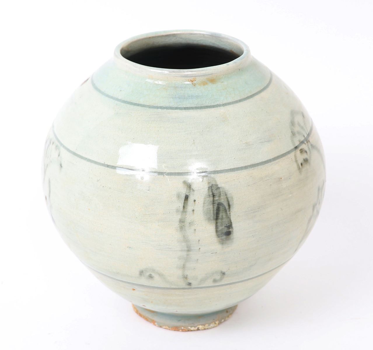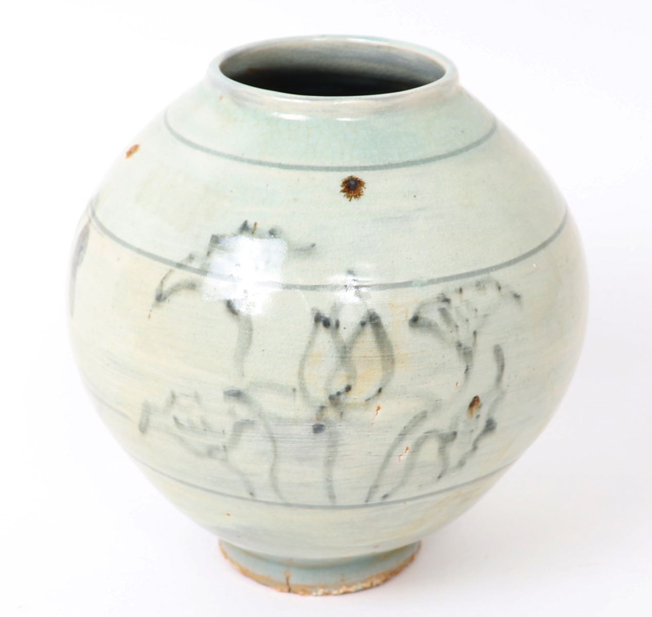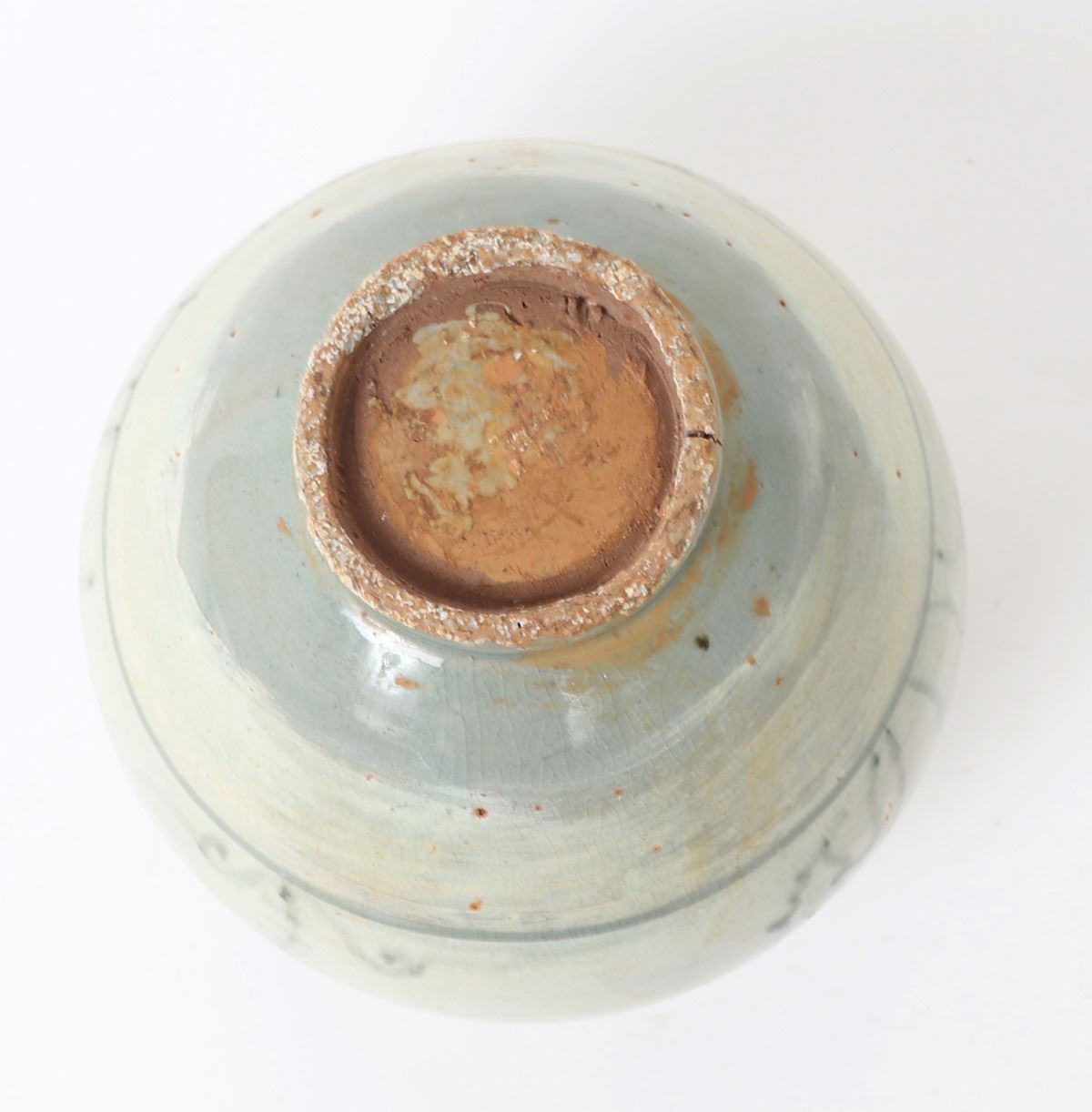 Late 19th century Korean porcelain crackle glazed vase in a unique turquoise green faded glaze. Painted with a light forest green details of blooming flowers and four bands around the body. Raised unglazed foot with possible stilt mark remaining. Size 8" H. Condition: Small firing flaw crack to foot, else in very good condition.