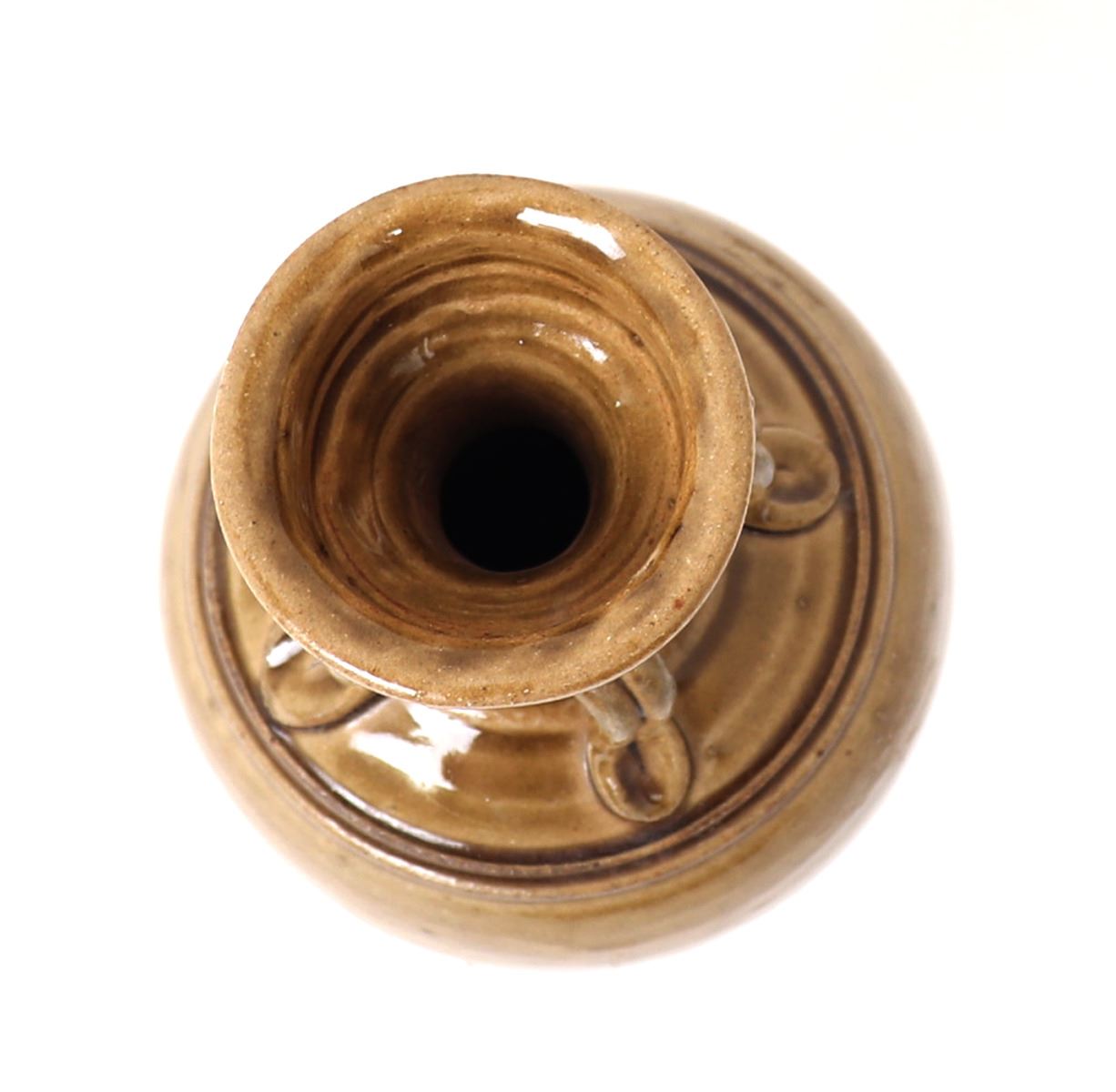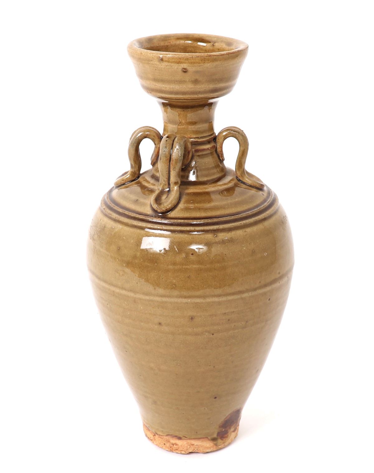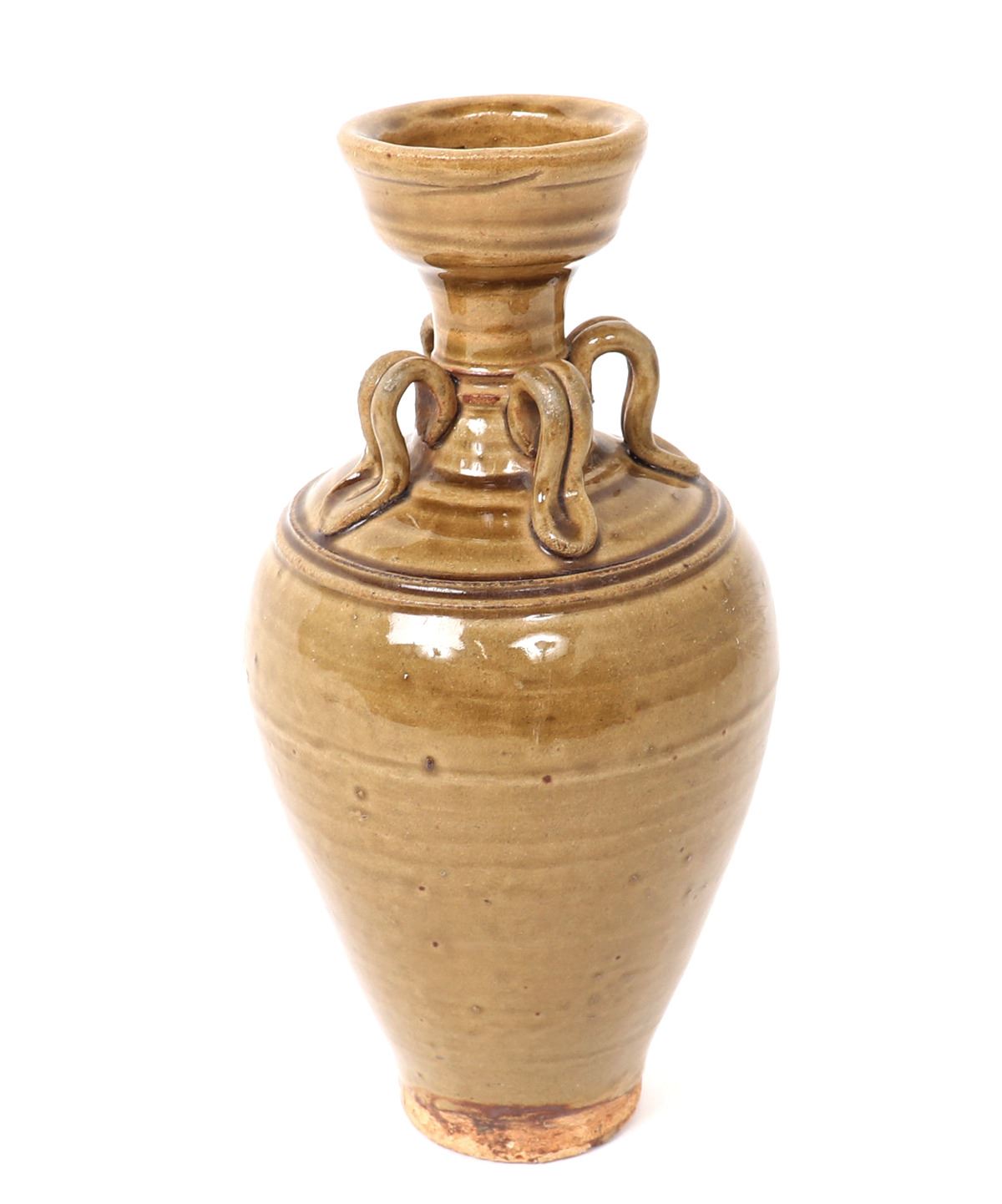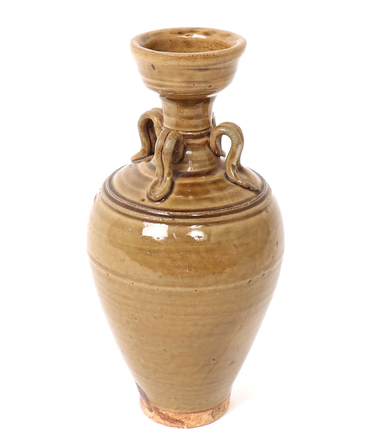 Lovely yellow glazed amphora shaped Korean porcelain vase. Four double banded arched suspension handles around the neck with incised banding to the shoulder, narrow corseted neck with wide flared rim and tall unglazed foot. Size 9 1/2" H. Condition: Overall very good condition with no obvious signs of restorations or repairs.