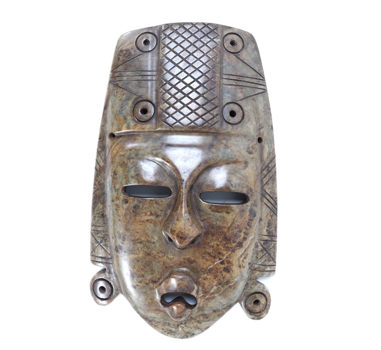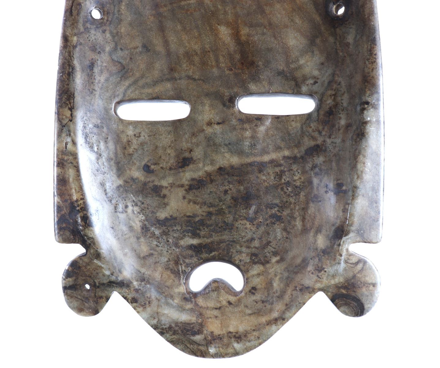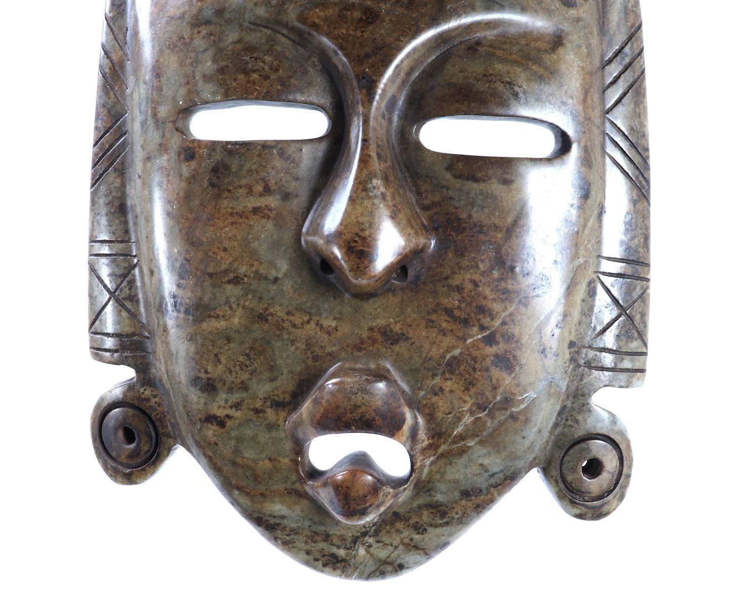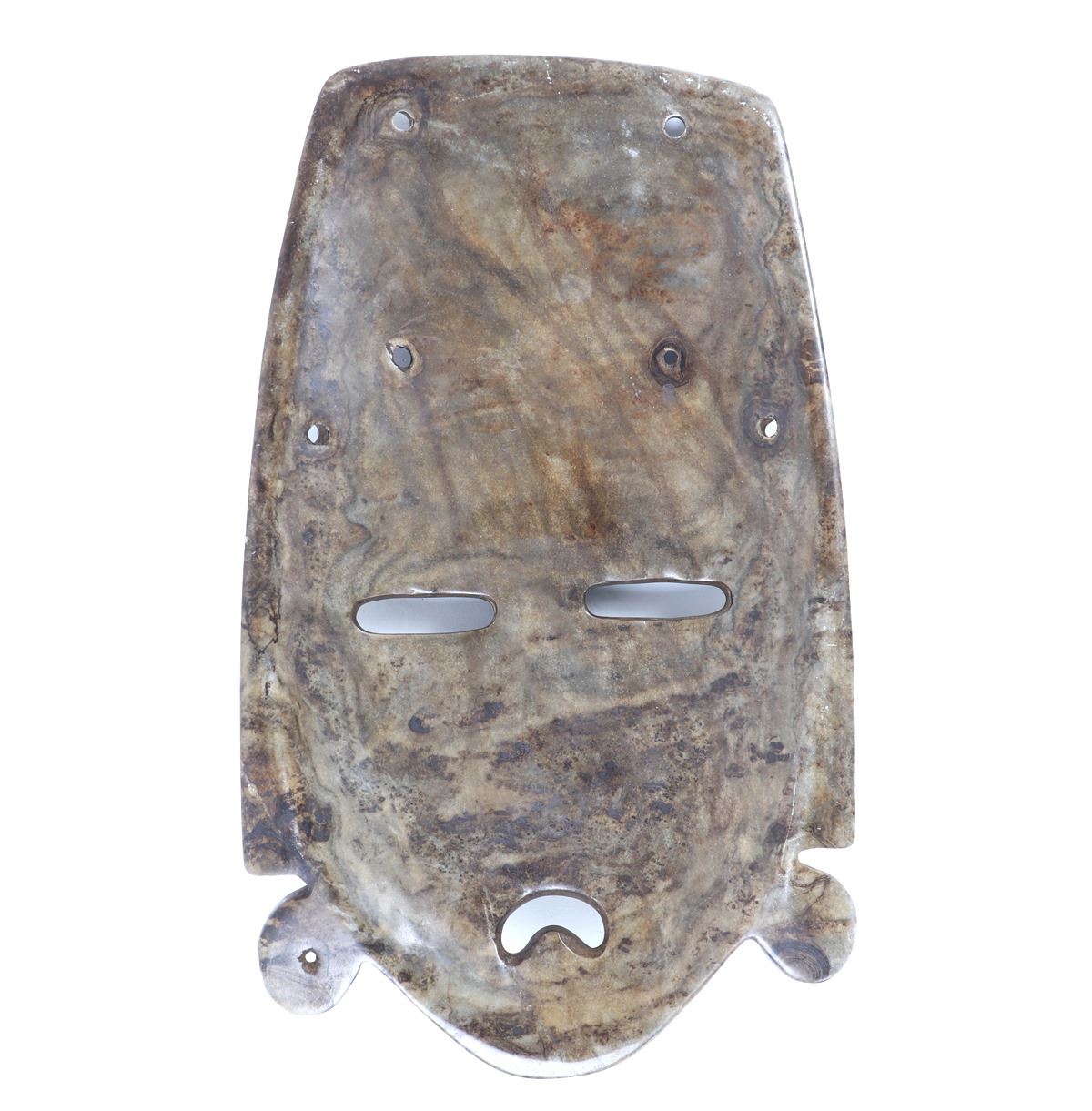 Lovely green and brown hardstone Chinese mask, carved from a single piece of heavy stone, possibly jade. Incised details to the elaborate style headdress, mouth and eyes slit open, the mask is depicted wearing earspools. Size 12" L, weight 2 lb. 7 oz. Condition: Good overall condition with no obvious signs of restoration or repair.