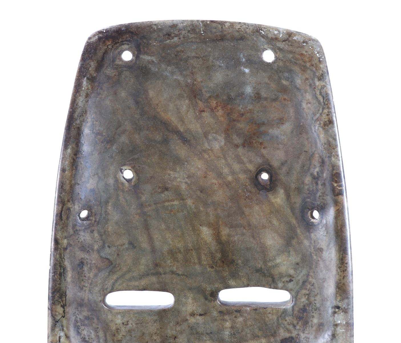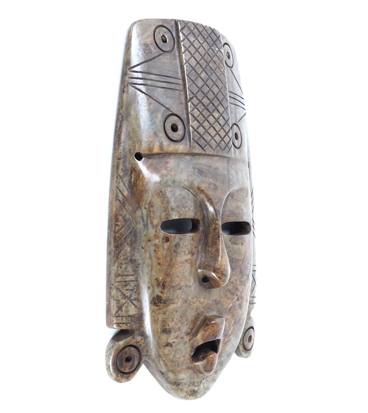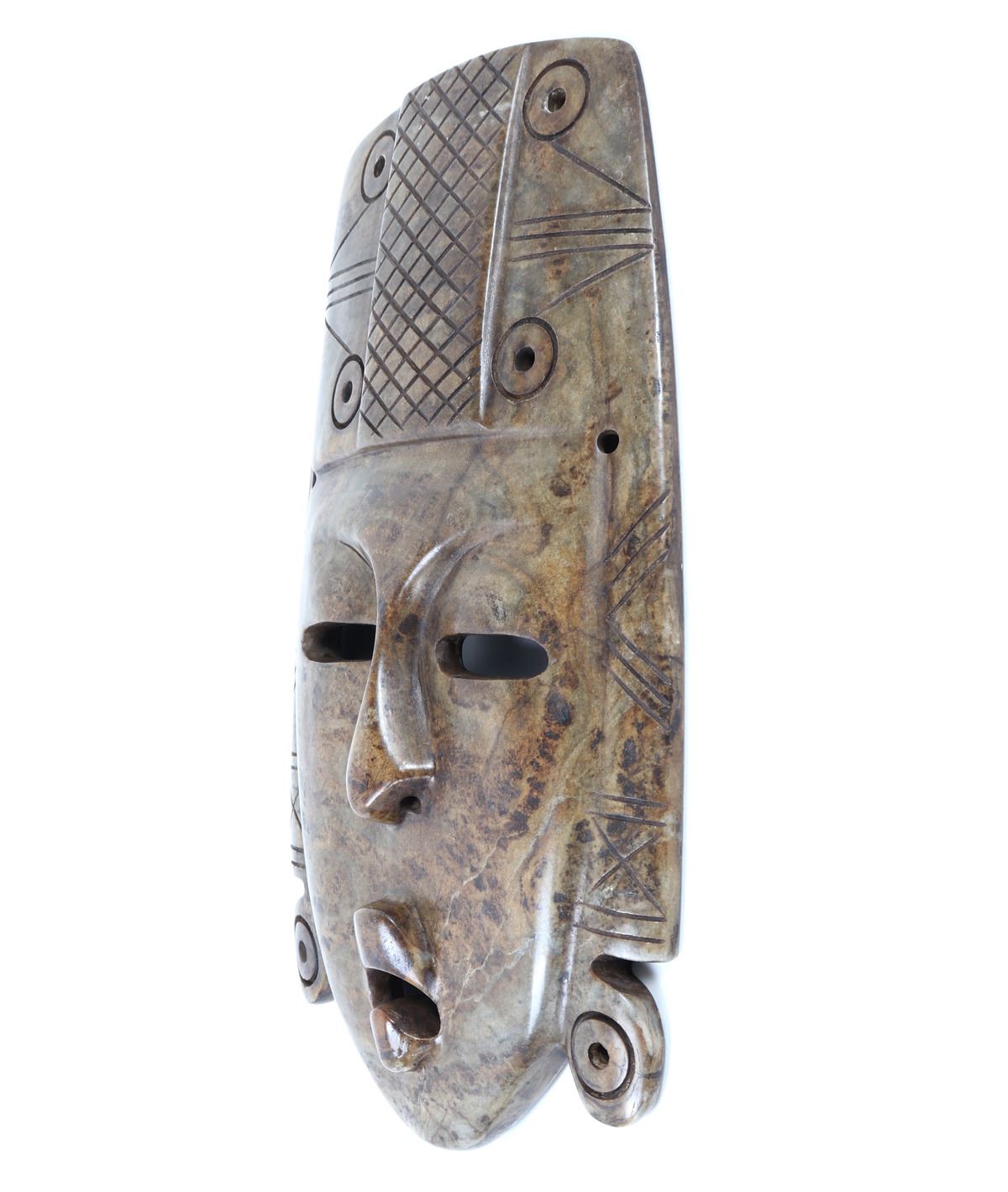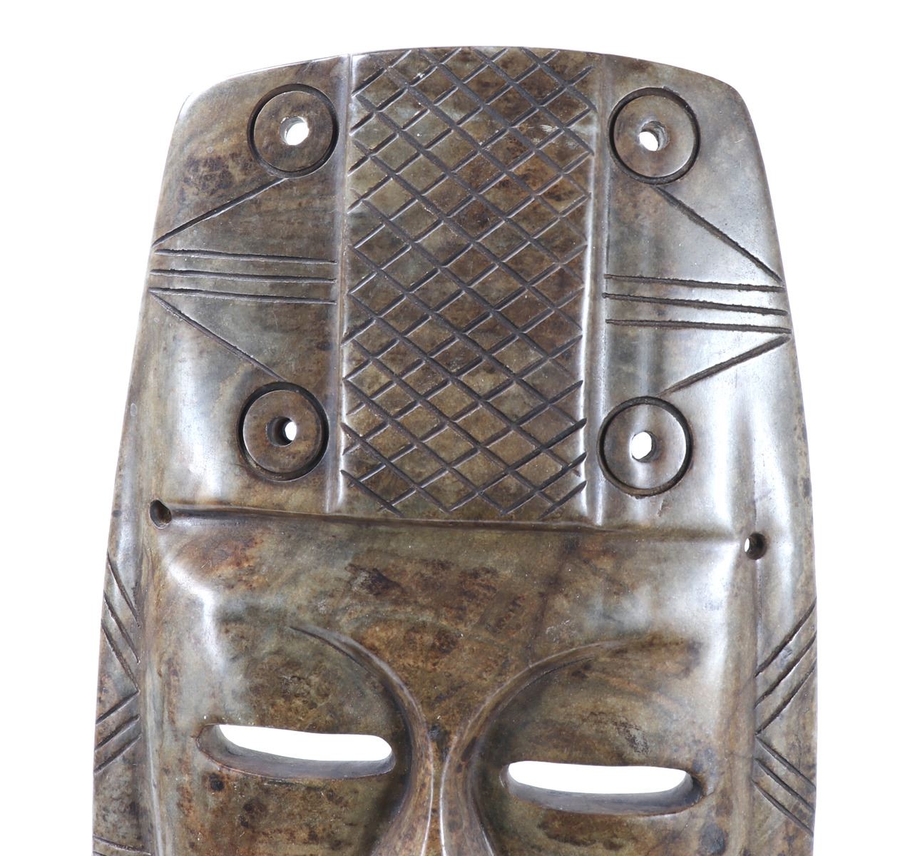 Lovely green and brown hardstone Chinese mask, carved from a single piece of heavy stone, possibly jade. Incised details to the elaborate style headdress, mouth and eyes slit open, the mask is depicted wearing earspools. Size 12" L, weight 2 lb. 7 oz. Condition: Good overall condition with no obvious signs of restoration or repair.