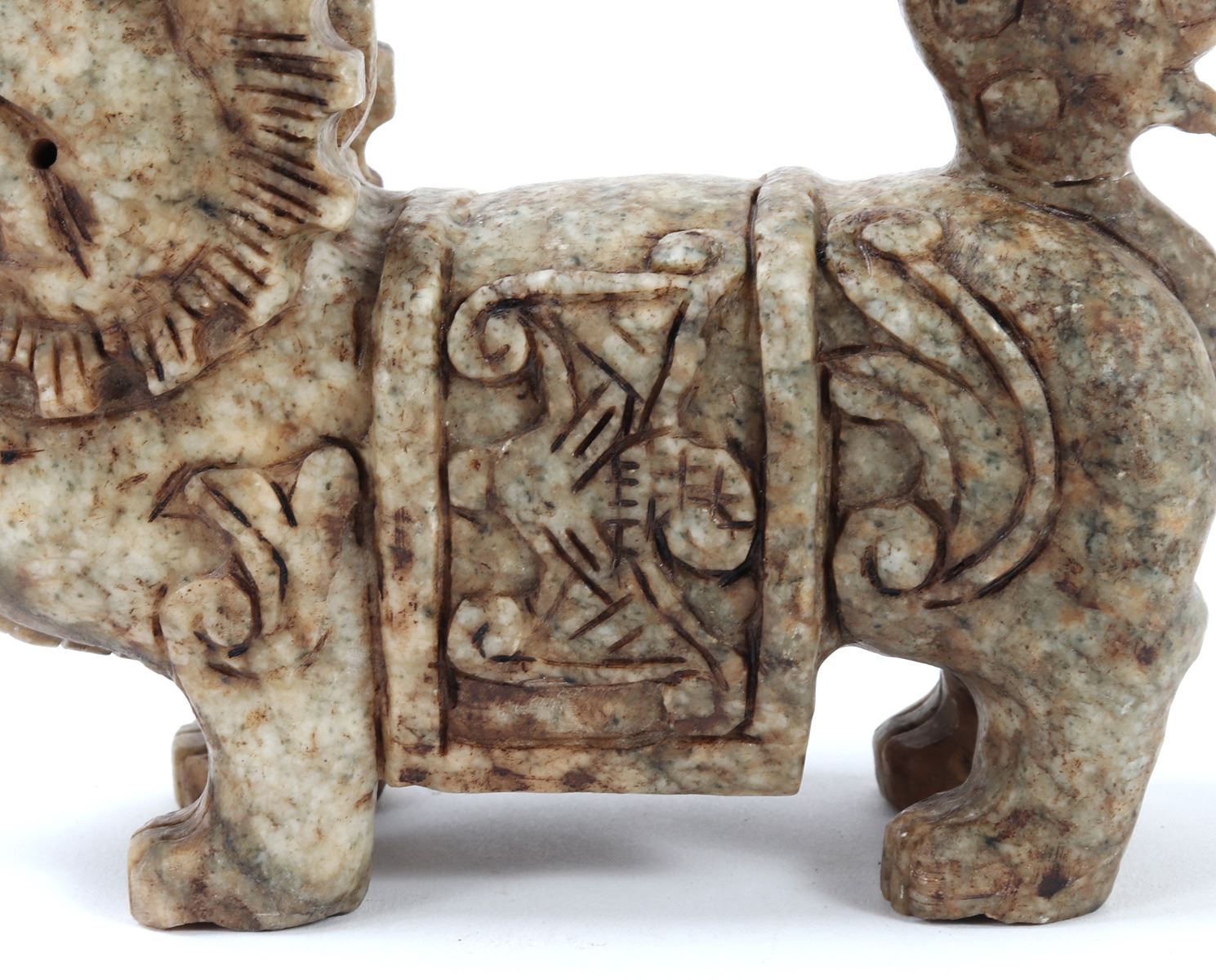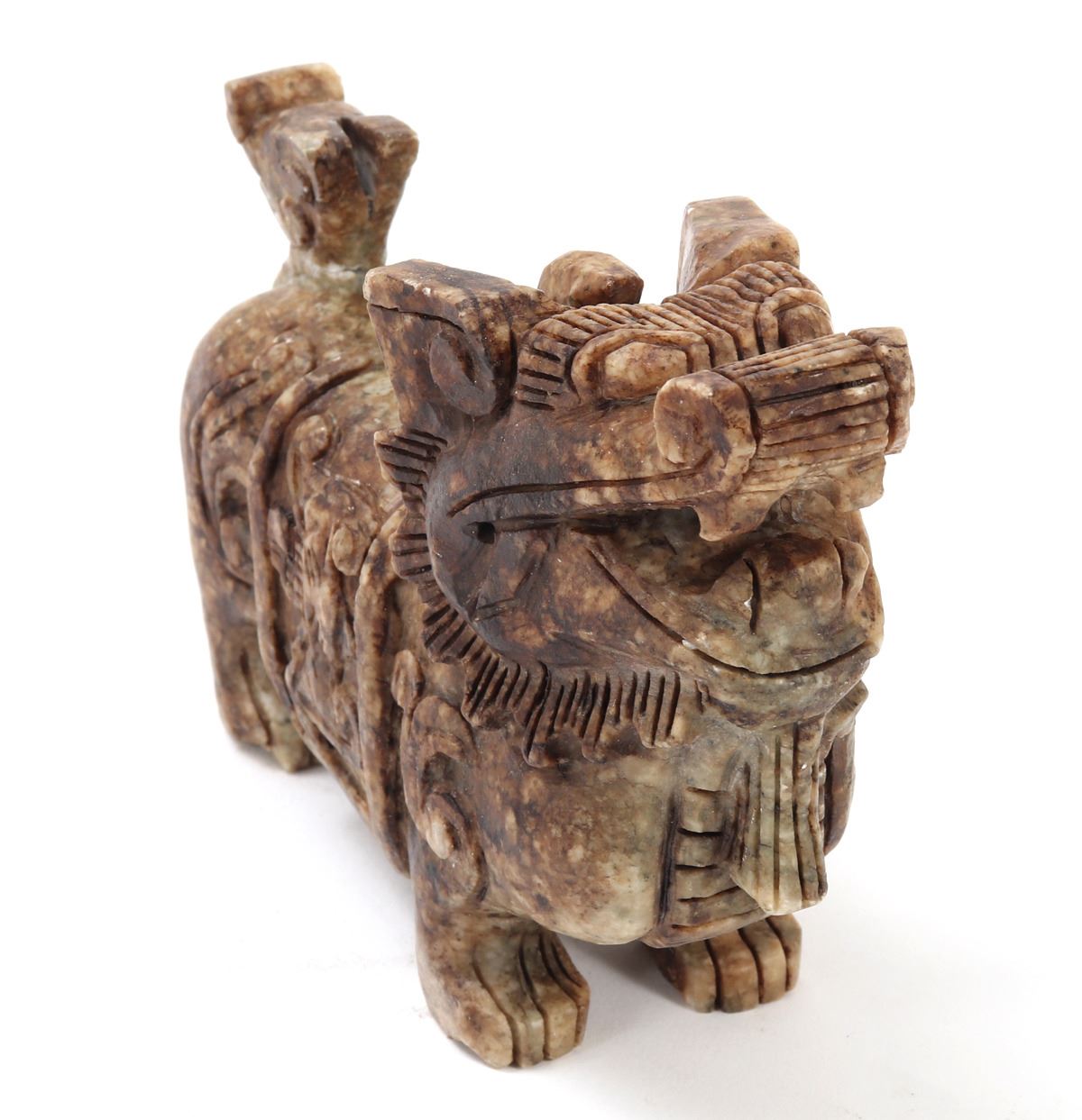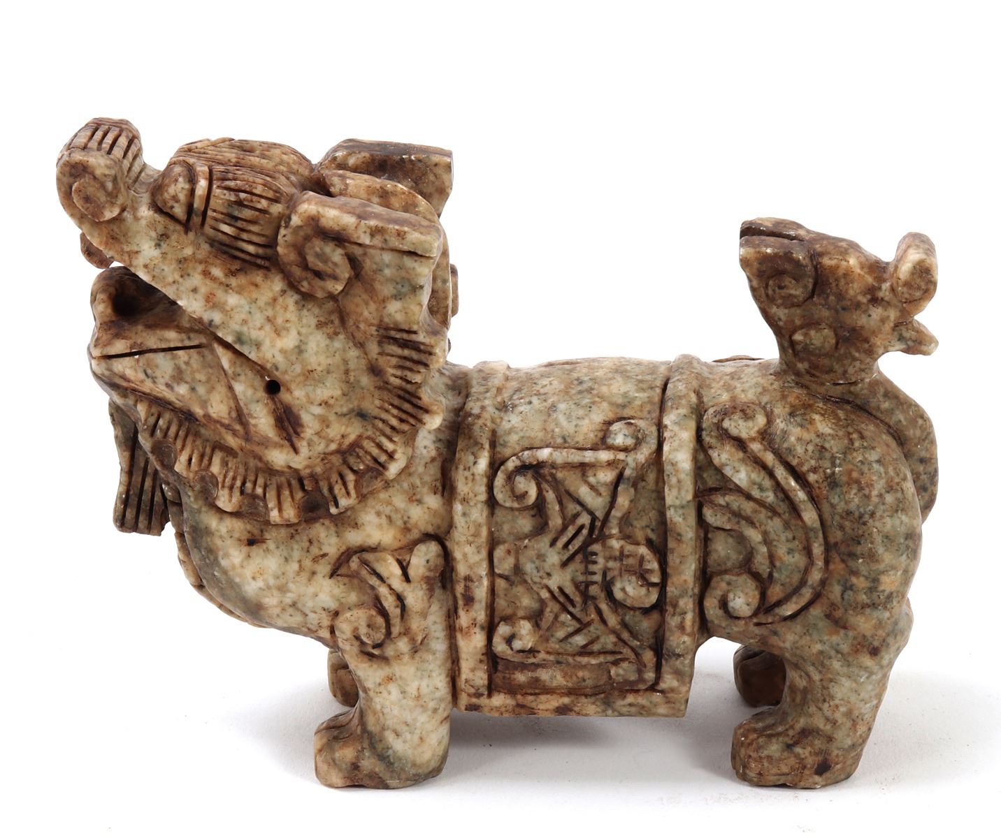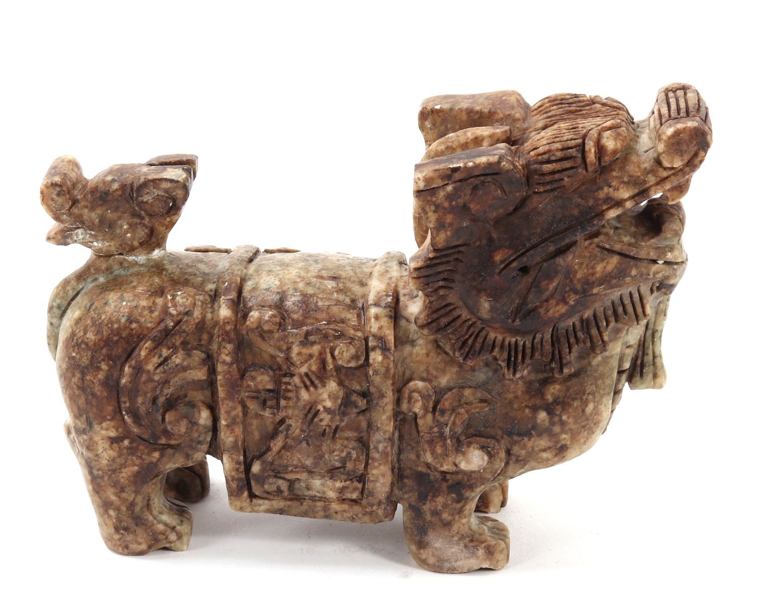 Nice Chinese soapstone carved foo dog or foo lion figure. Beautiful marbled green and brown soapstone with intricately carved details throughout. Foo dog is depicted standing tall and proud, tail high and mouth agape. Size 5 3/4" L, weight 2 lb.. Condition: Good overall condition with no obvious signs of repairs.
