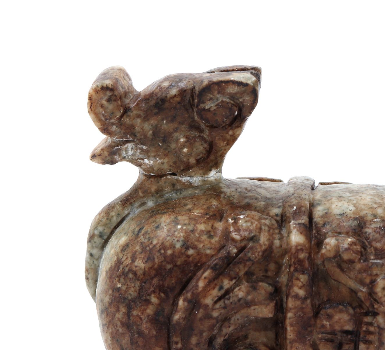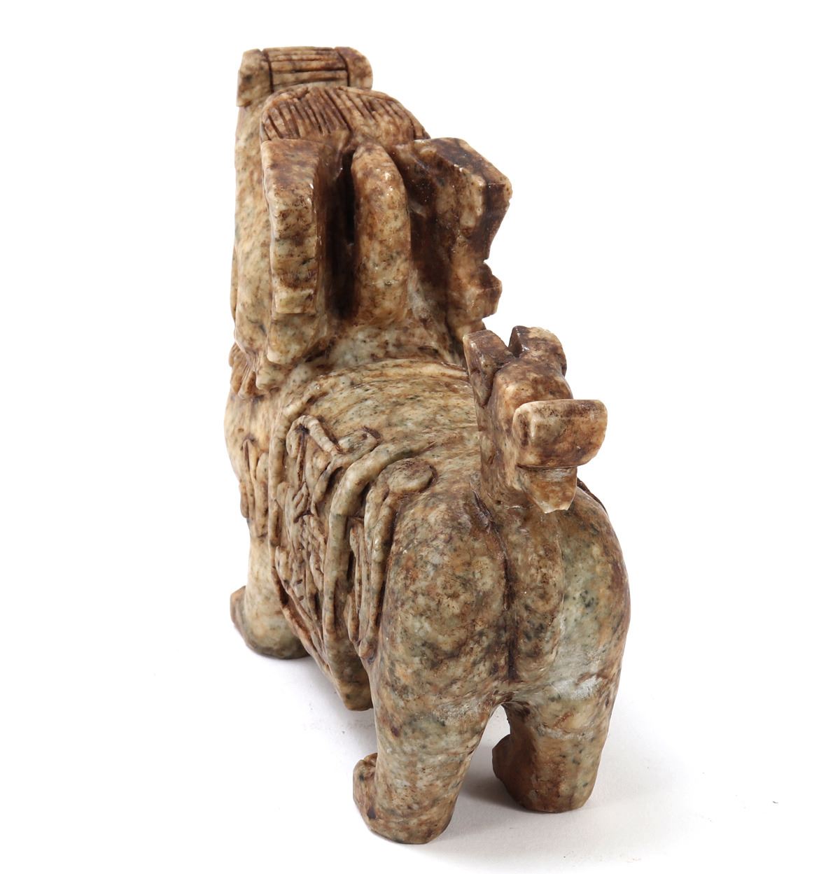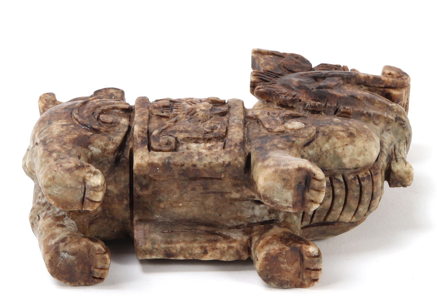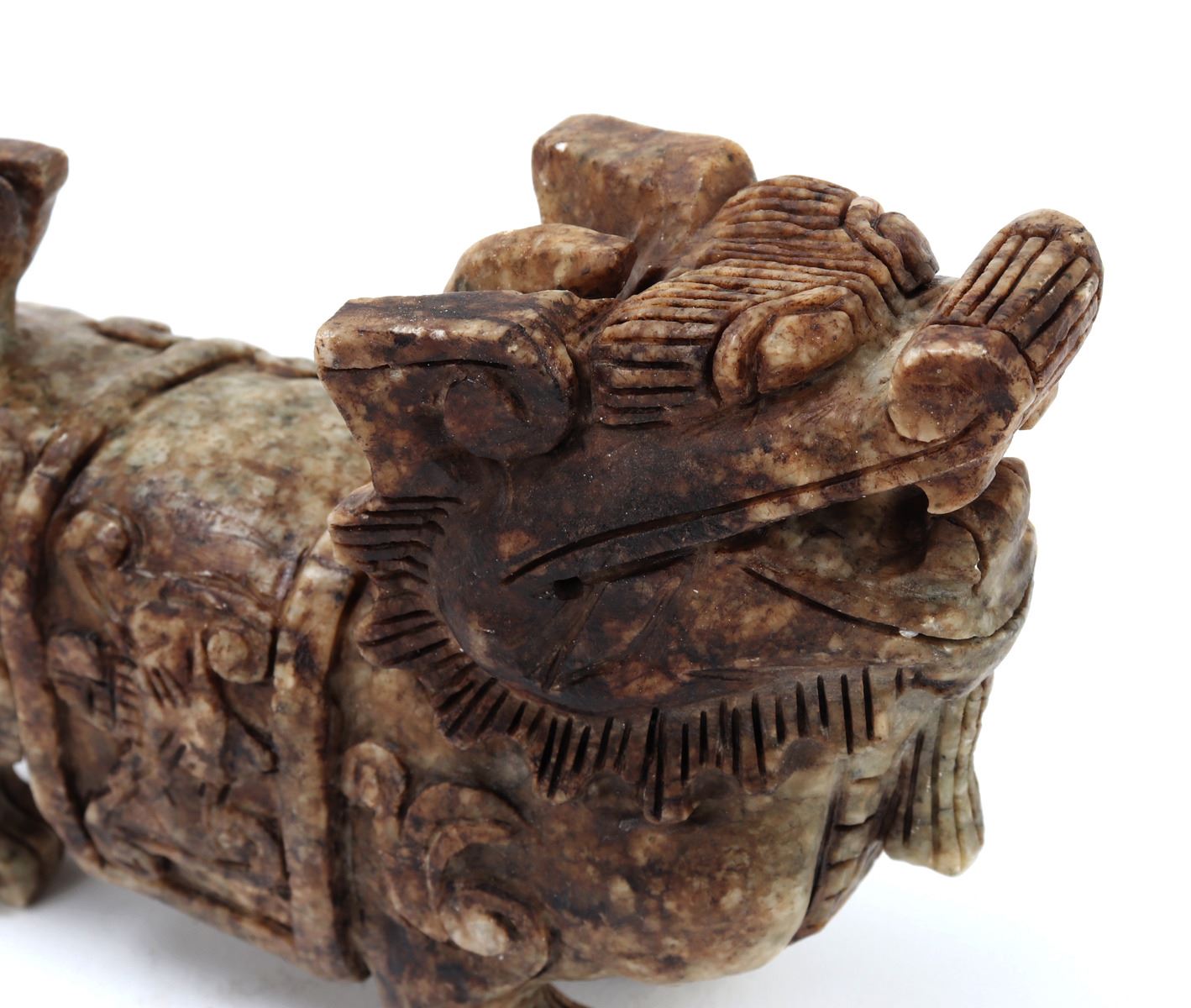 Nice Chinese soapstone carved foo dog or foo lion figure. Beautiful marbled green and brown soapstone with intricately carved details throughout. Foo dog is depicted standing tall and proud, tail high and mouth agape. Size 5 3/4" L, weight 2 lb.. Condition: Good overall condition with no obvious signs of repairs.