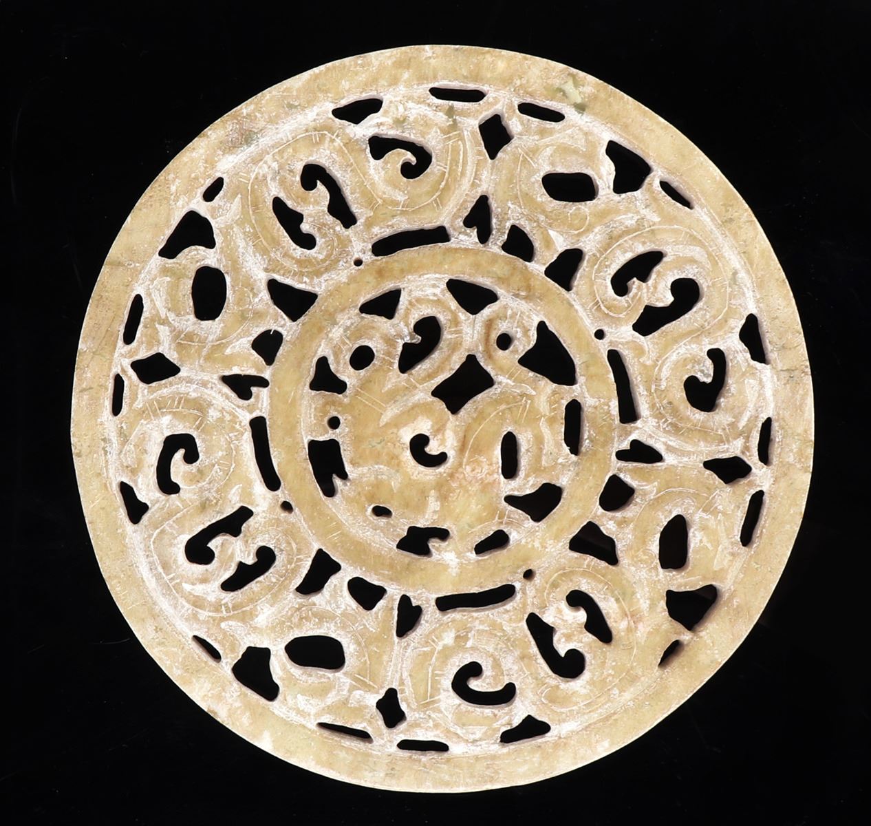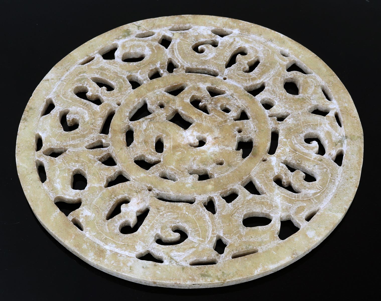 Chinese intricate openwork bi-disc carving, depicting zoomorphic beasts to the center and outer rim. Incised details to the animal bodies acting like scales on the skin. Lovely light green and white mottled stone. Size 7 7/8" W, weight 439 g. Condition: Good overall condition with some surface wear as shown.
