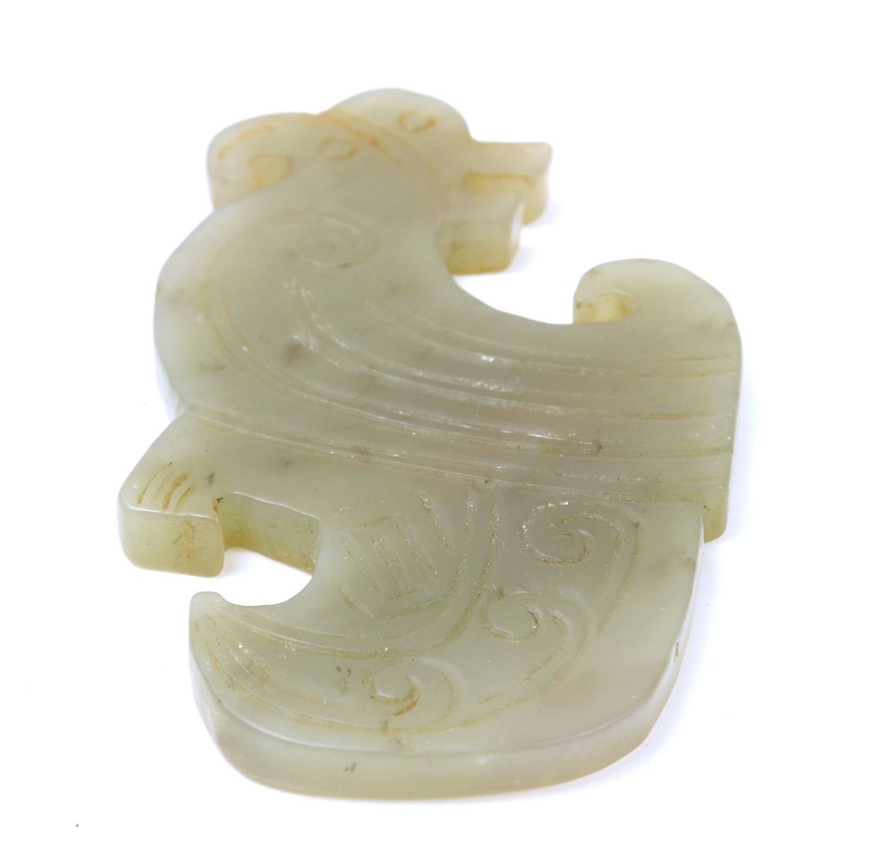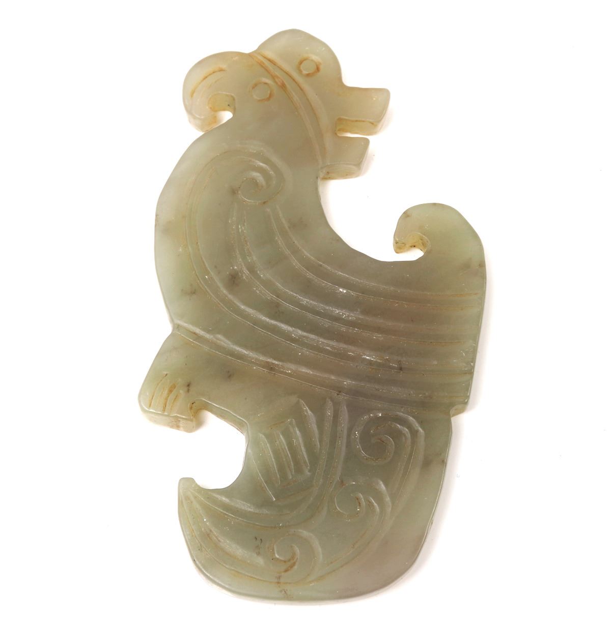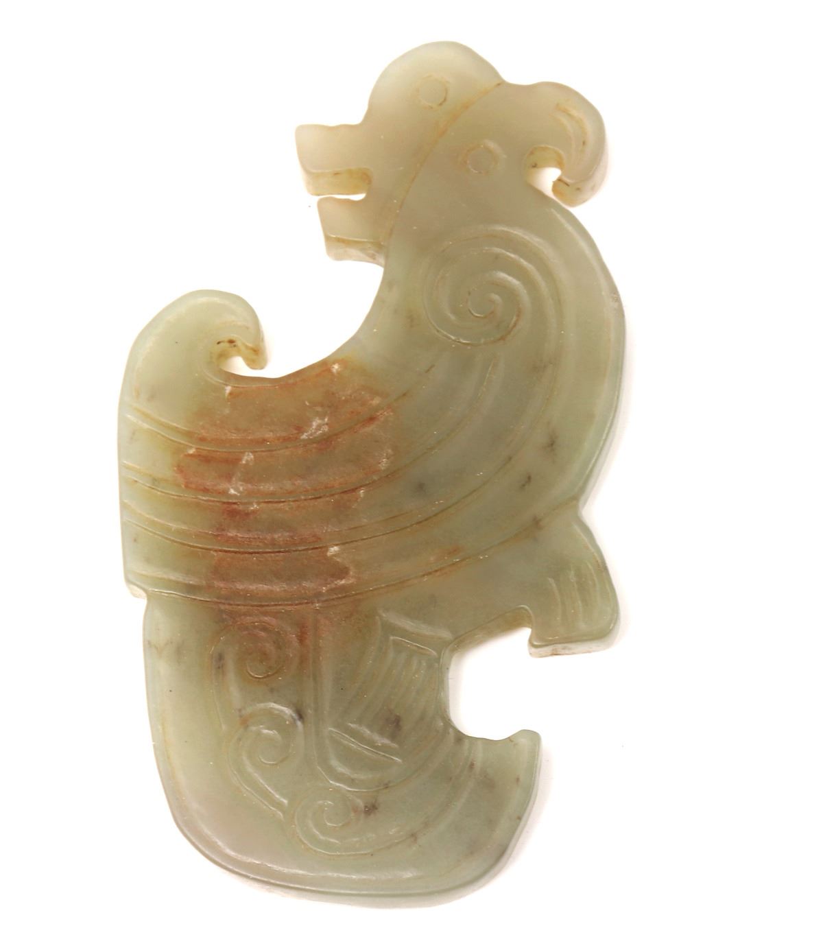 Chinese jade style stone carved archaistic bird carving in a marbled light green stone with a red earthen deposit discoloration to one section. Size 2" L x 4" W weight 104g. Condition: Overall good condition.
