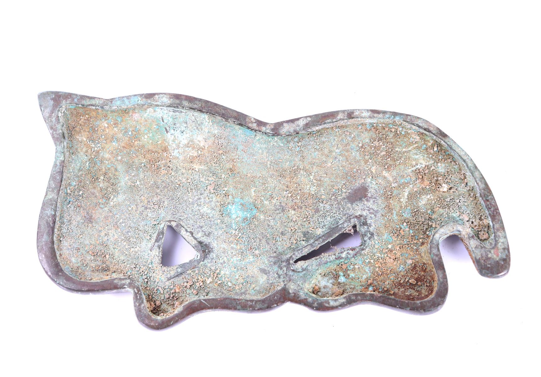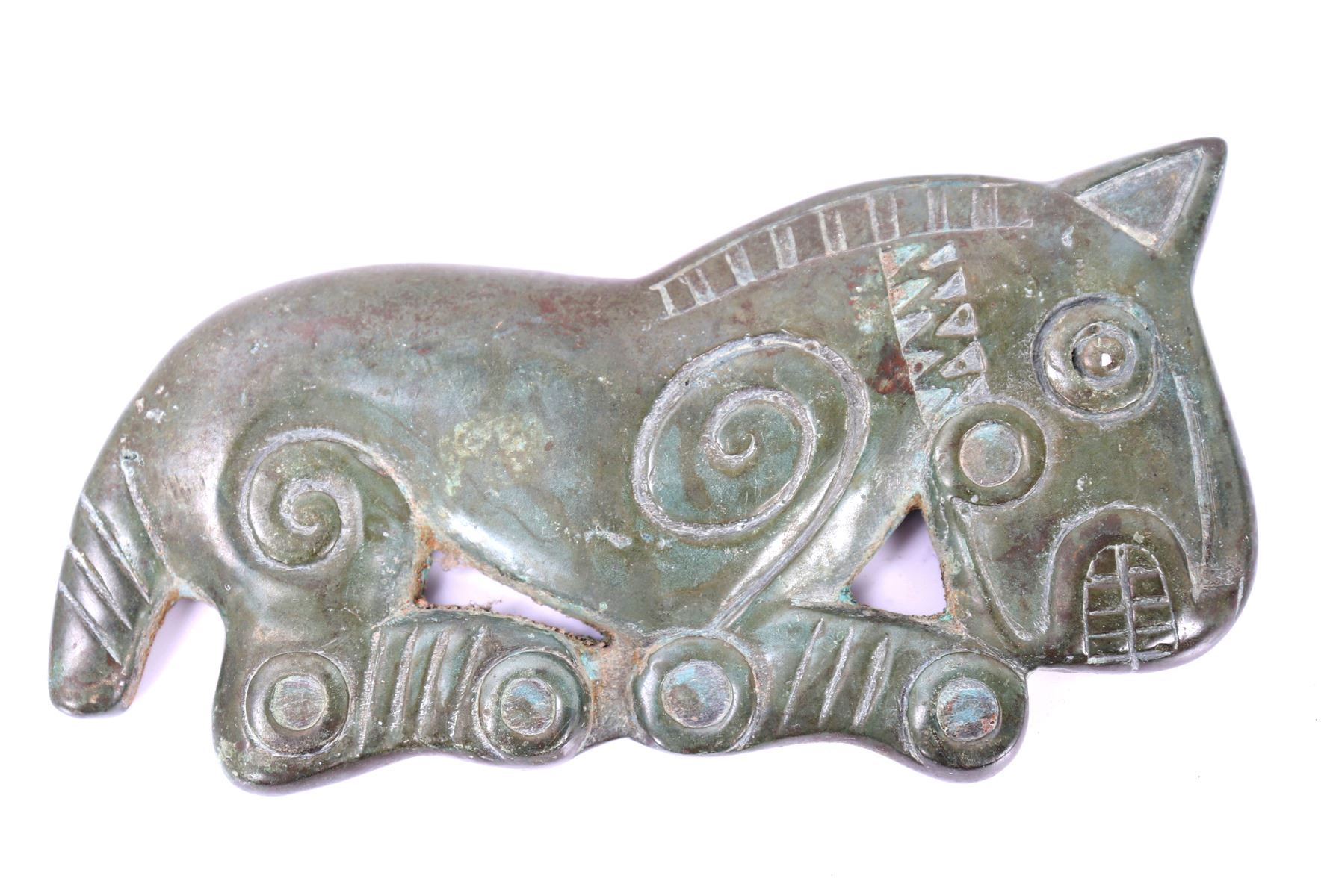 Chinese bronze archaistic horse plaque. The horse is depicted seated with his teeth showing, incised details to his main, wearing a horse bit, and incised designs to his legs, with a twisted bobbed tail. Size 4 1/2" L x 2" W, weight 168g. Condition: Good overall condition.