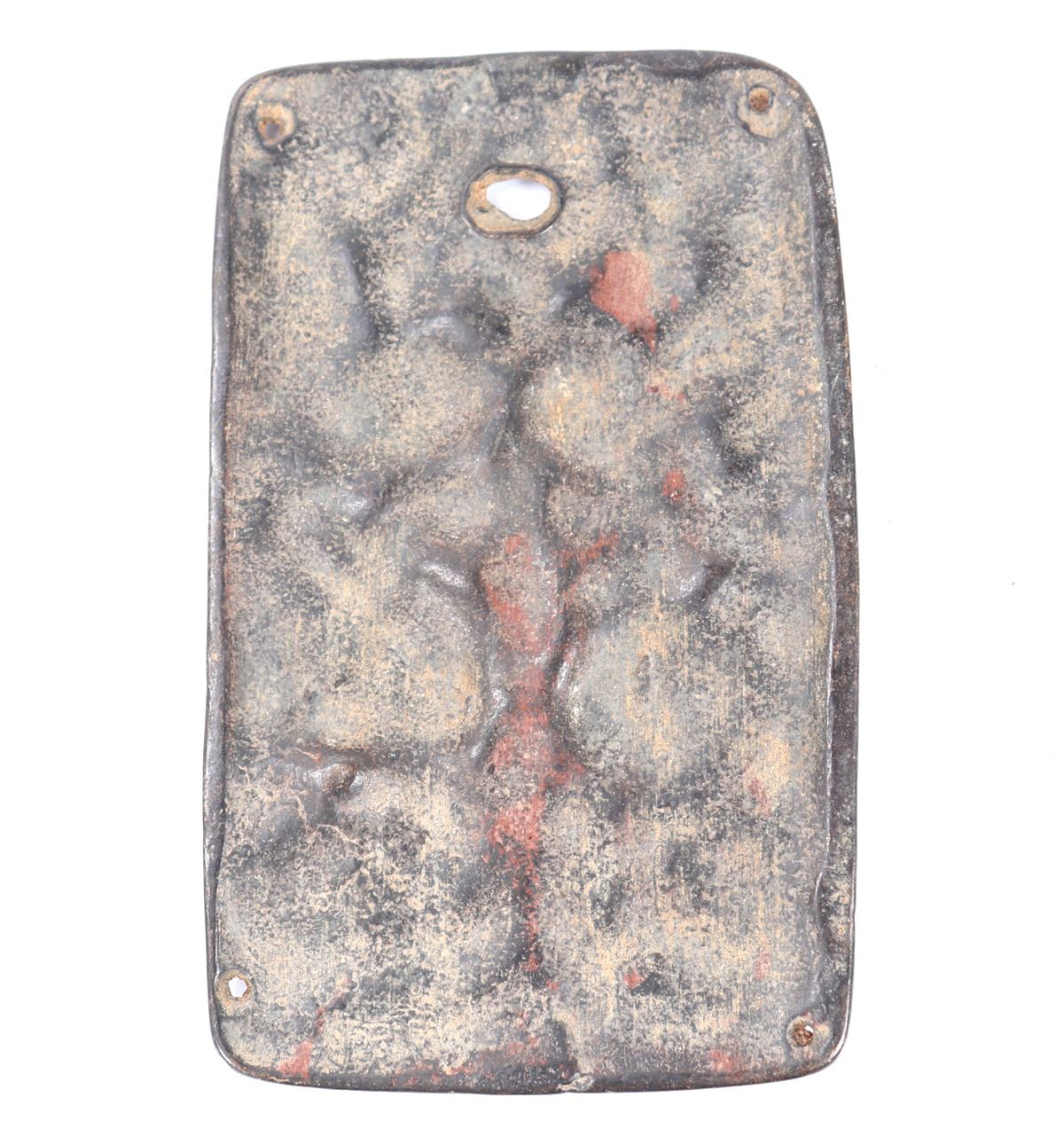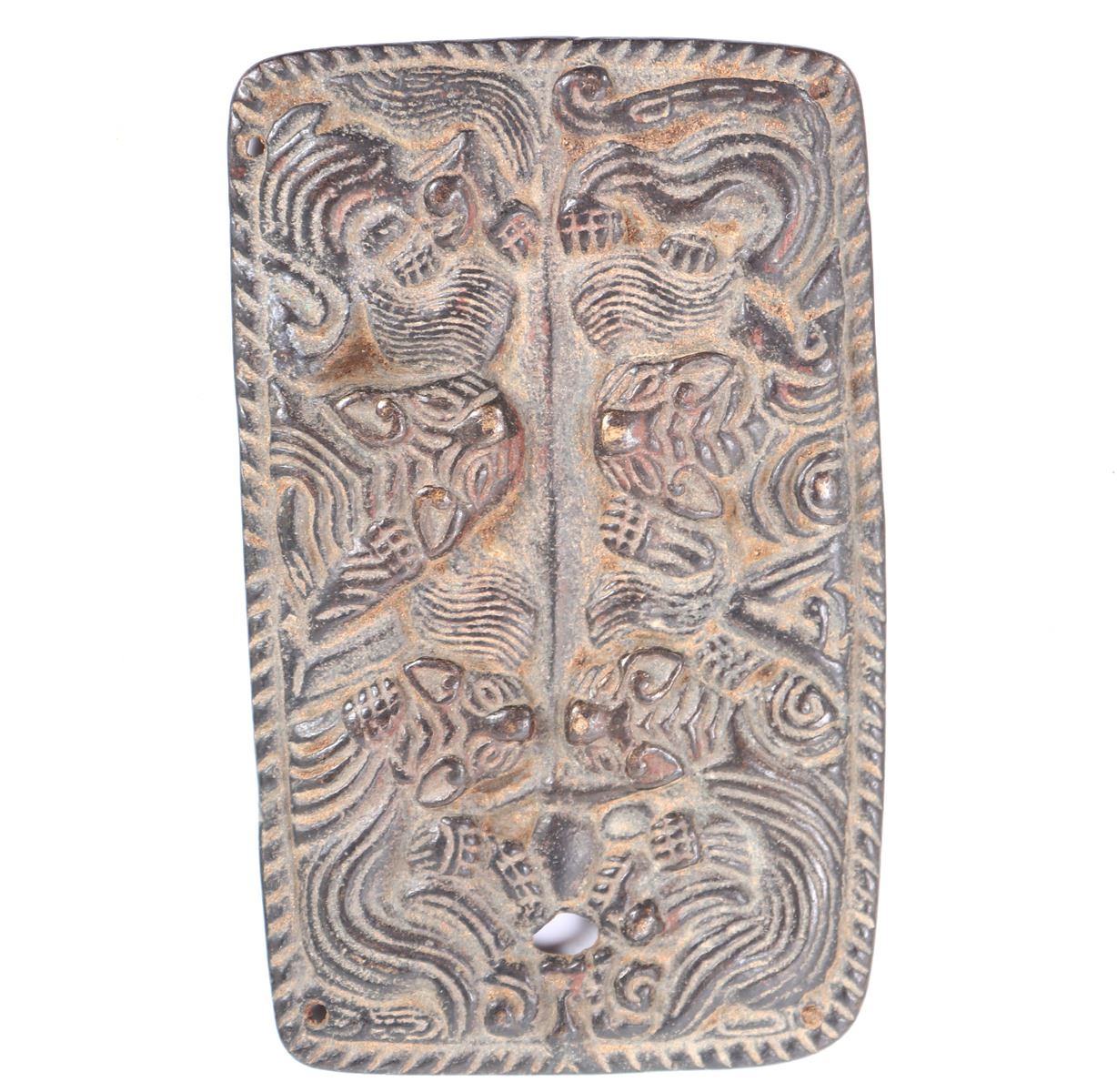 Chinese bronze plaque intricately decorated throughout with a twisted rope design boarder and resting recumbent jaguars to the center. Pierced at all four corners for securing to a bag or clothing. Size 4" L x 2 /12" W, weight 118g. Condition: Hole to the face as shown, else in overall good condition.
