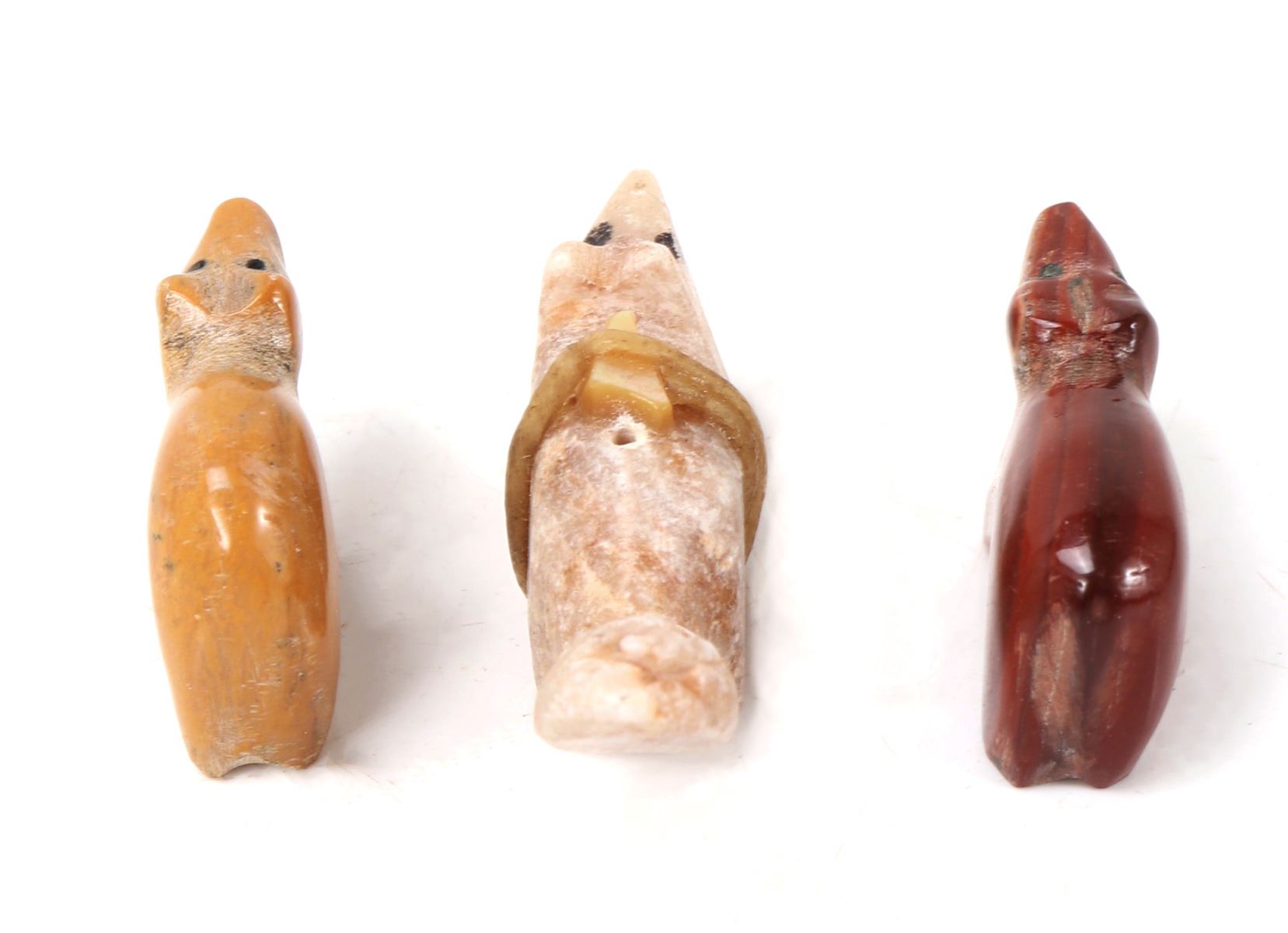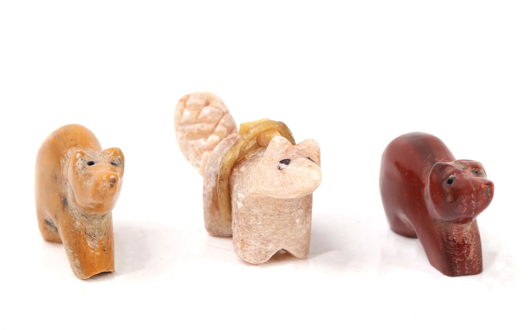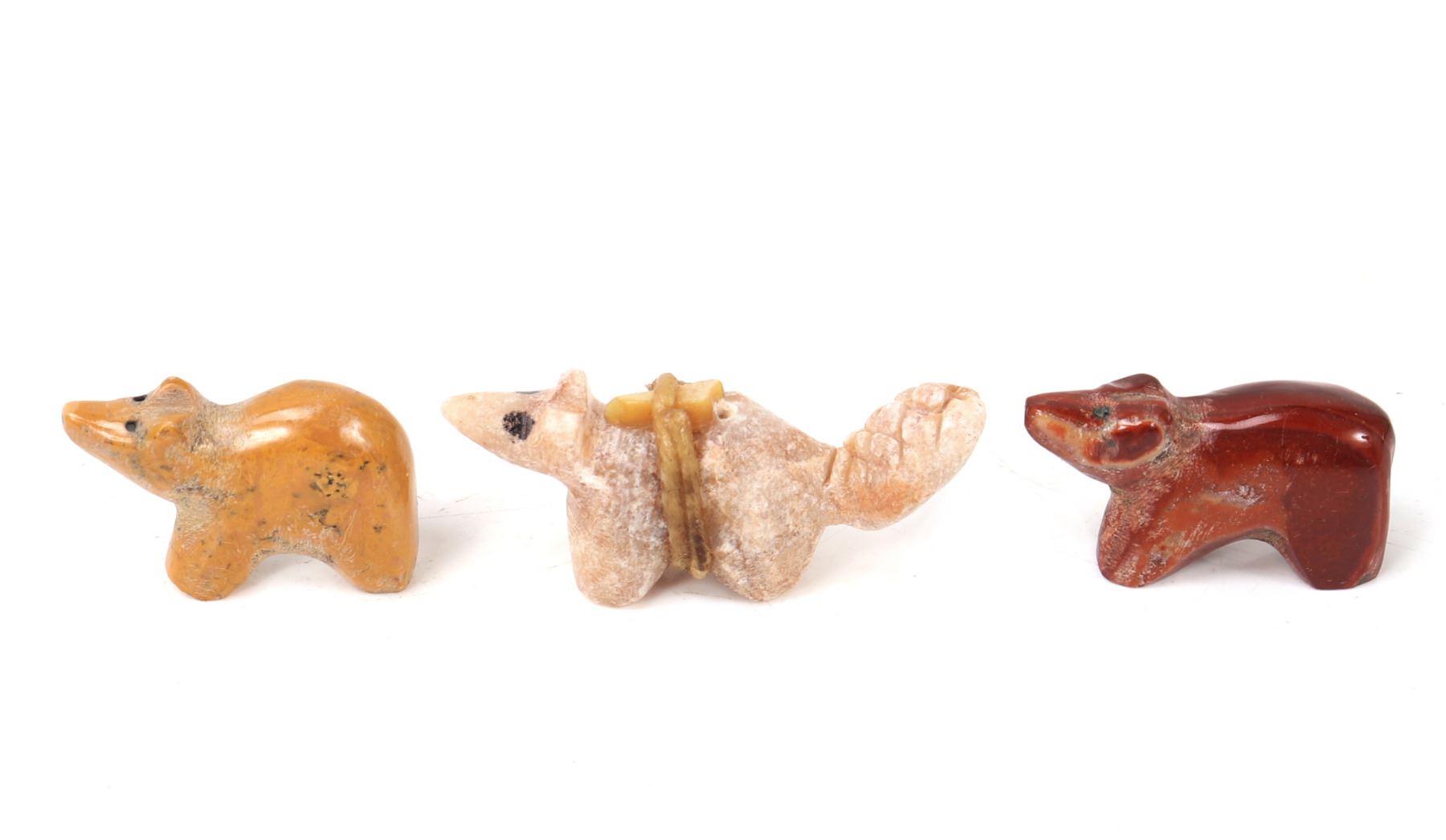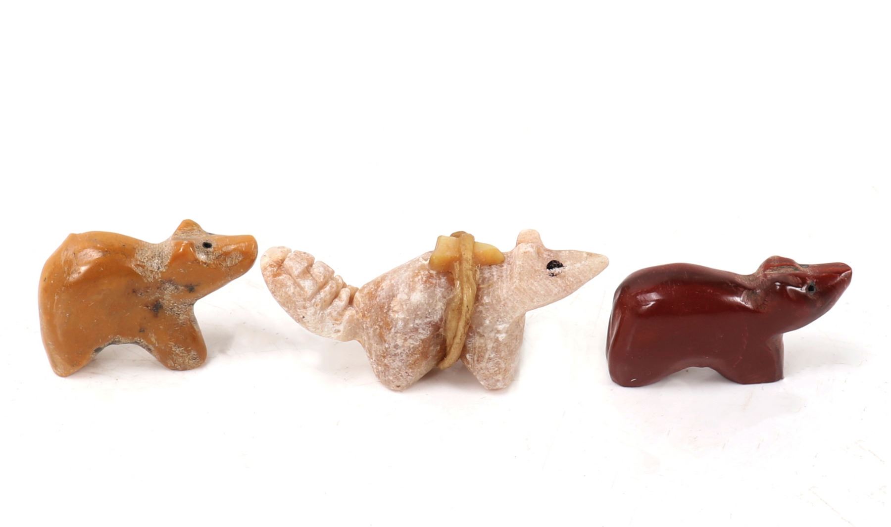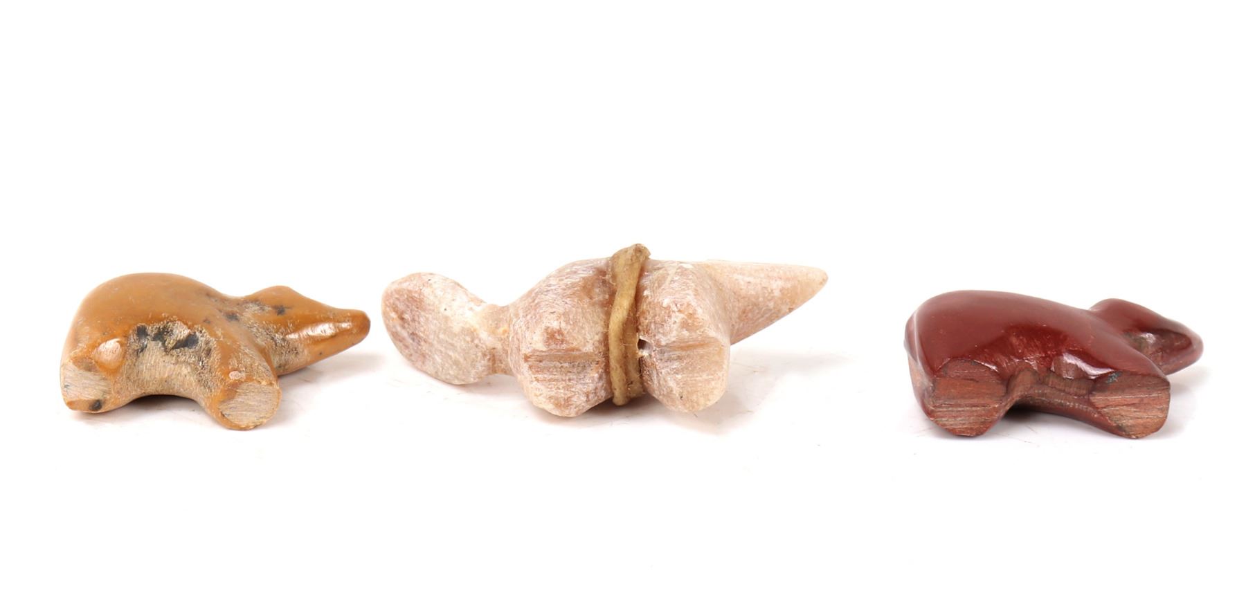 Lovely Native American hand carved stone Zuni fetish figured in a bright orange, marbled pick, and blood red stones. Black pigment acts as the eyes of each fetish. Size of each 2" W. Condition: Good overall condition throughout.