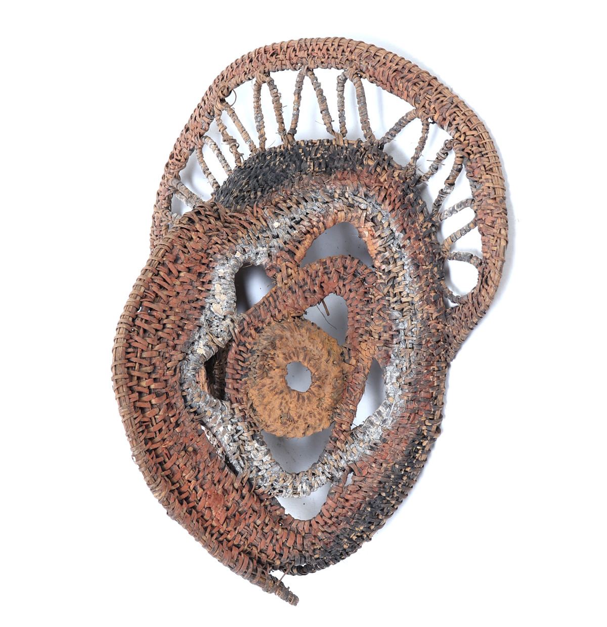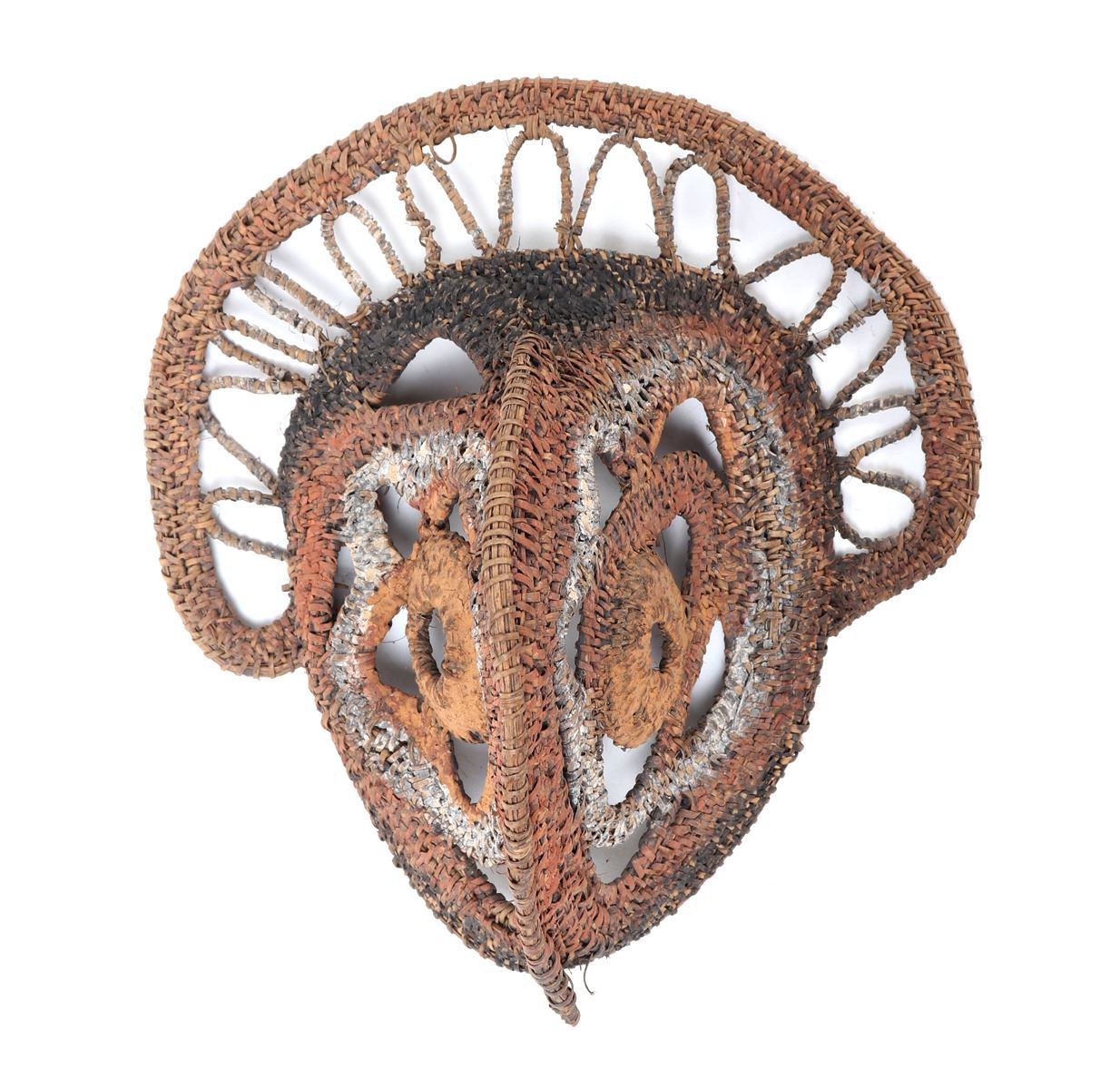 20th century, Abelam people, Papua New Guinea. Hand crafted and expertly detailed ceremonial yam mask with orange, red, and black pigment throughout. Avian face with a woven halo. Masks such as these were used in ceremonies to honor yams, which are considered and often treated like living ancestors or prestige objects. Size 9 1/4" L. Condition: Good overall condition with minor losses to pigments.. Provenance: Collected prior to 2008, ex-Lacy Gallery (Vanna & Lee Lacy collection), Los Angeles CA. Lacy Gallery was founded upon six decades of collecting ethnographic and fine art. Lee Lacy was a distinguished Hollywood producer of iconic TV series and commercials.