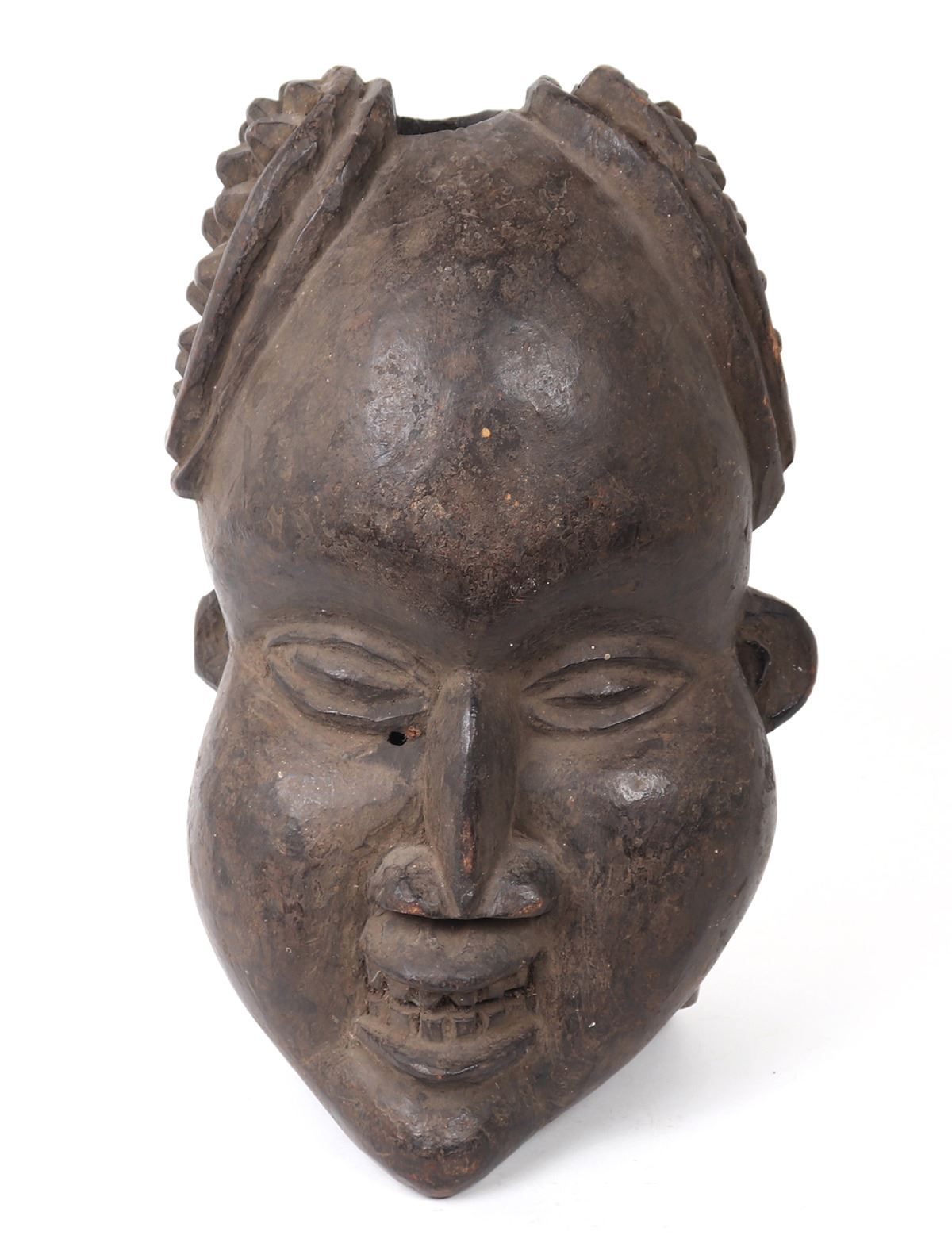 Central Africa, Cameroon, Grassfields Kingdoms of Cameroon, Ngambe, Bangwa or more specifically probably the Bamoun peoples or Kingdom of Bamoun head / helmet mask. Hand carved mask depicts a pleasant, smiling face with puffy cheeks, hair in two buns on either side of the head. Carved in hard and dense wood in the stylistic form of an ancestor. Size: 18" H, 12 1/4" W. Condition: Commensurate with age and use.. Provenance: Collected 1975. Family collection of an esteemed diplomat and ambassador amassed during travel and work circa 1960-1990s in the medical field providing charitable advanced medical care throughout the African continent and internationally.