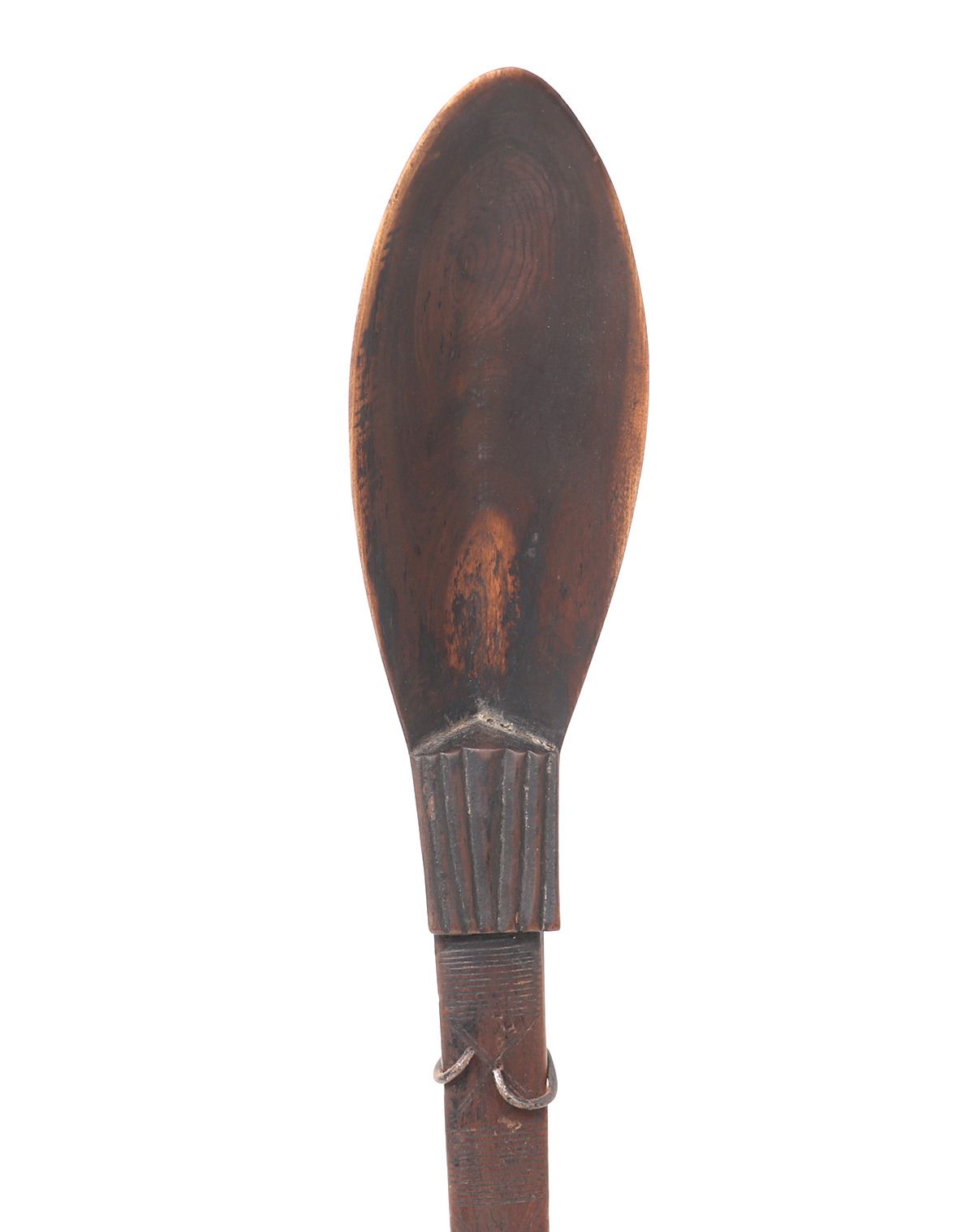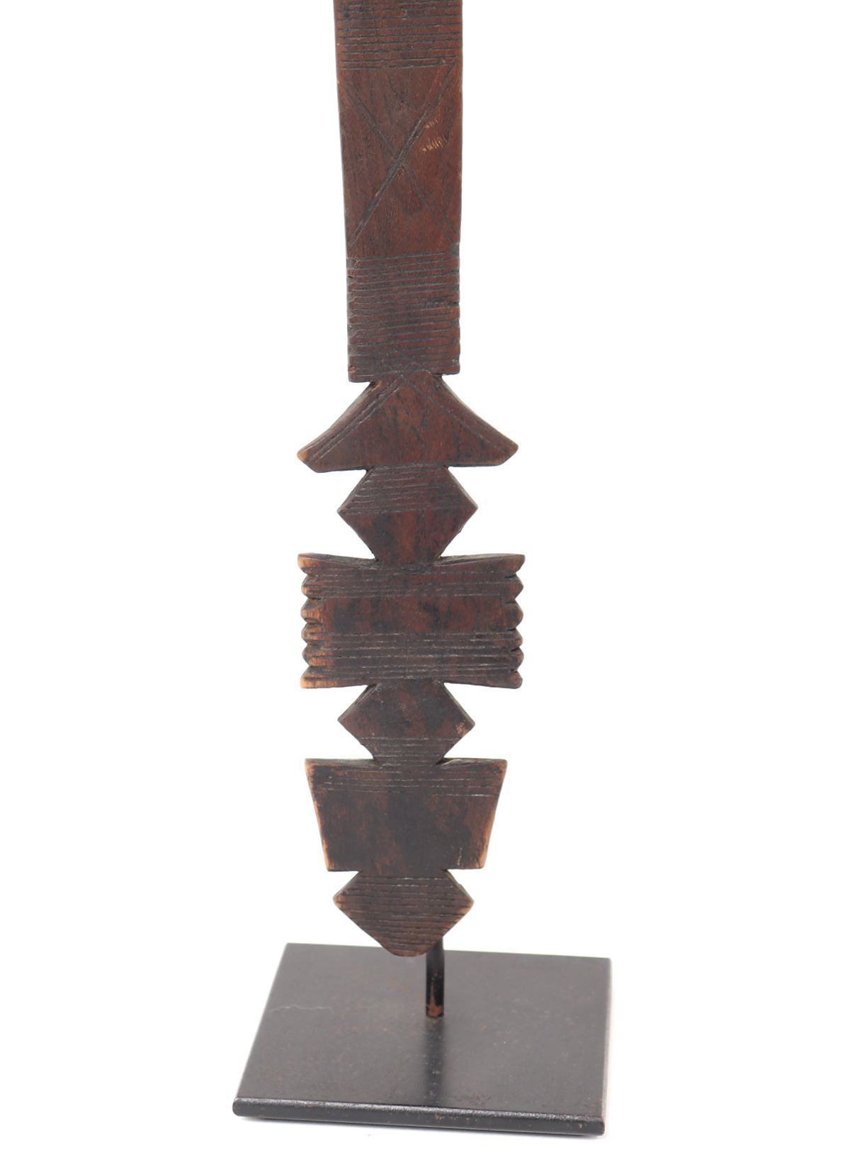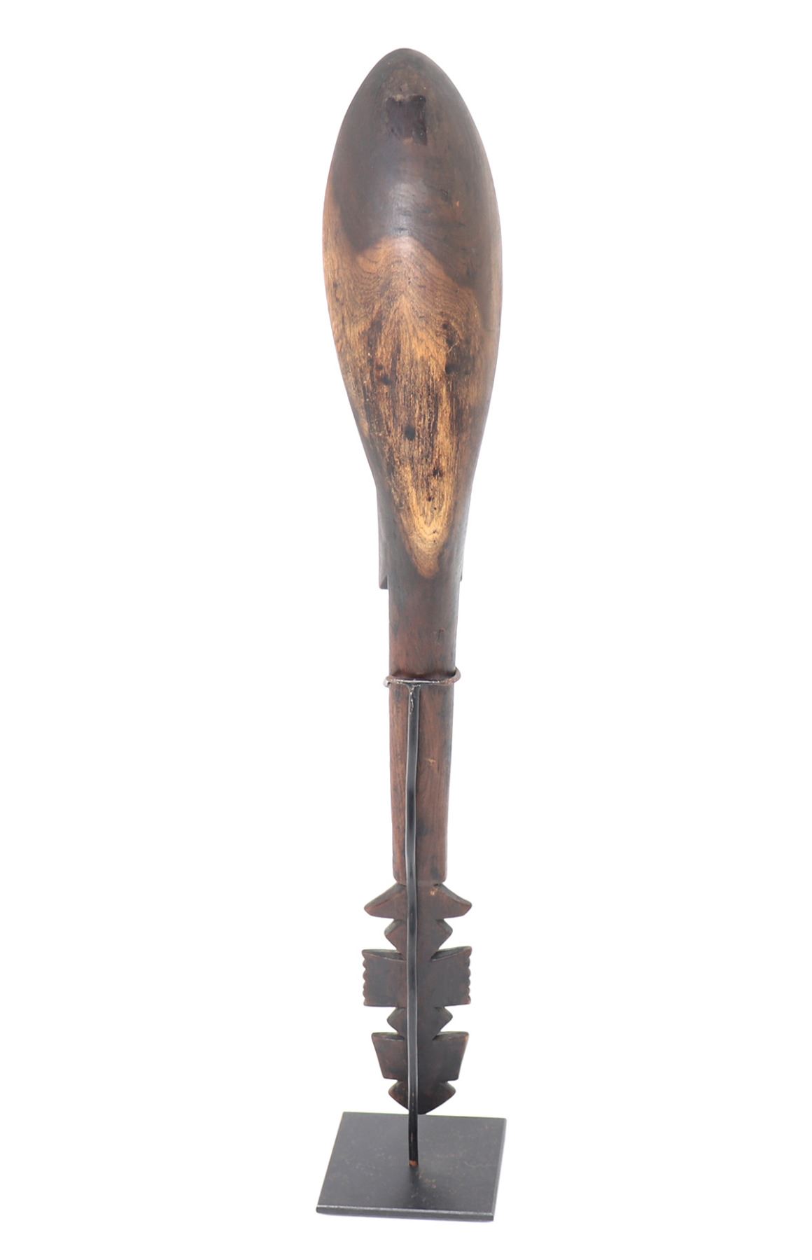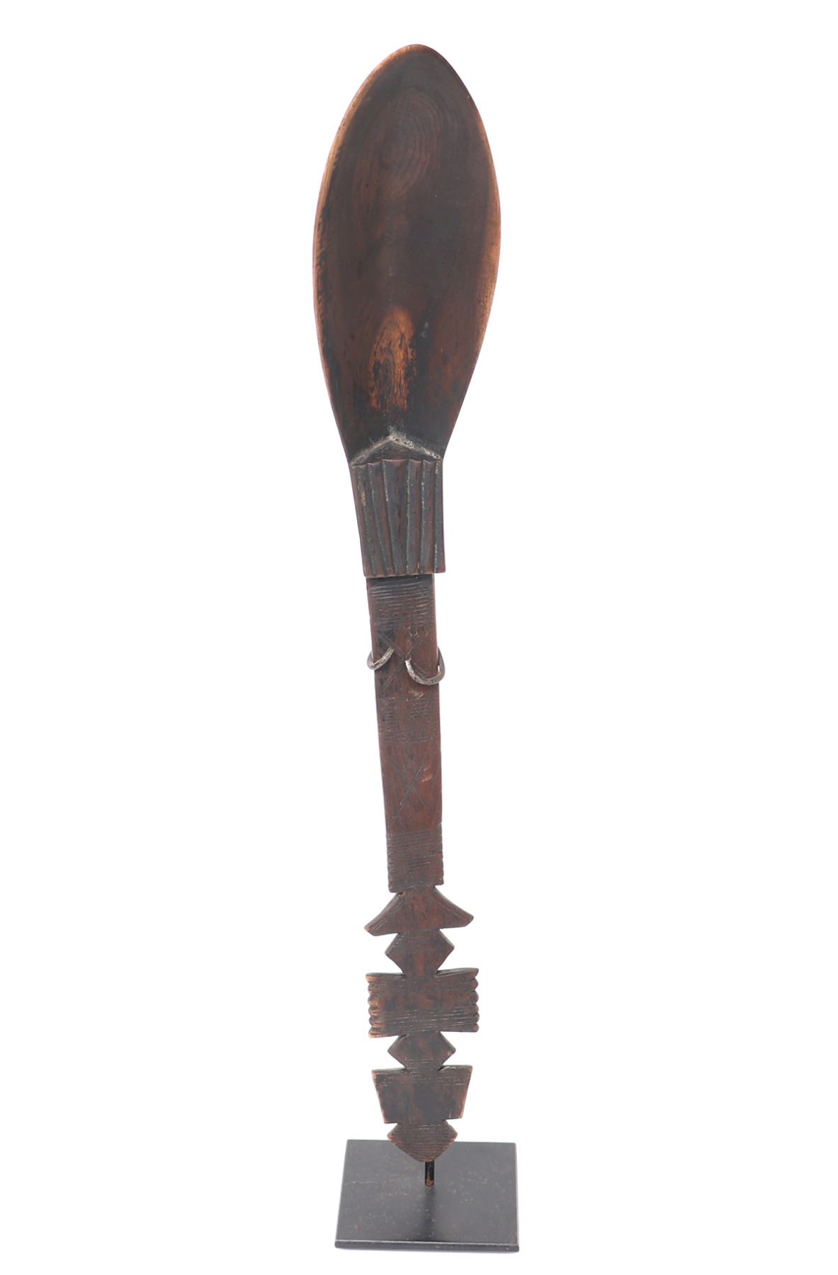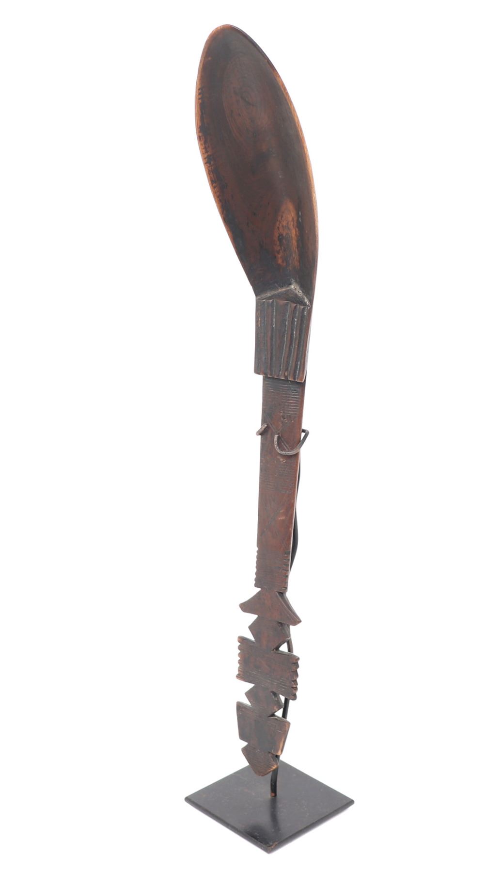Fanta, West African carved wood spoon or ladle. Handle is carved in a lovely geometric designs with striations throughout. Shallow and narrow pointed scoop is finely smoothed and polished for use. Size 17 3/4" H, included on custom stand.. Condition: Good condition throughout with minor wear commensurate with age.