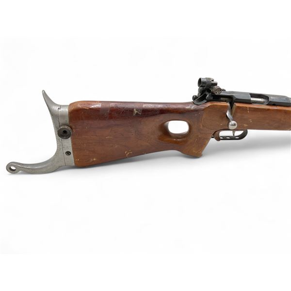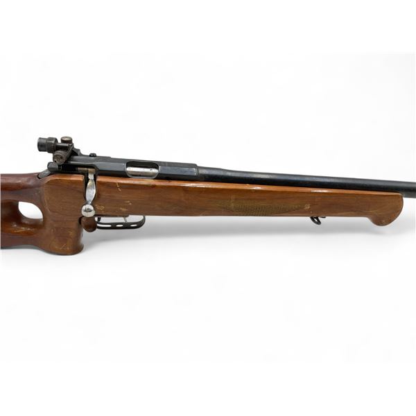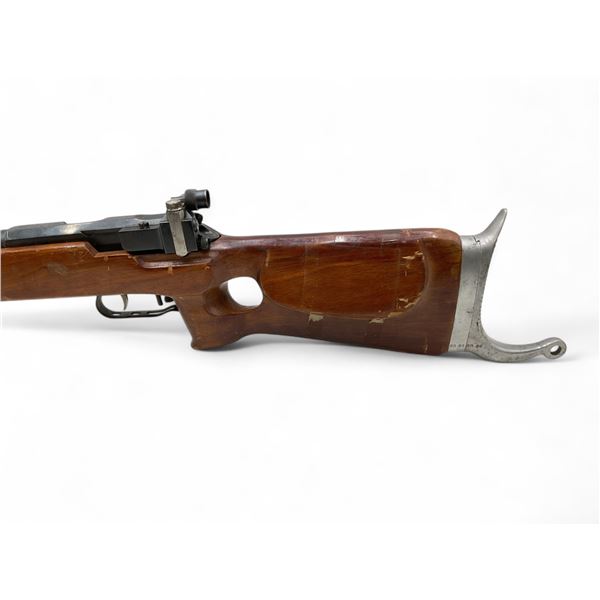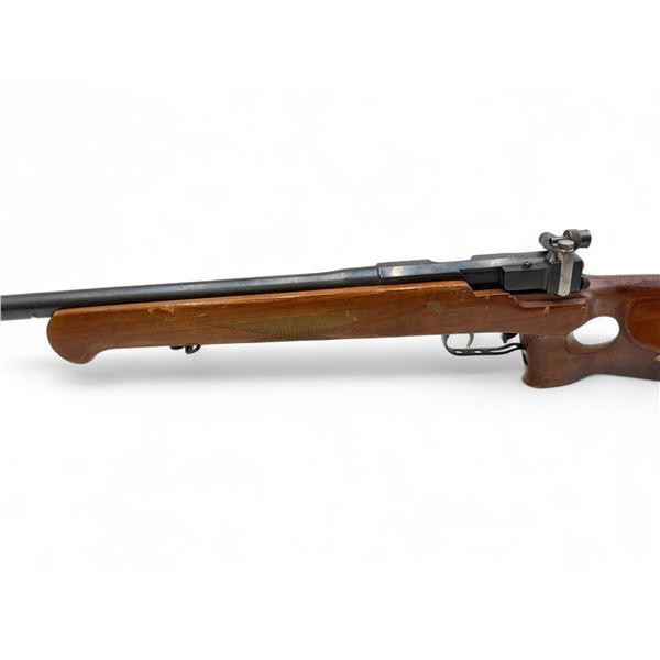 Russian Tula MU-12 Single Shot Olympic Rifle .22LR 29' Heavy Barrel Wood Thumbhole Stock. Target front sight; rear adjustable peep sight. Double set triggers; second trigger is VERY light. Barrel has weight taped near front. This is a non-restricted firearm.