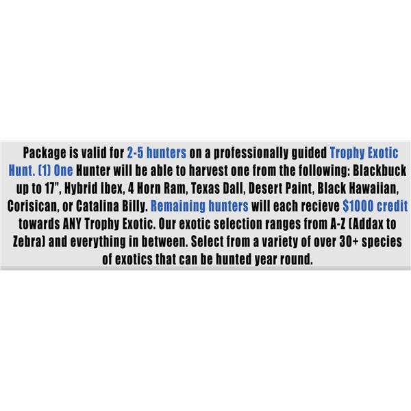 Texas Trophy Exotic Hunt - Hunt is valid for Trophy Exotic Hunt for 2-5 Hunters for Five Trophy Exotics for credit of $5,000 ($1000 credit per trophy exotic).