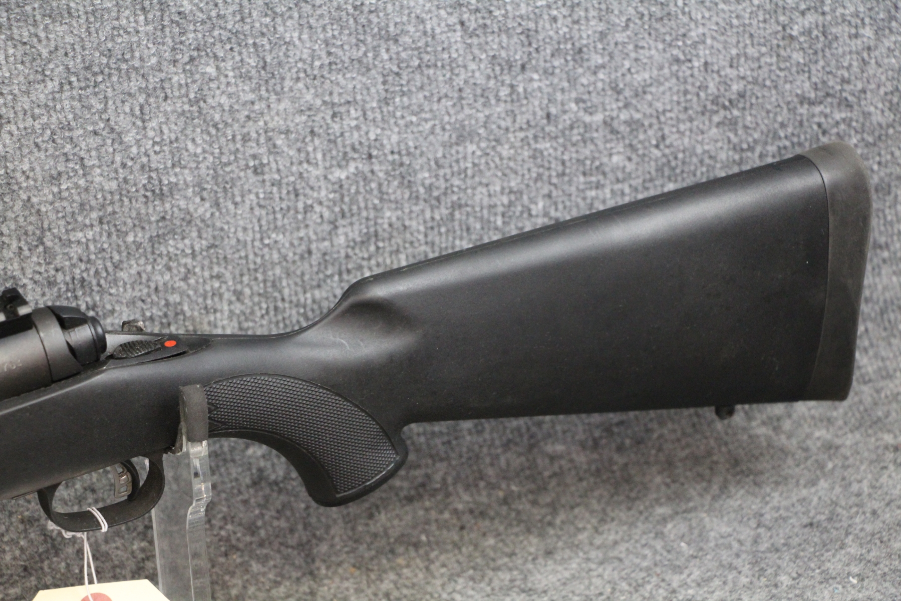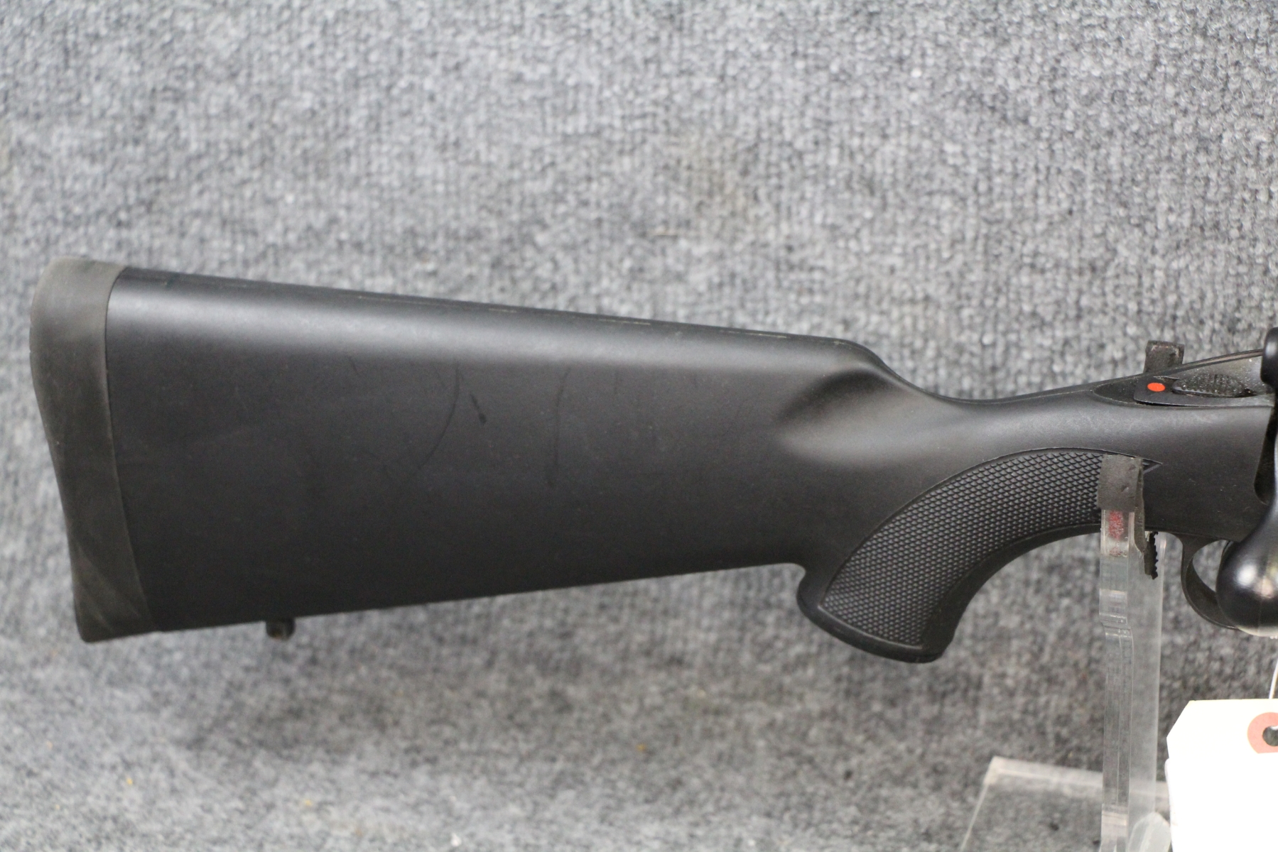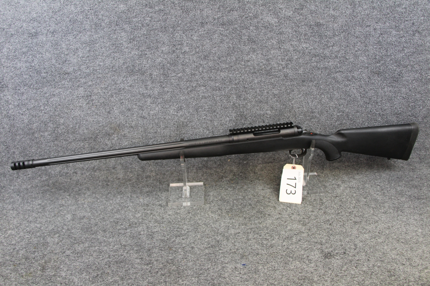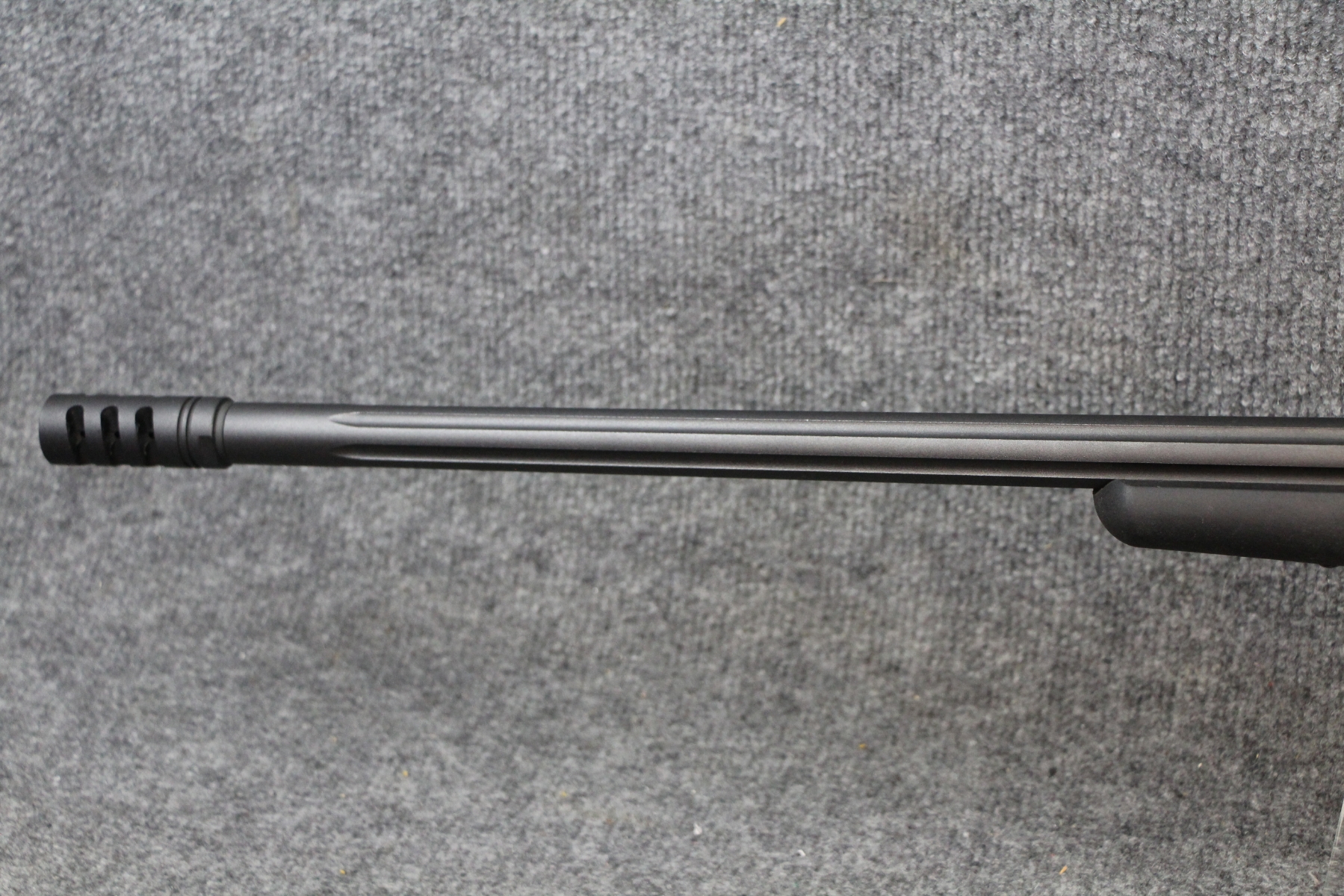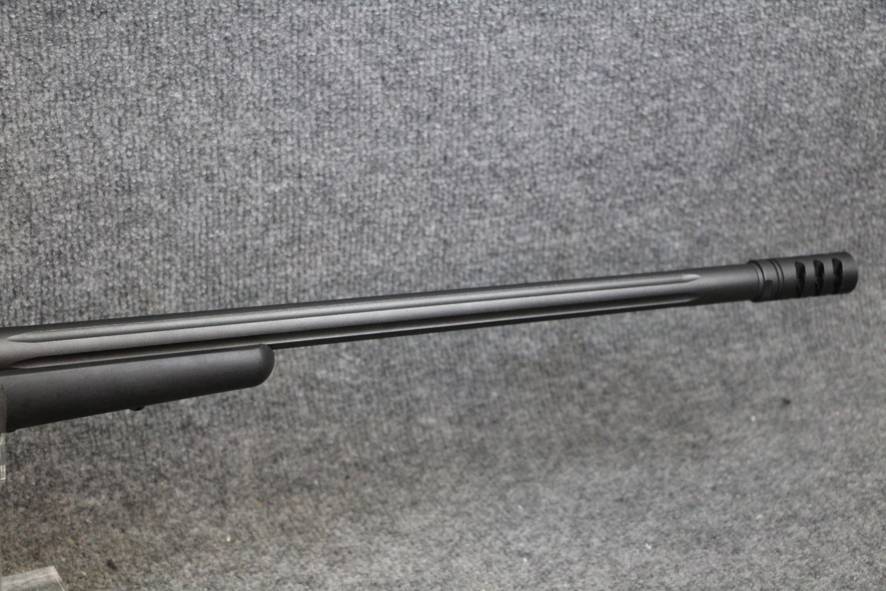 Only a small, shallow gouge near the trigger guard right side. Fluted, heavy, floating barrel with muzzle break. Matte finish. Composite stock. Box mag. Scope from this in lot #174