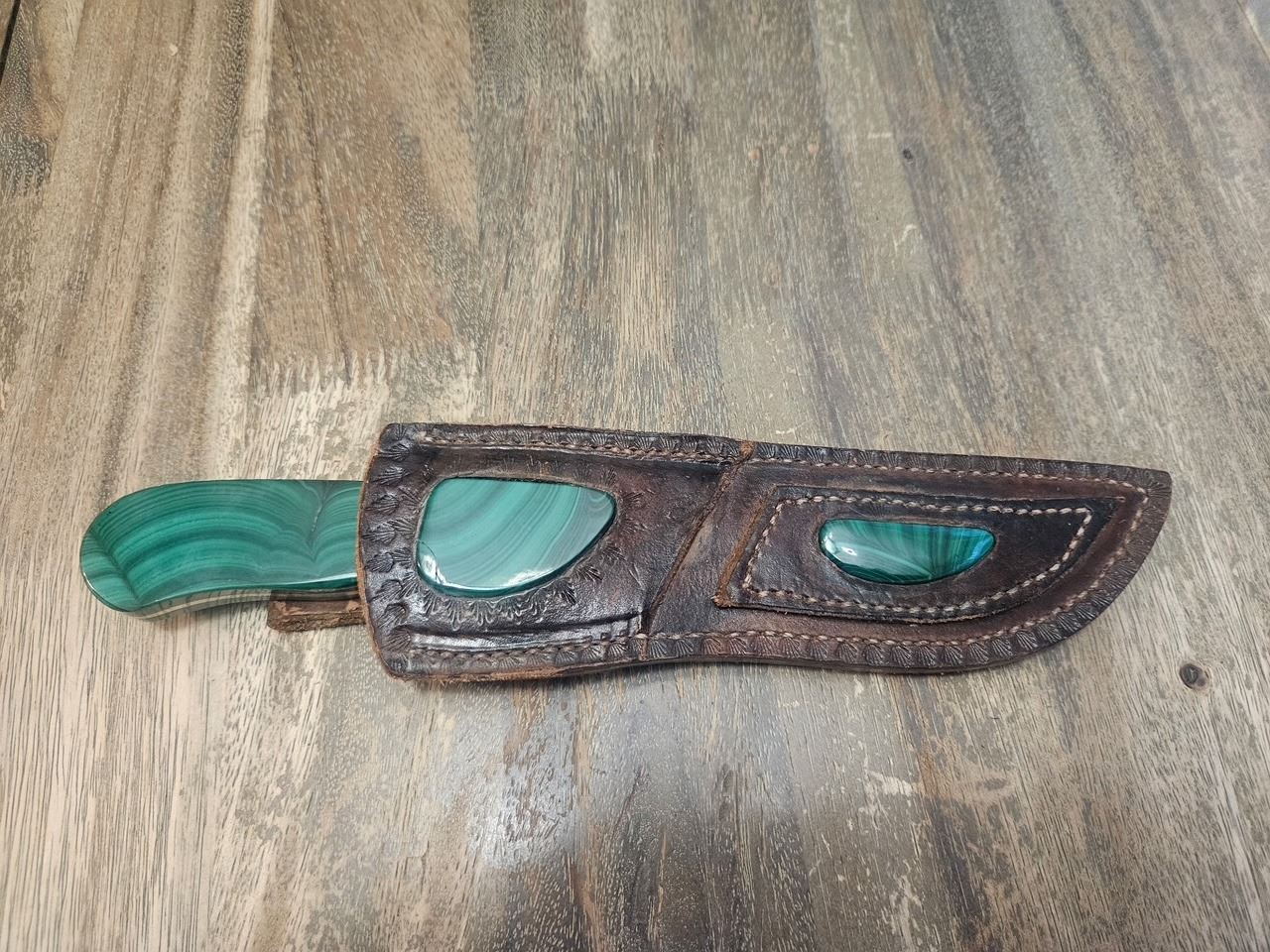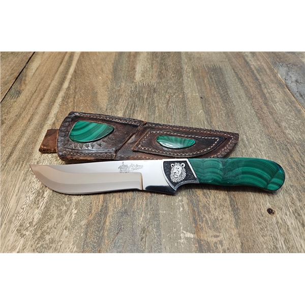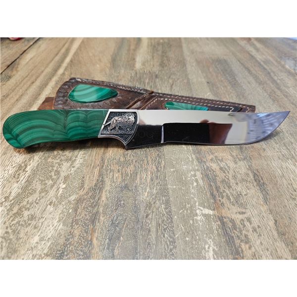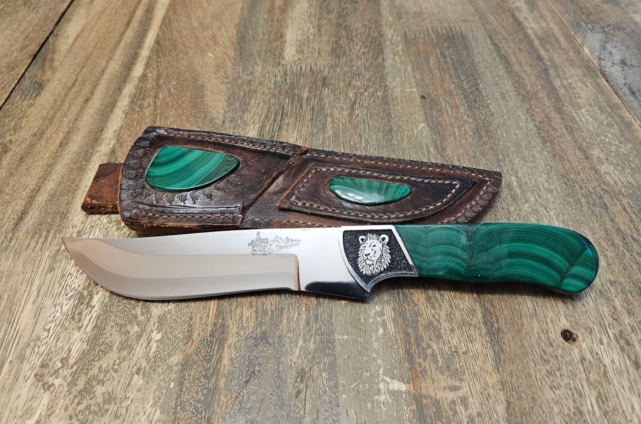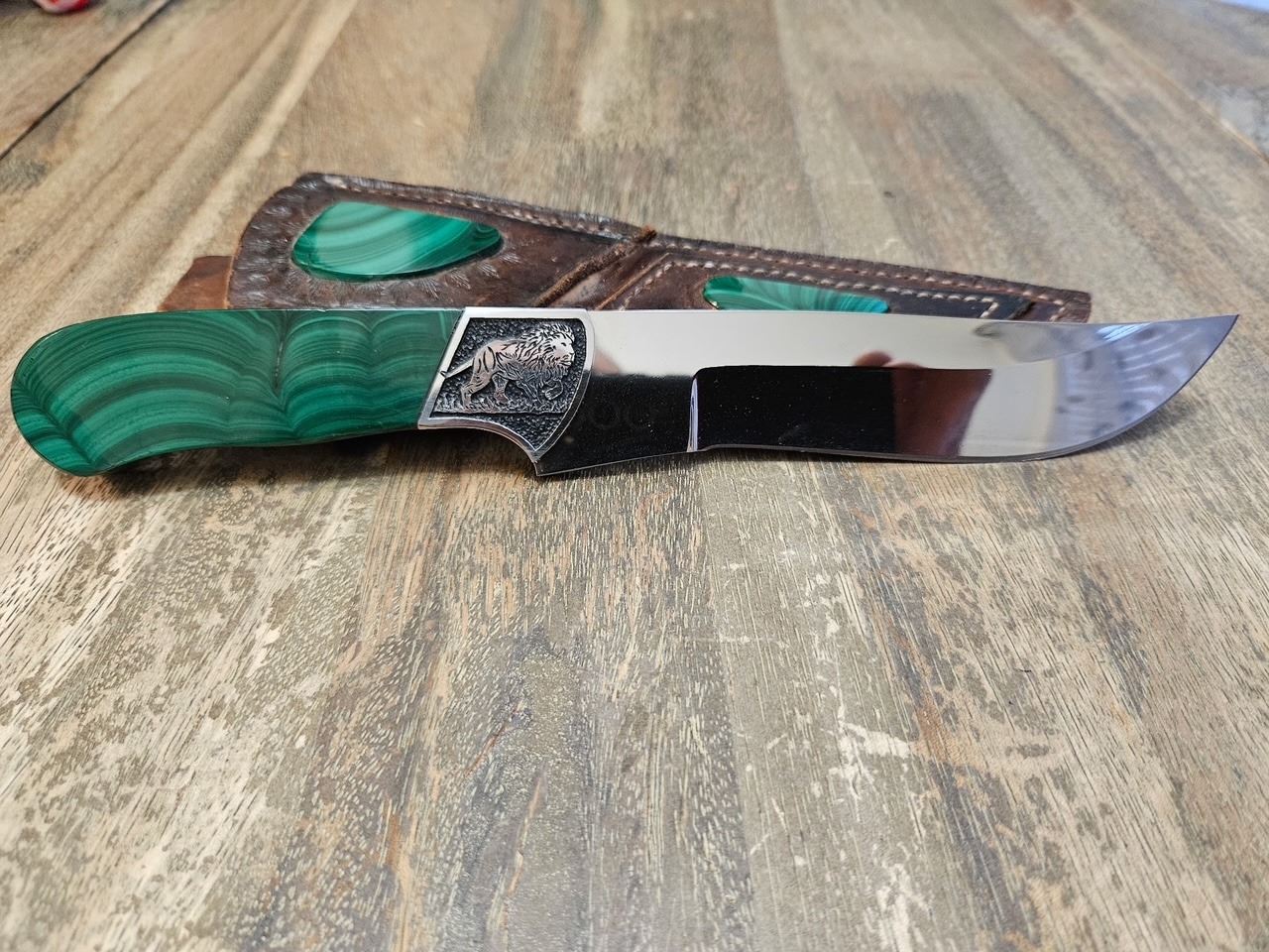 Hand made custom knife made from ATS 34 high carbon steel set at 61 Rockwell hardness and lion engraved into the bolster with African malachite stone on the handle. The sheath is made of leather and African malachite stone.