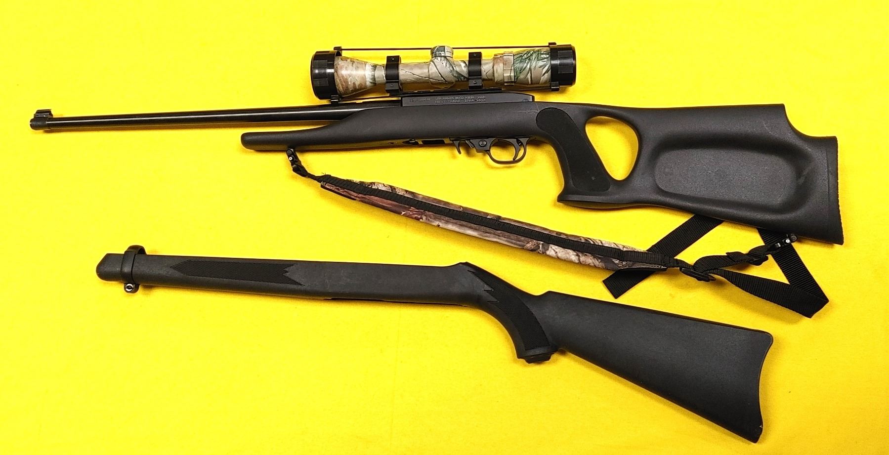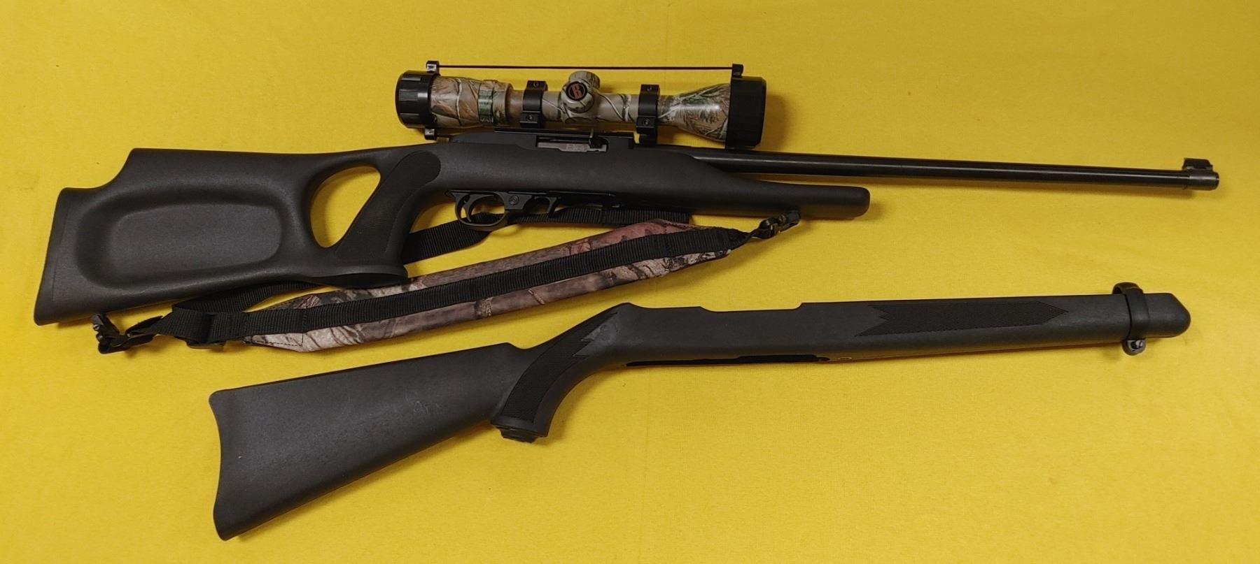 Lot 12 RUGER 10/22 50TH ANNIVERSERY 22LR 18.5in 10rnd W/CAMO SCOPE, AFTERMARKET, ORIGINAL STOCK AND BOX