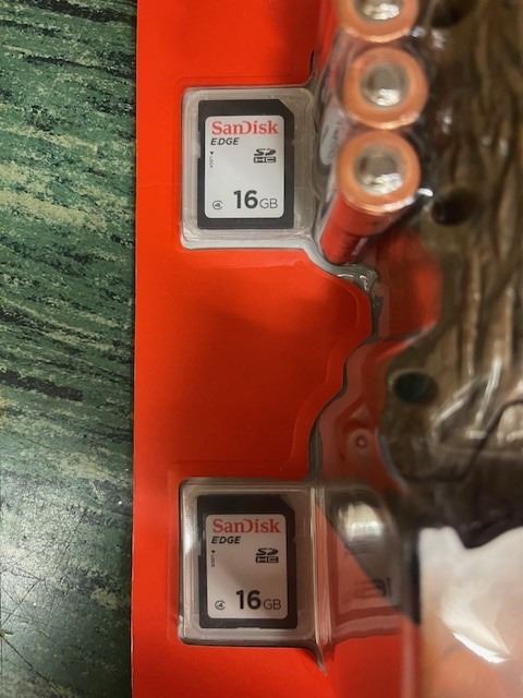 2 - 16gb Scan Disk memory cards and 8 AA batteries included