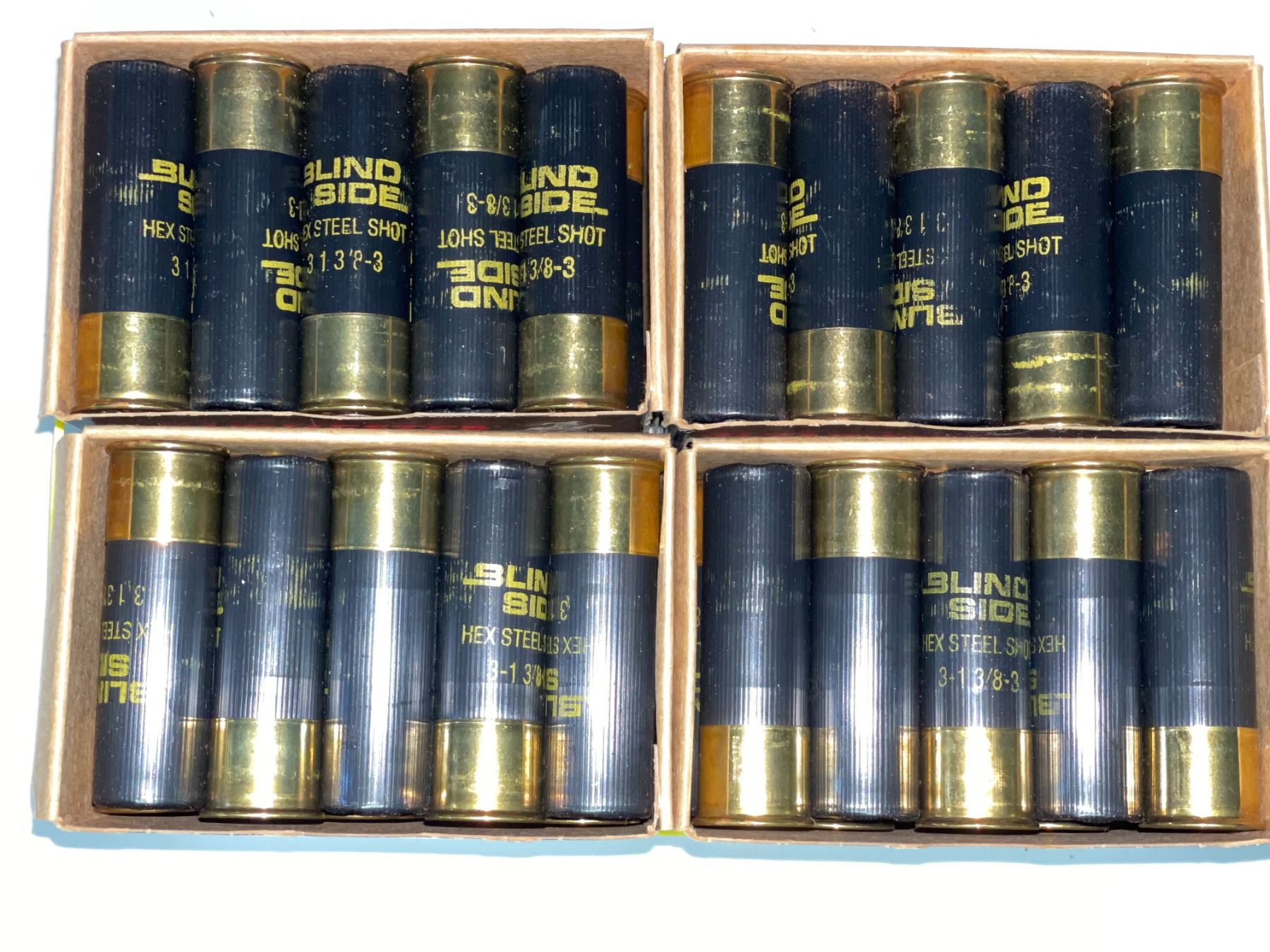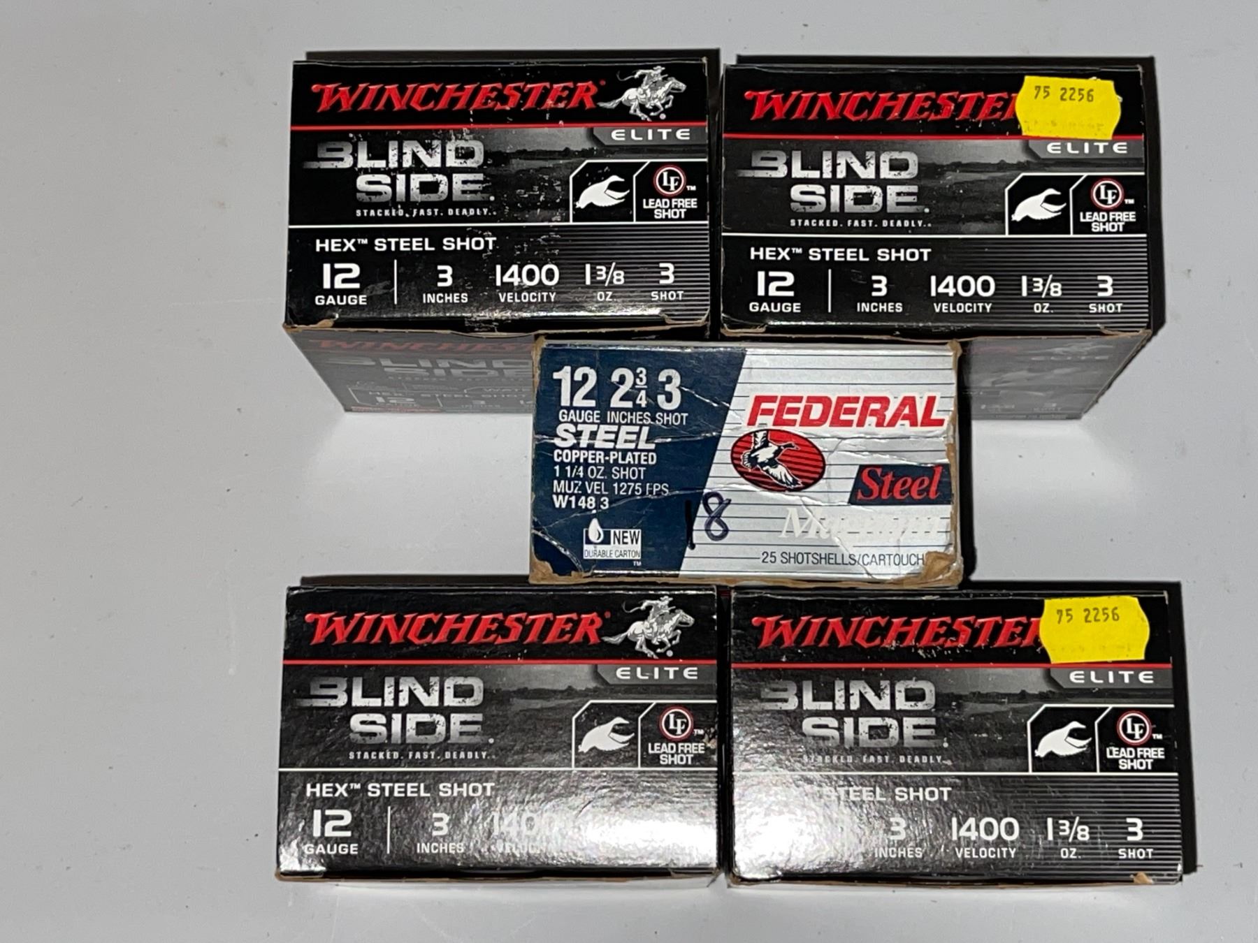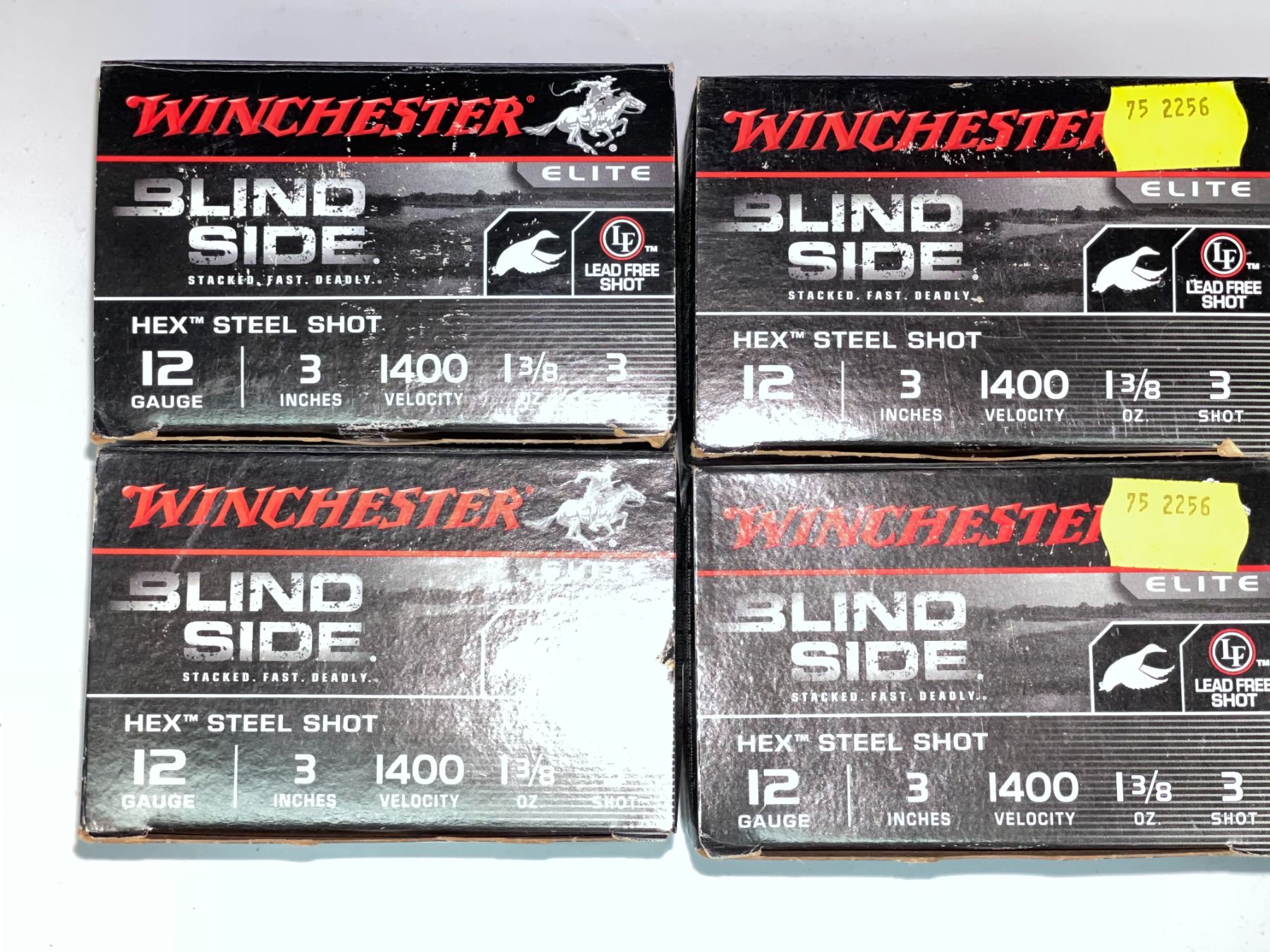 4 boxes of 25 each Winchester Blind Side Elite 12ga 3in 1 3/8oz #3 Hex Steel Shot shells