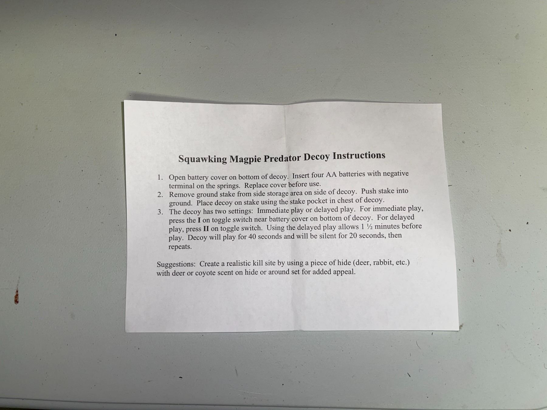 - The decoy squaks for seconds and is silent for 20 seconds, then repeats the sequence.