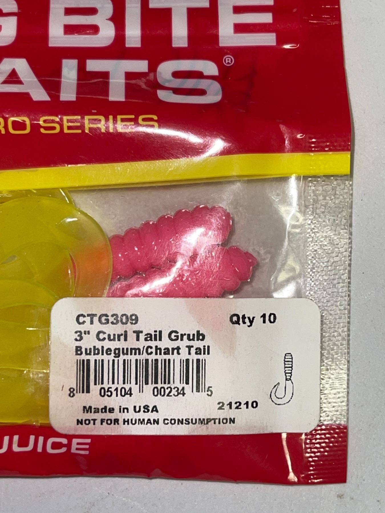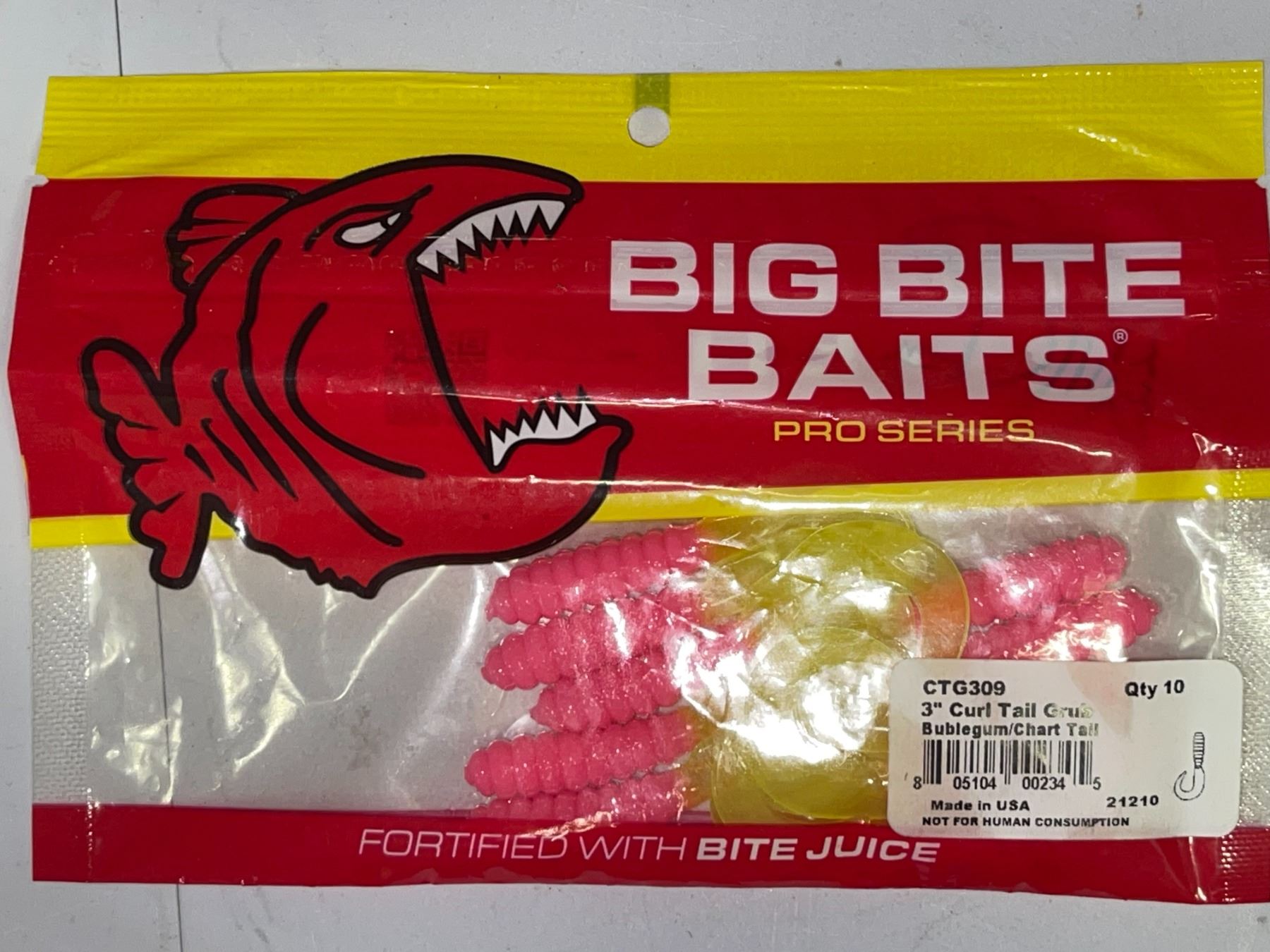 - 1 pk BIG BITE BAITS 3in Bubblegum Chartreuse tail Curl Tail grubs 10pk