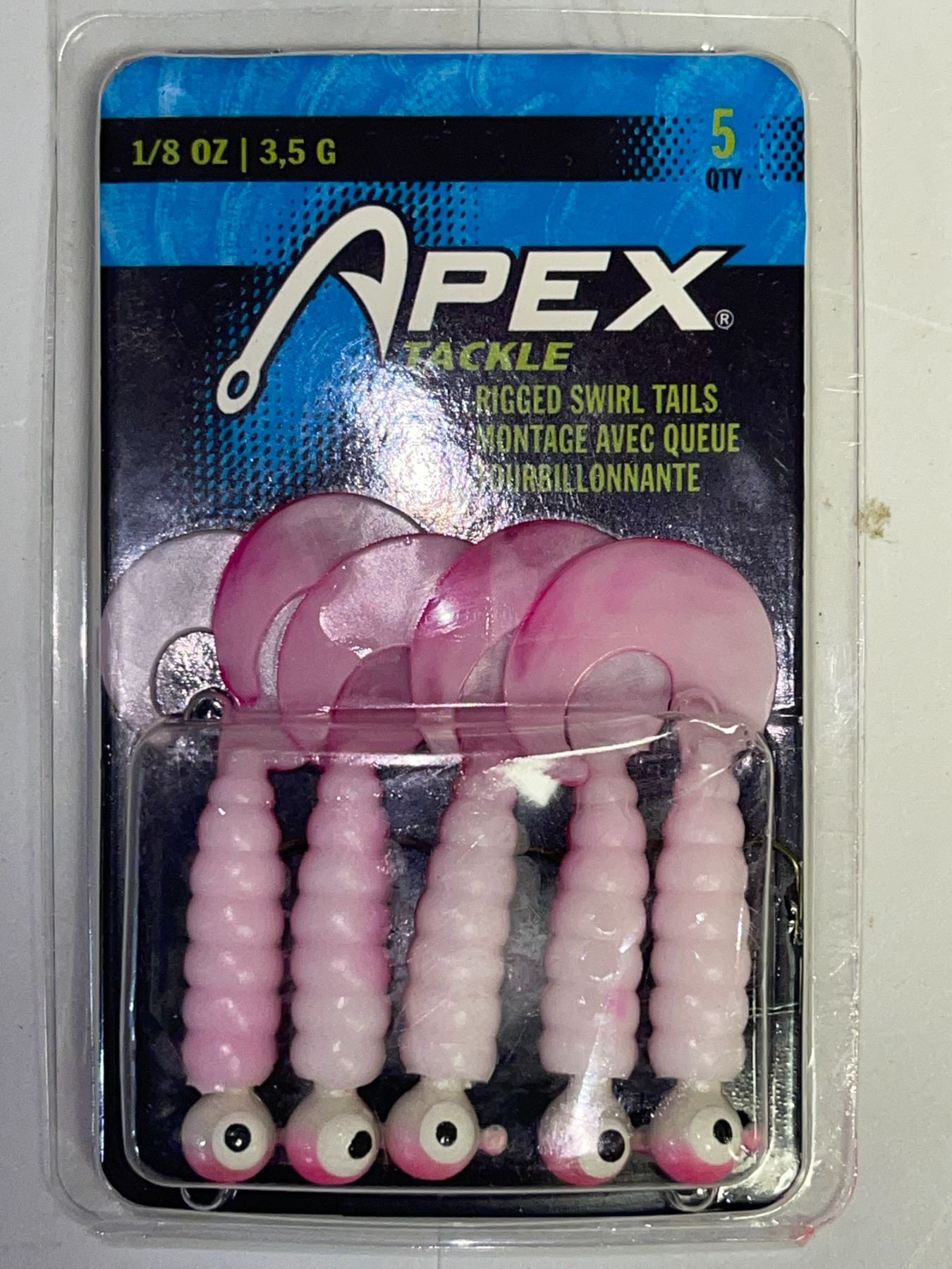 - 1 pk APEX TACKLE 1/8oz Rigged Swirl Tails 5pk
